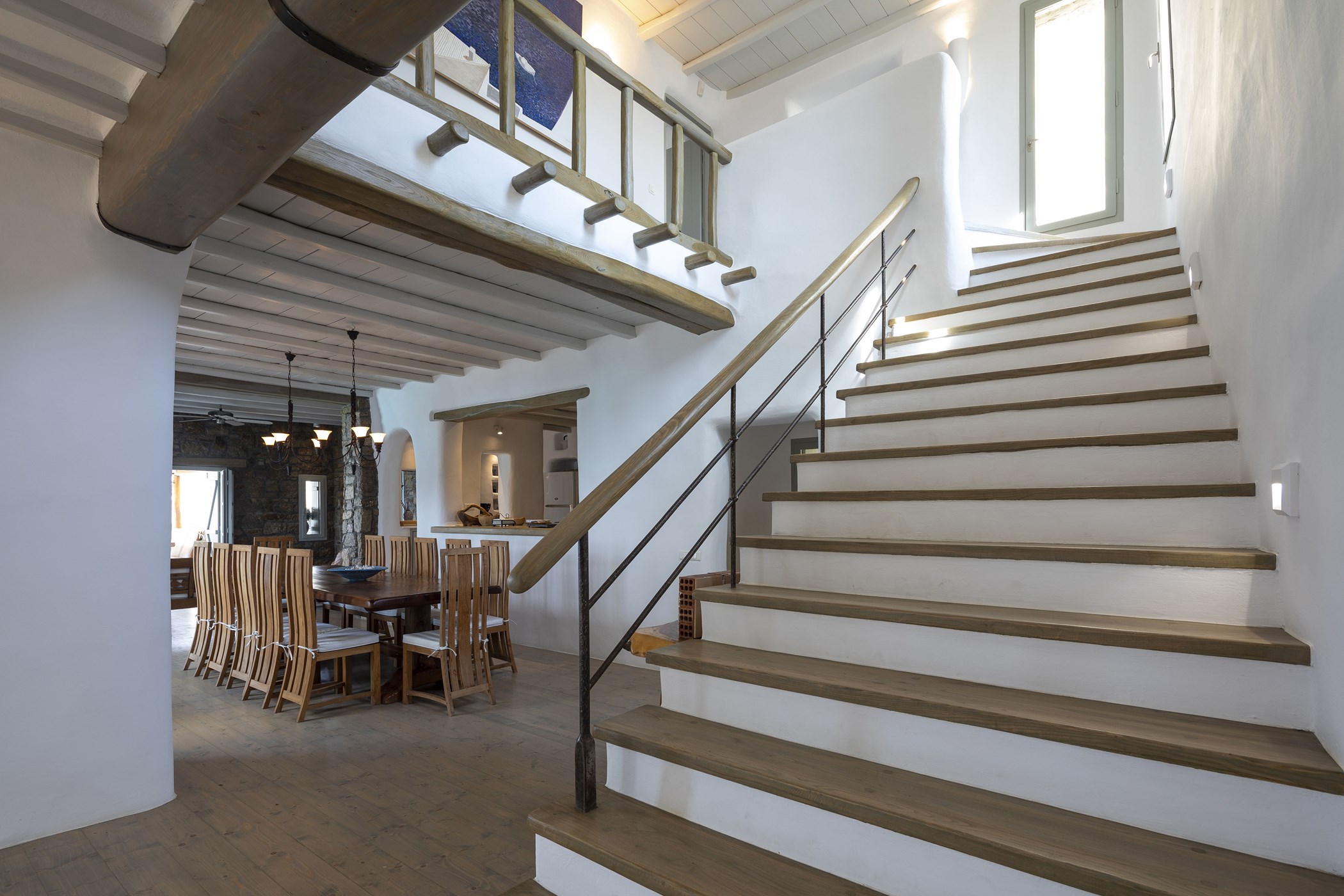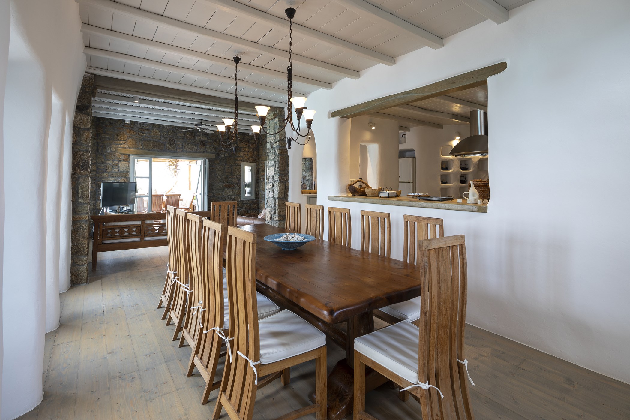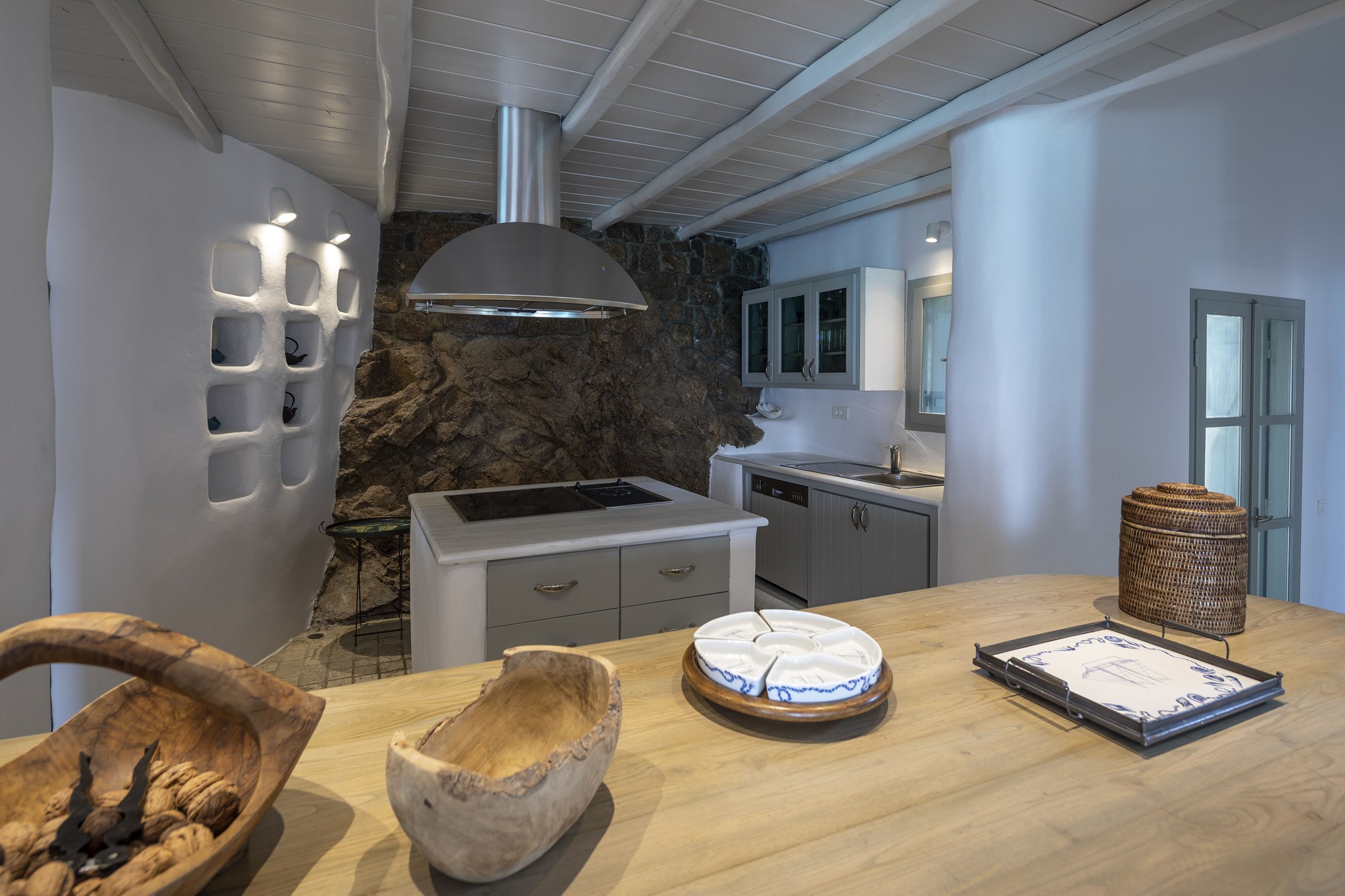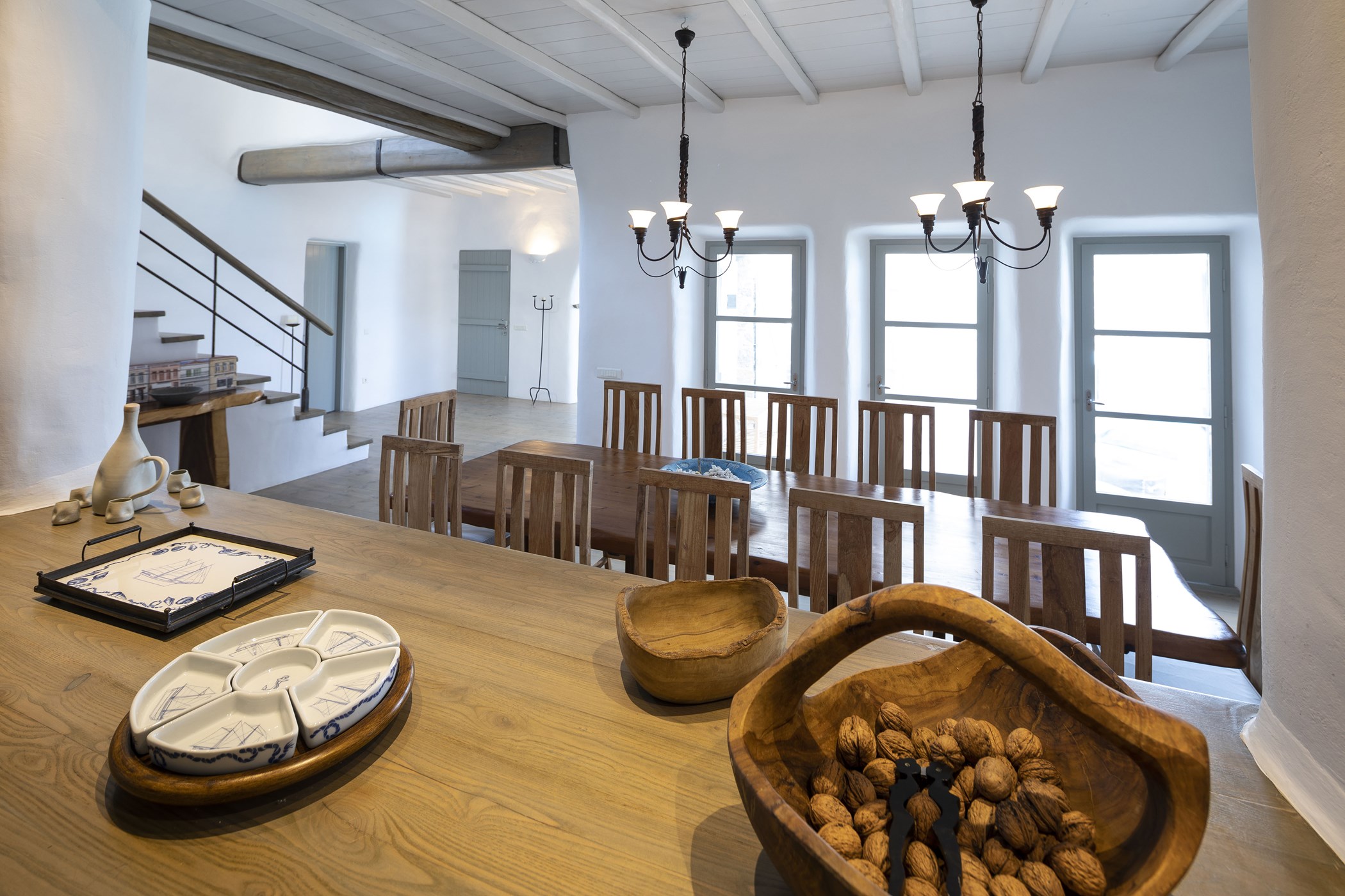 The main attraction however is the outdoor area which has been beautifully designed, boasting several large sitting and dining spaces, a BBQ, a majestic pool with a diving board, comfortable sunbeds to witness the magic of the sunset unfolding over the Aegean Sea.
