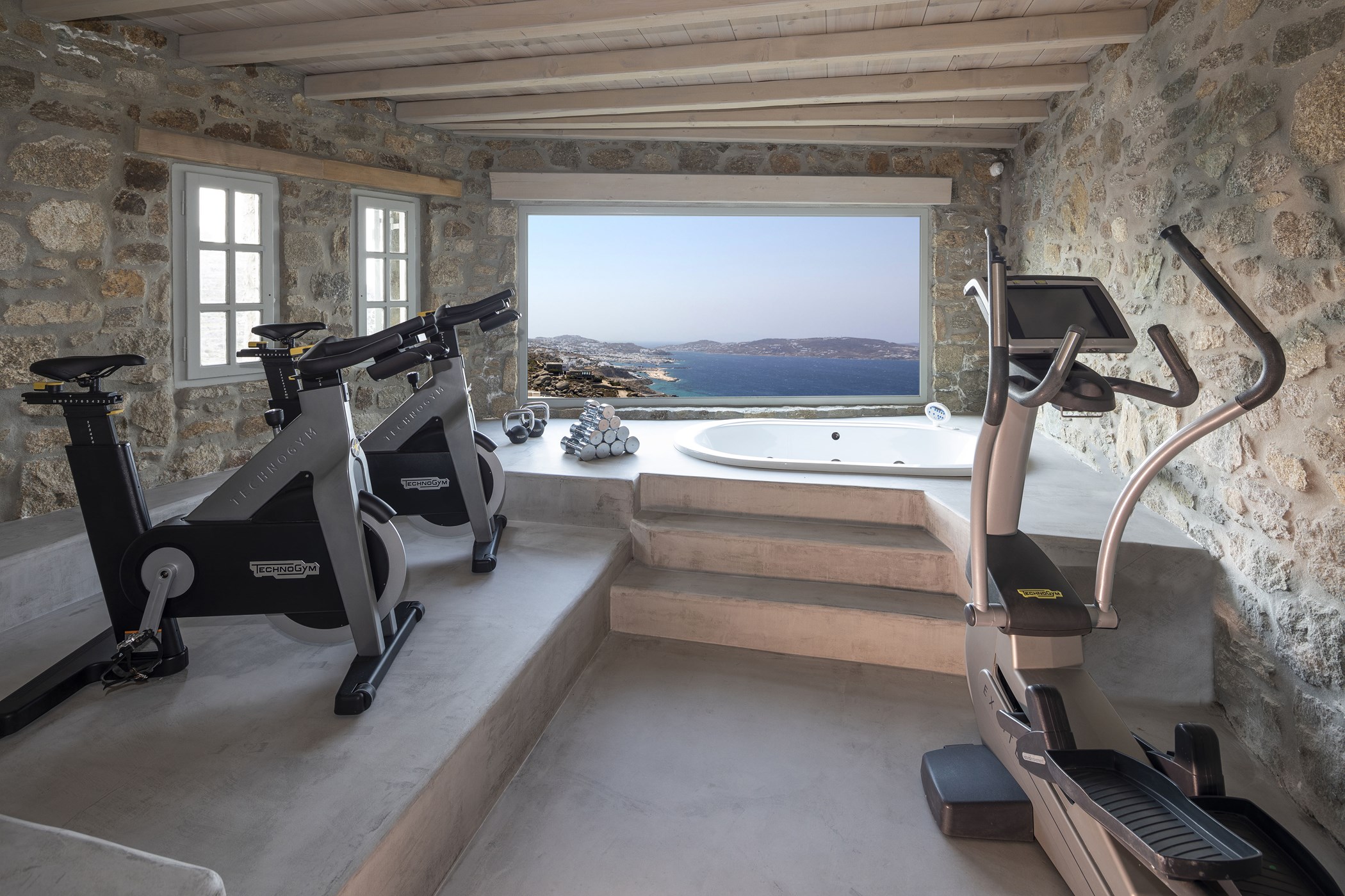 The upper floor displays a tremendously beautiful three master bedrooms with private veranda, ensuite bathroom and breathtaking sunset sea views. Guest will love the private health area furnished with Technogym equipment and Jacuzzi that ensure limitless moments of bliss. The entrance level of this luxury home has a large living room, a dining room that sits 14 and 8 outside, a fully equipped kitchen with modern appliances and a single bedroom with twin bed.