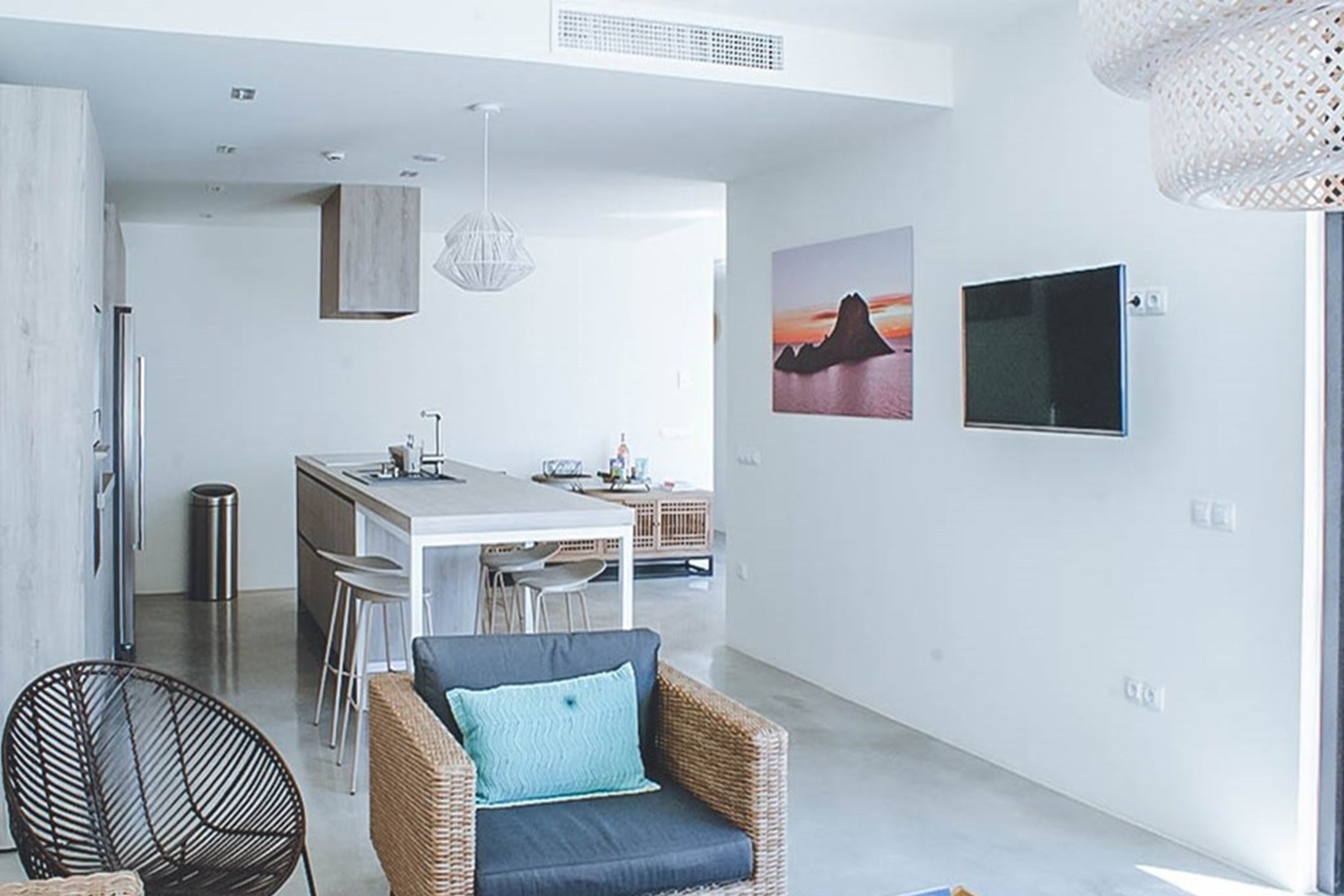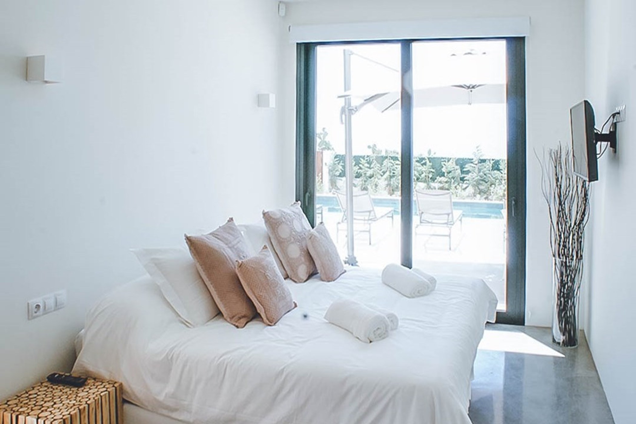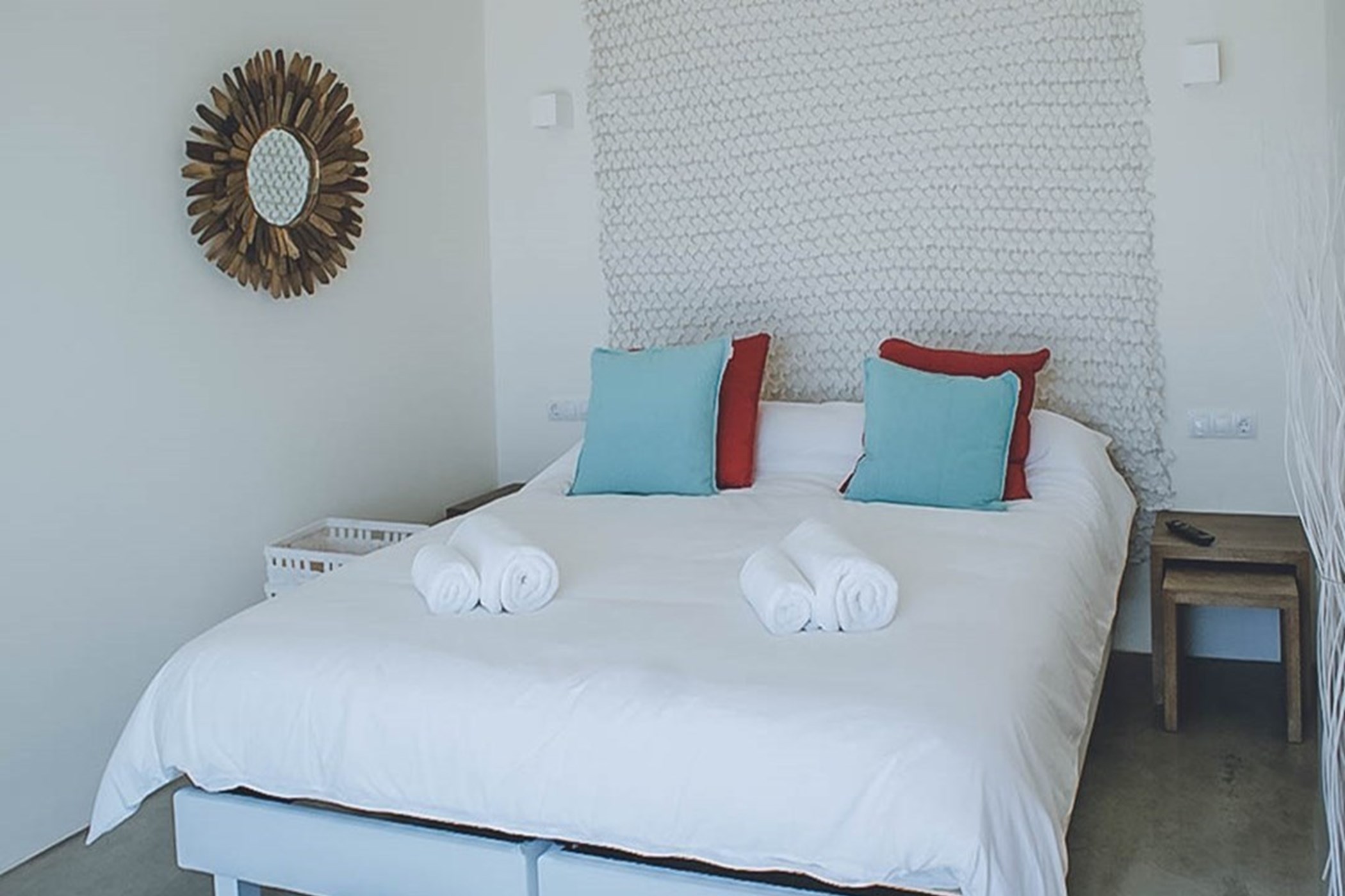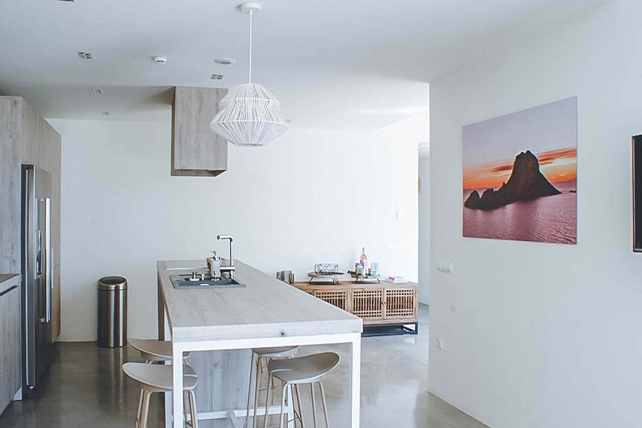 This stunning home comprises of white and contrasting typical Ibicencan stone plane walls on the outside, and throughout perfectly blends a winning combination of traditional touches with minimalistic style. Inside this modern, contemporary abode you can relax in the open-plan lounge area with comfortable seating, a fully equipped beach styled kitchen with all the modern appliances you would expect . There are four beautifully furnished double bedrooms all with en-suite bathrooms and ample wardrobe space, sleeping 8 guests in comfort and privacy.