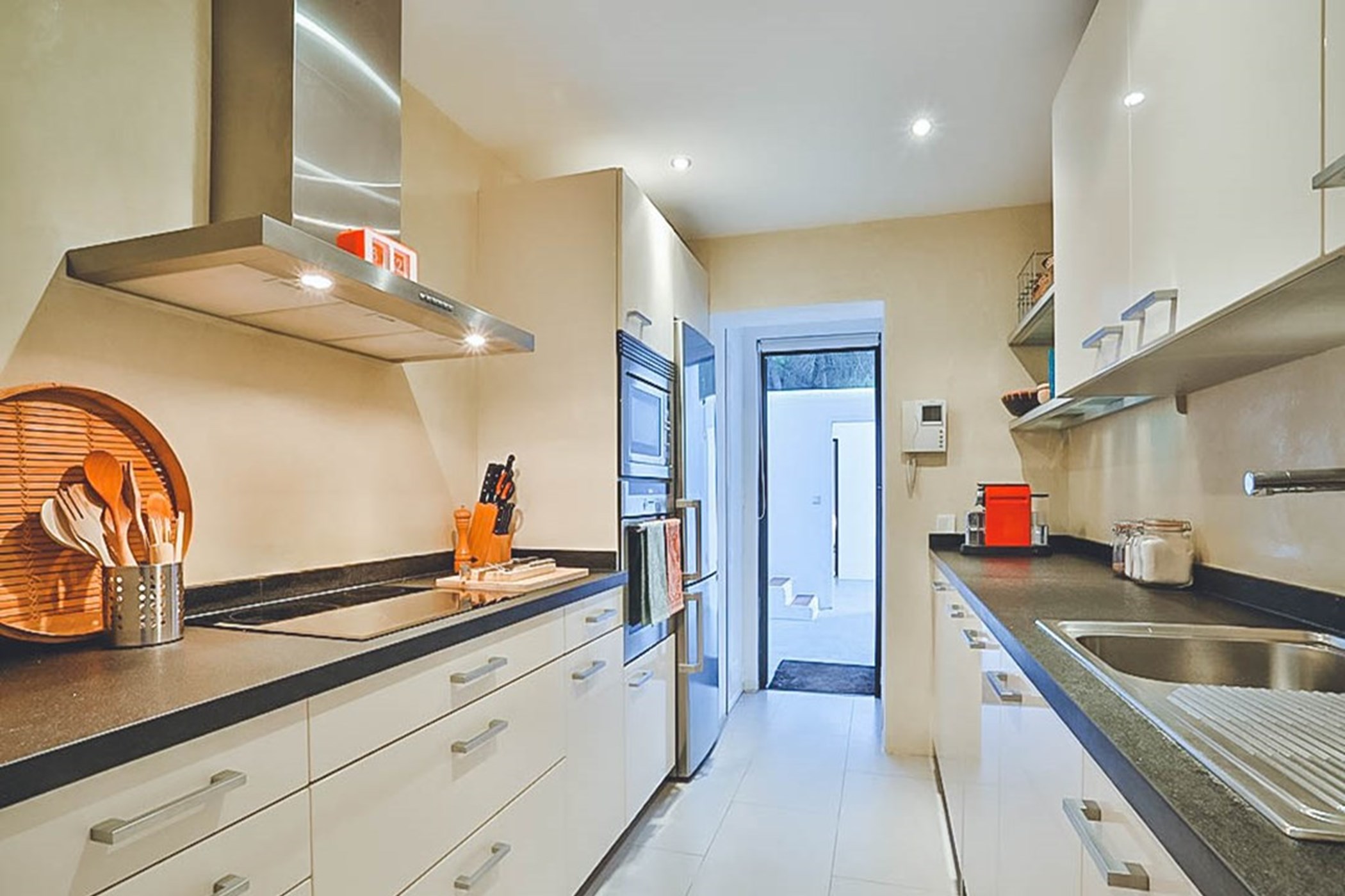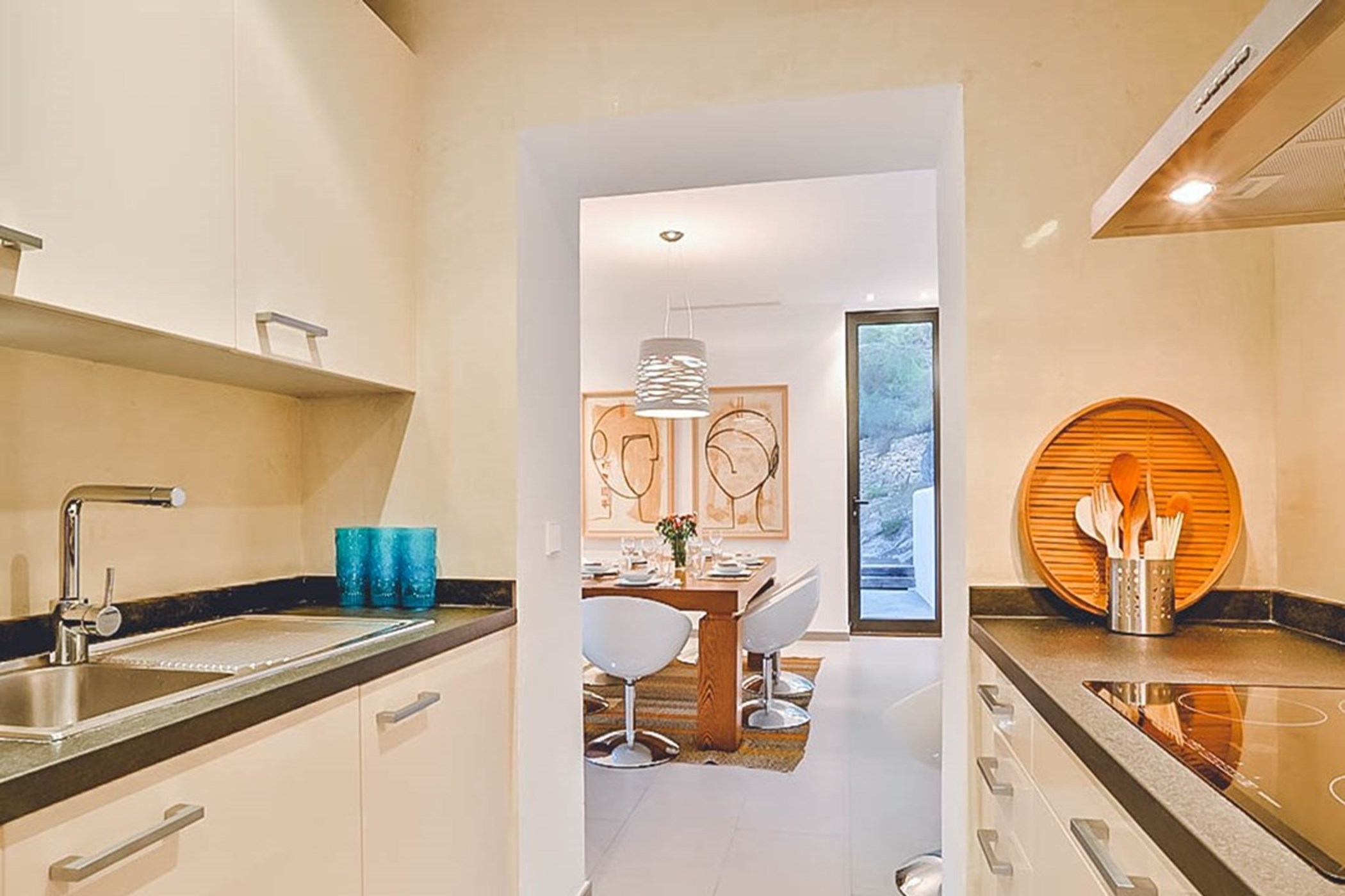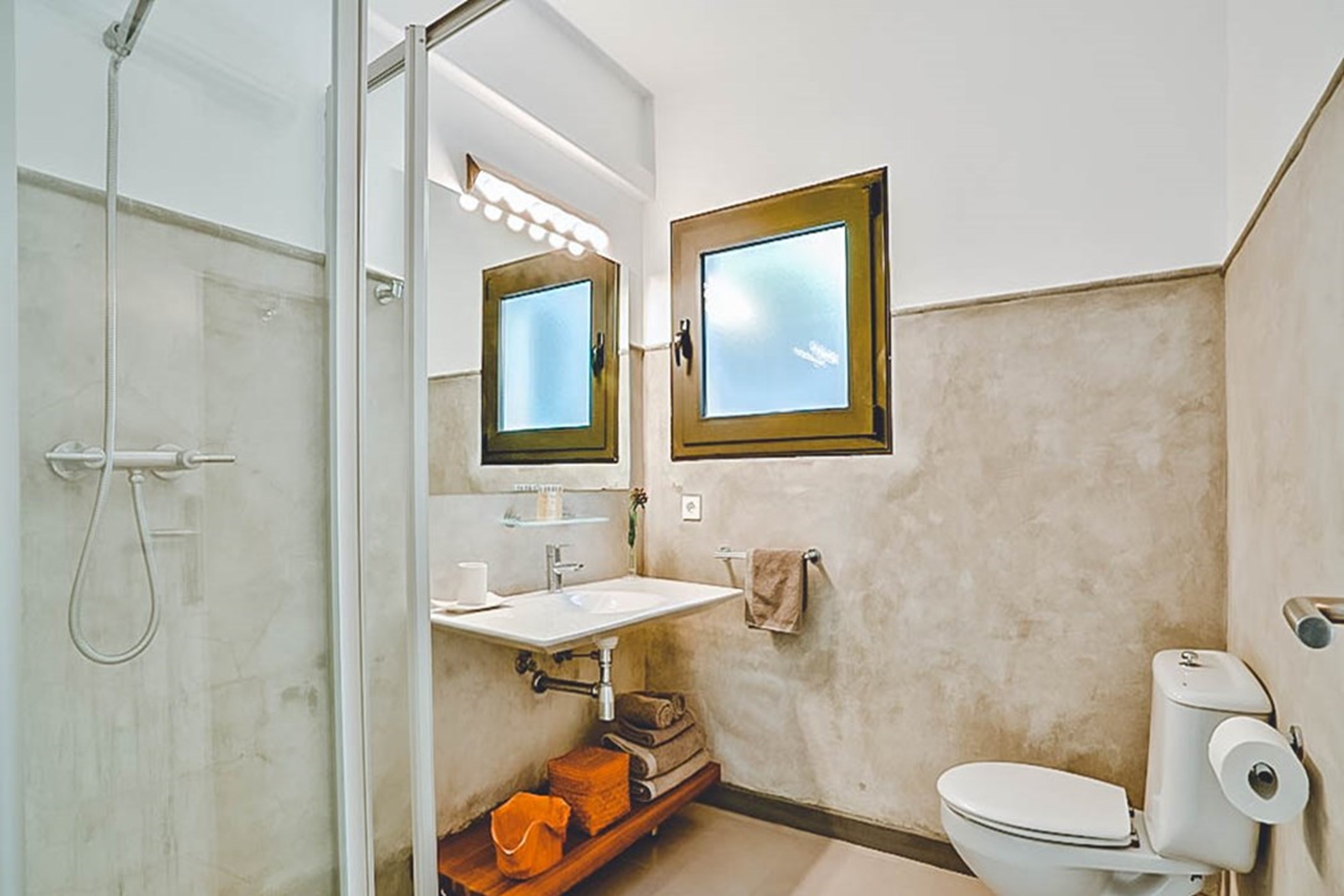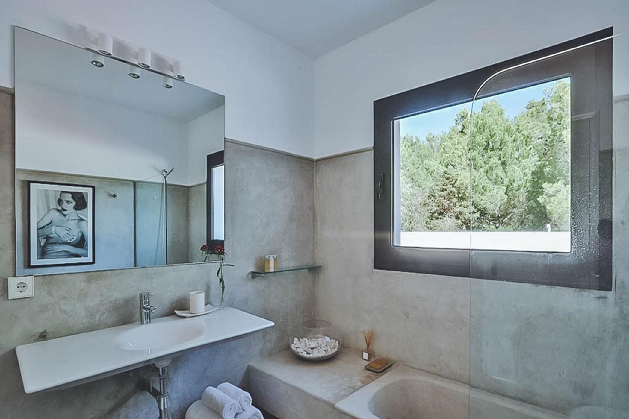 The upper floor is dedicated to an expansive and supremely stylish living room, complete with a private rooftop terrace that offers panoramic sea views—truly idyllic. A further en-suite bathroom features a polished cement stone bathtub, adding to the villa's luxurious atmosphere. Can Beth also includes a fully equipped, elegant kitchen, a dining area, and multiple spaces where guests can recline, relax, and rejuvenate.