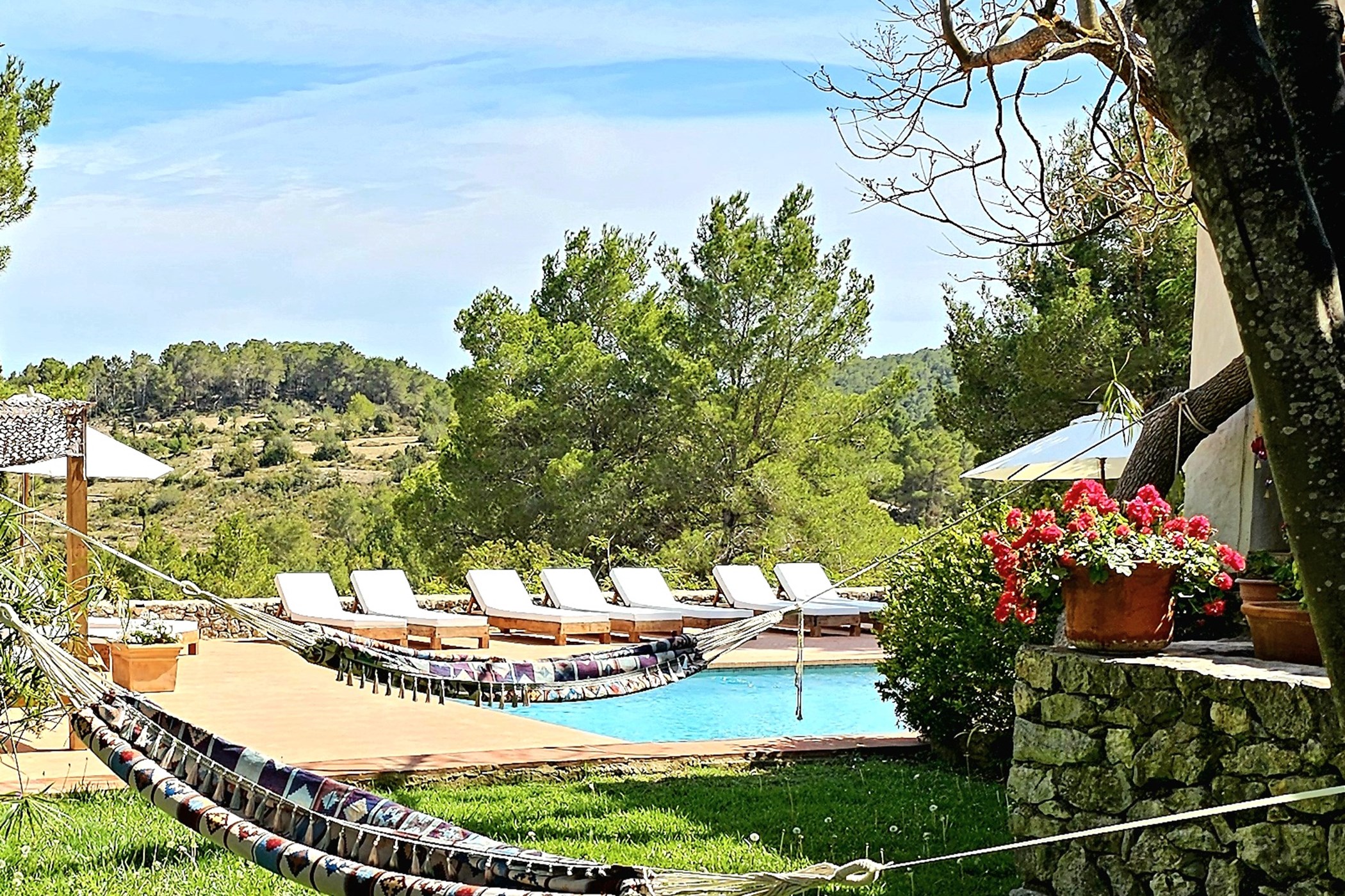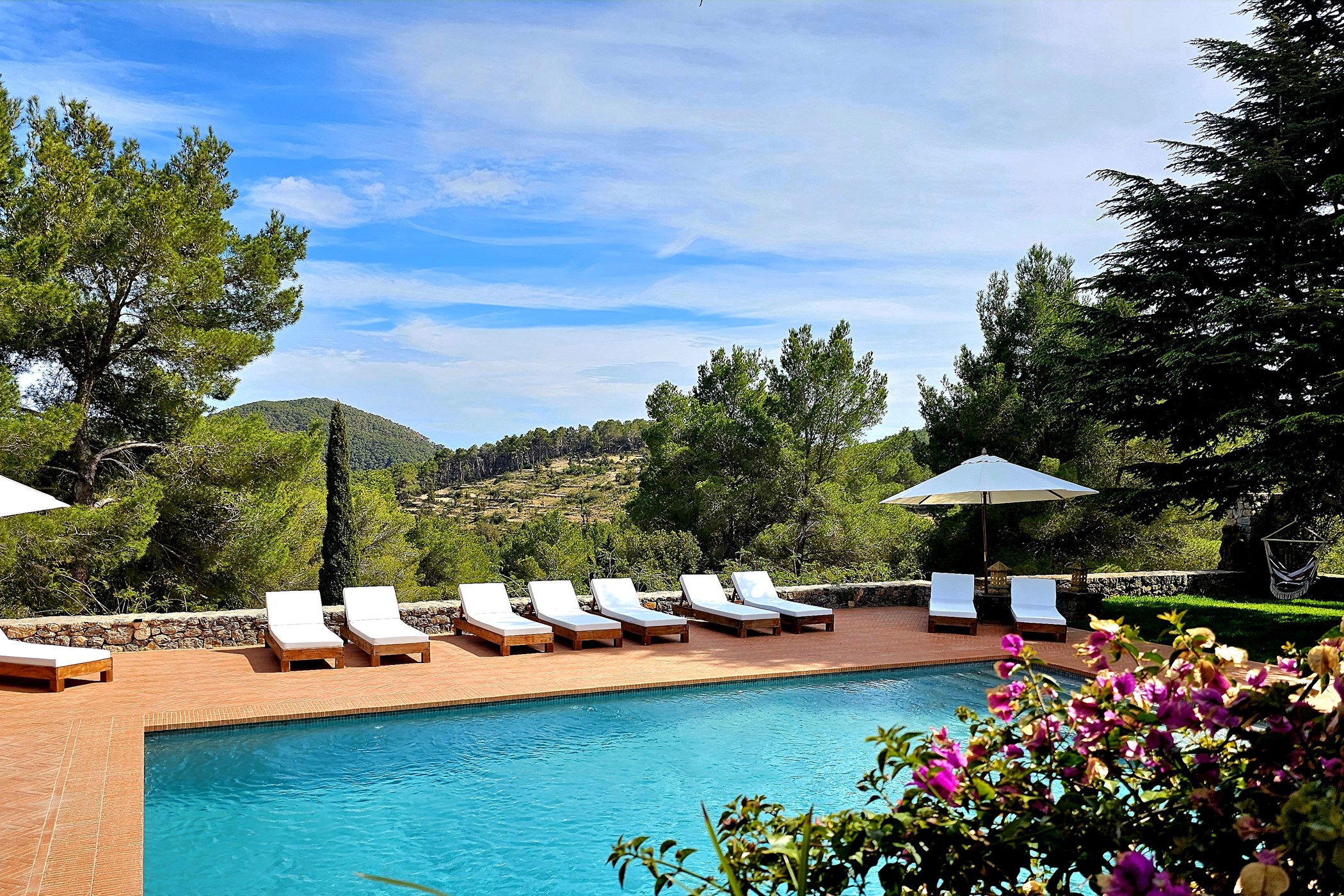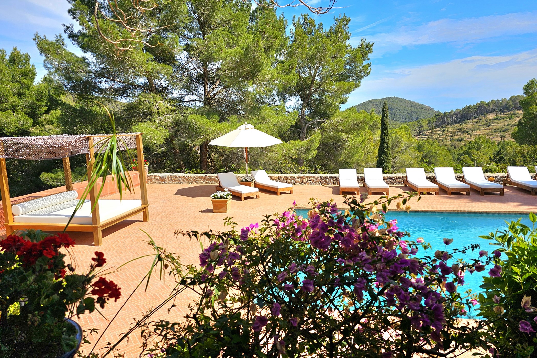 Nestled in a charming oasis of tranquility just minutes away from Ibiza town, this sumptuous 6-bedroom villa offers a serene escape surrounded by rolling hills and verdant vegetation. The property boasts a striking contrast between its vast azure pool and the lush greenery enveloping it, creating a picturesque and inviting atmosphere.