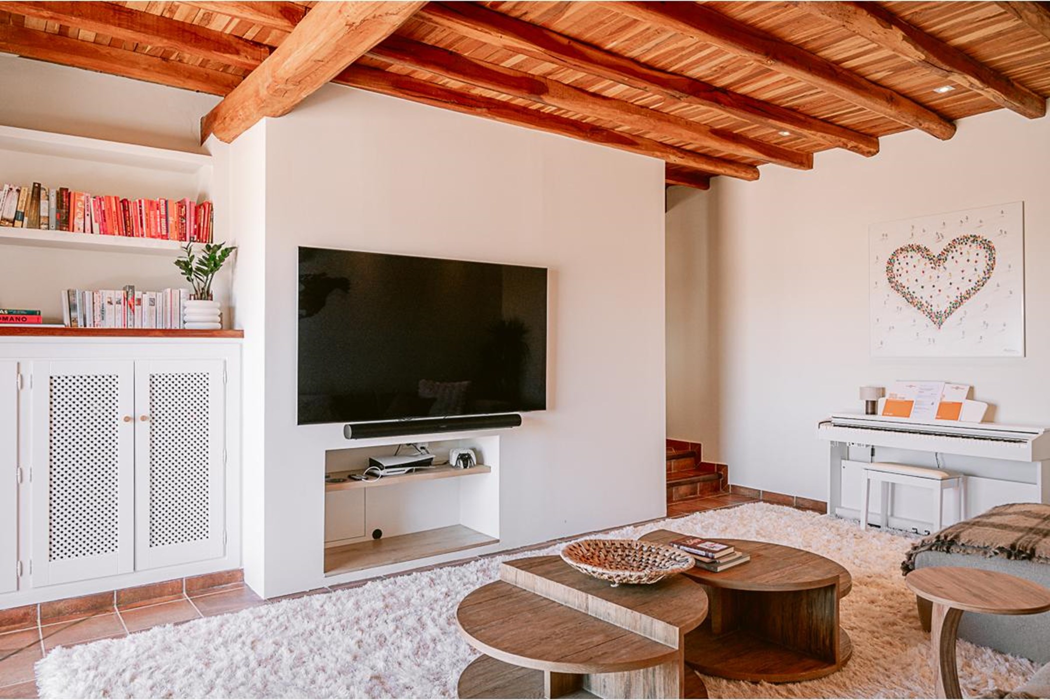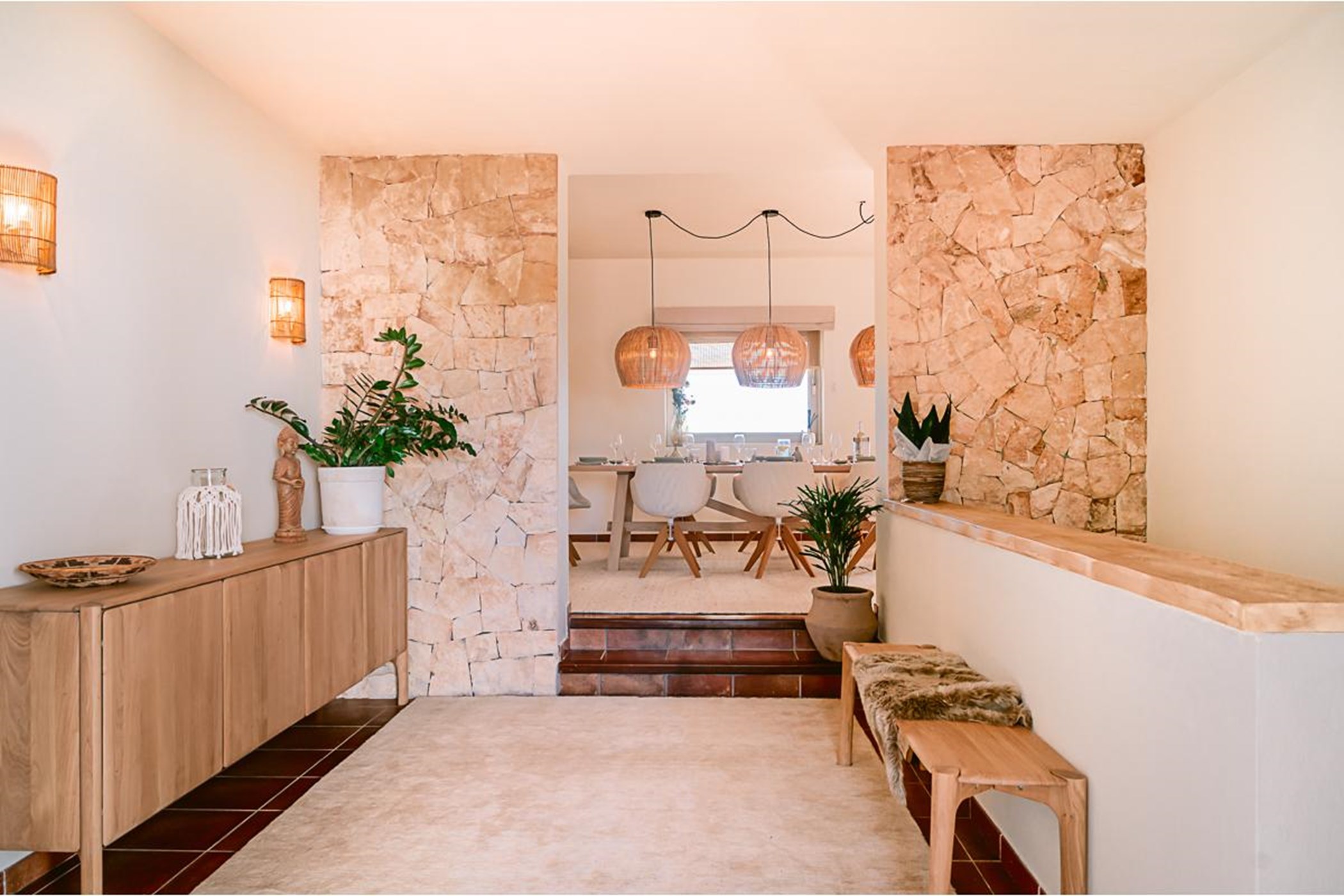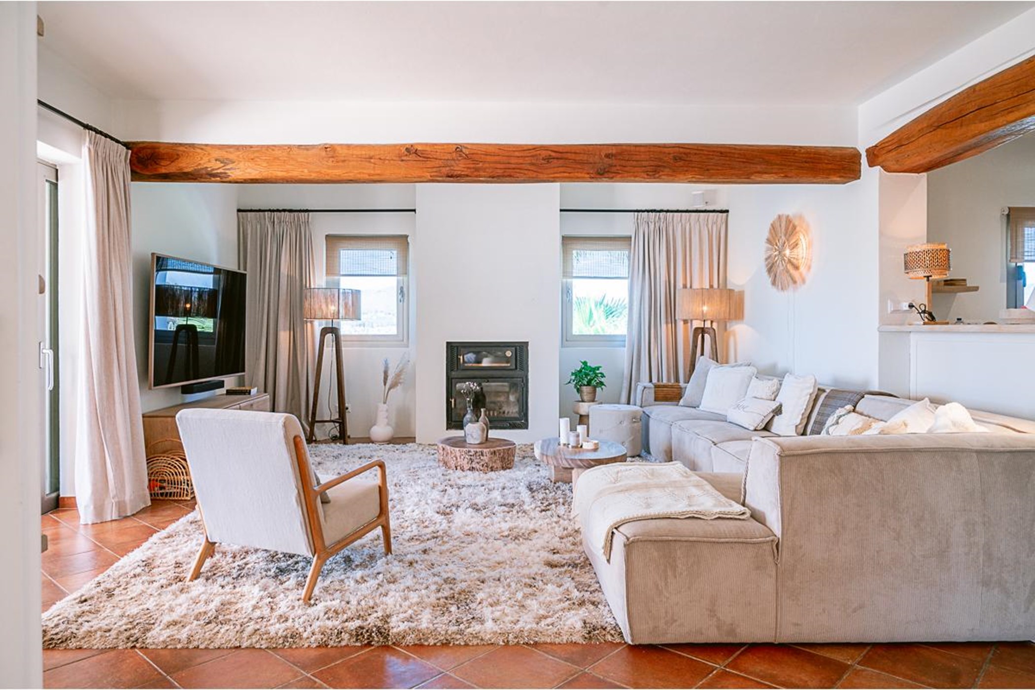 The main house has a beautiful stone walled lounge and stylish terracotta-tiled flooring, which lead through to the open plan dining room and fully equipped kitchen all with direct access onto the main outdoor terrace. There is a second dining area and dedicated TV area.