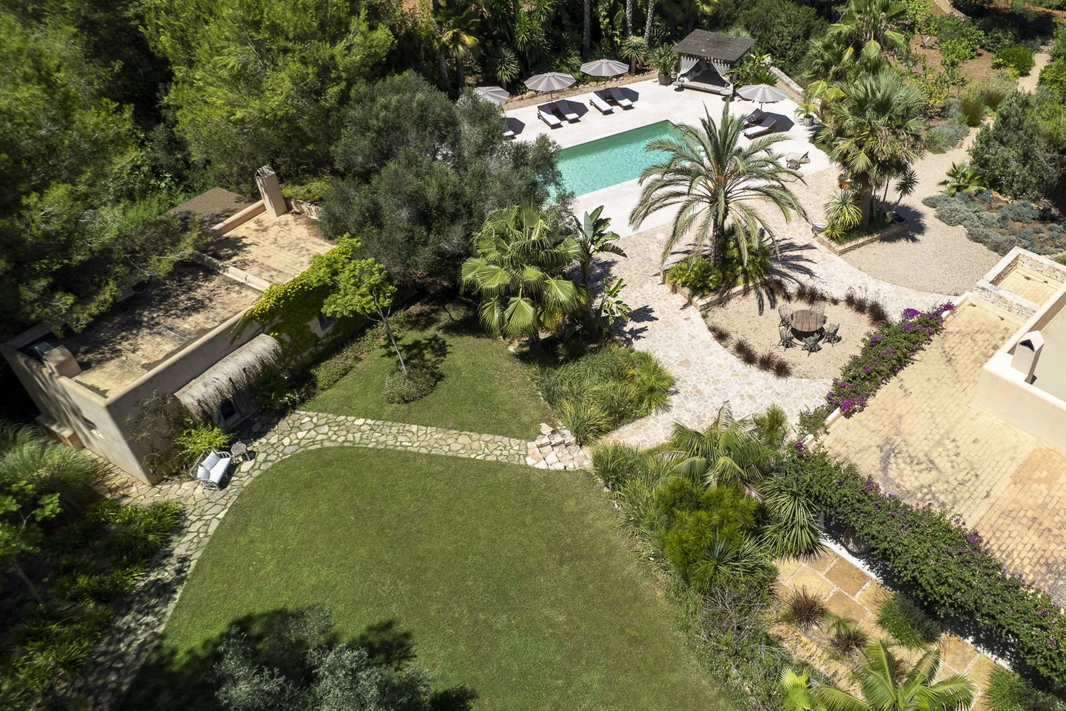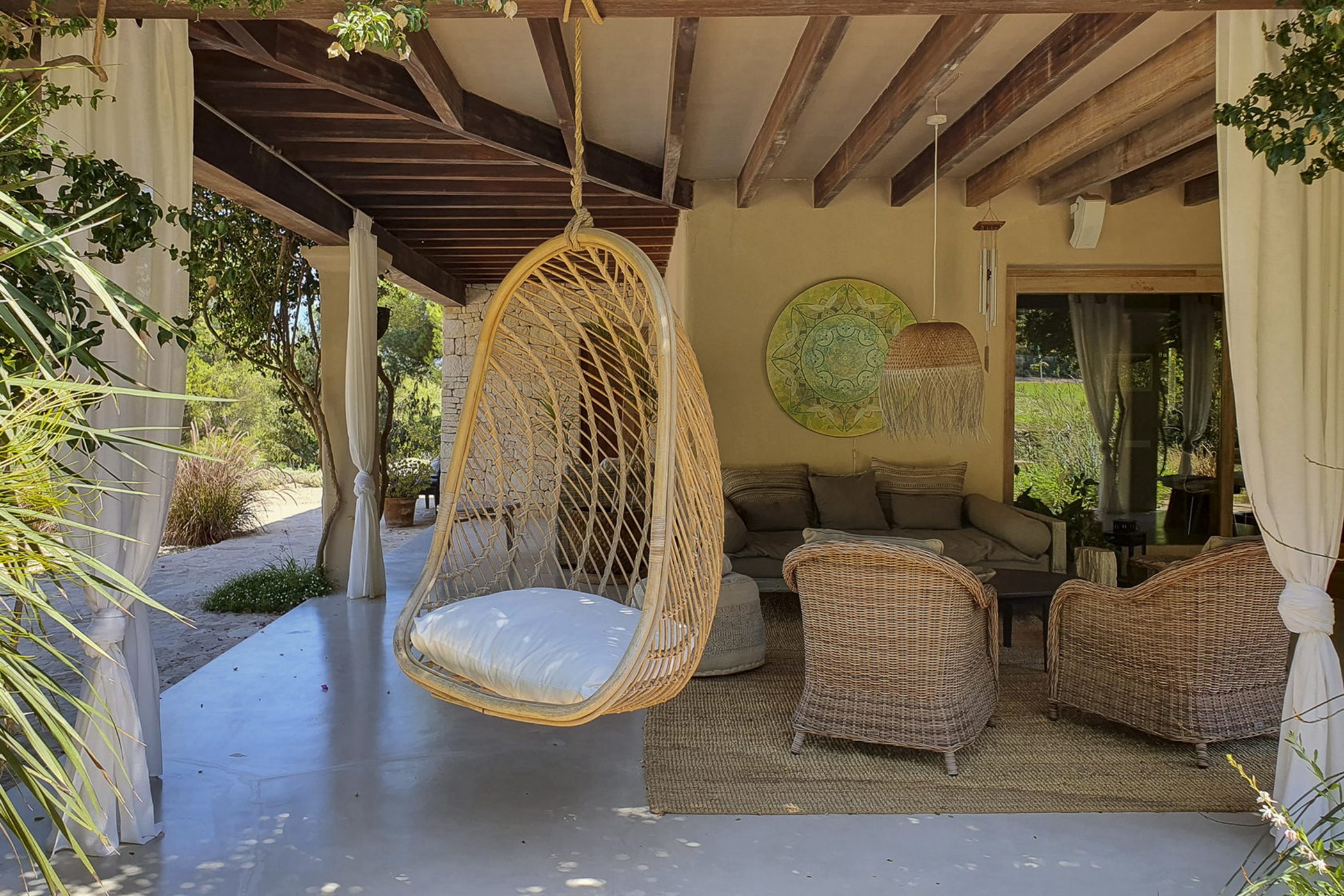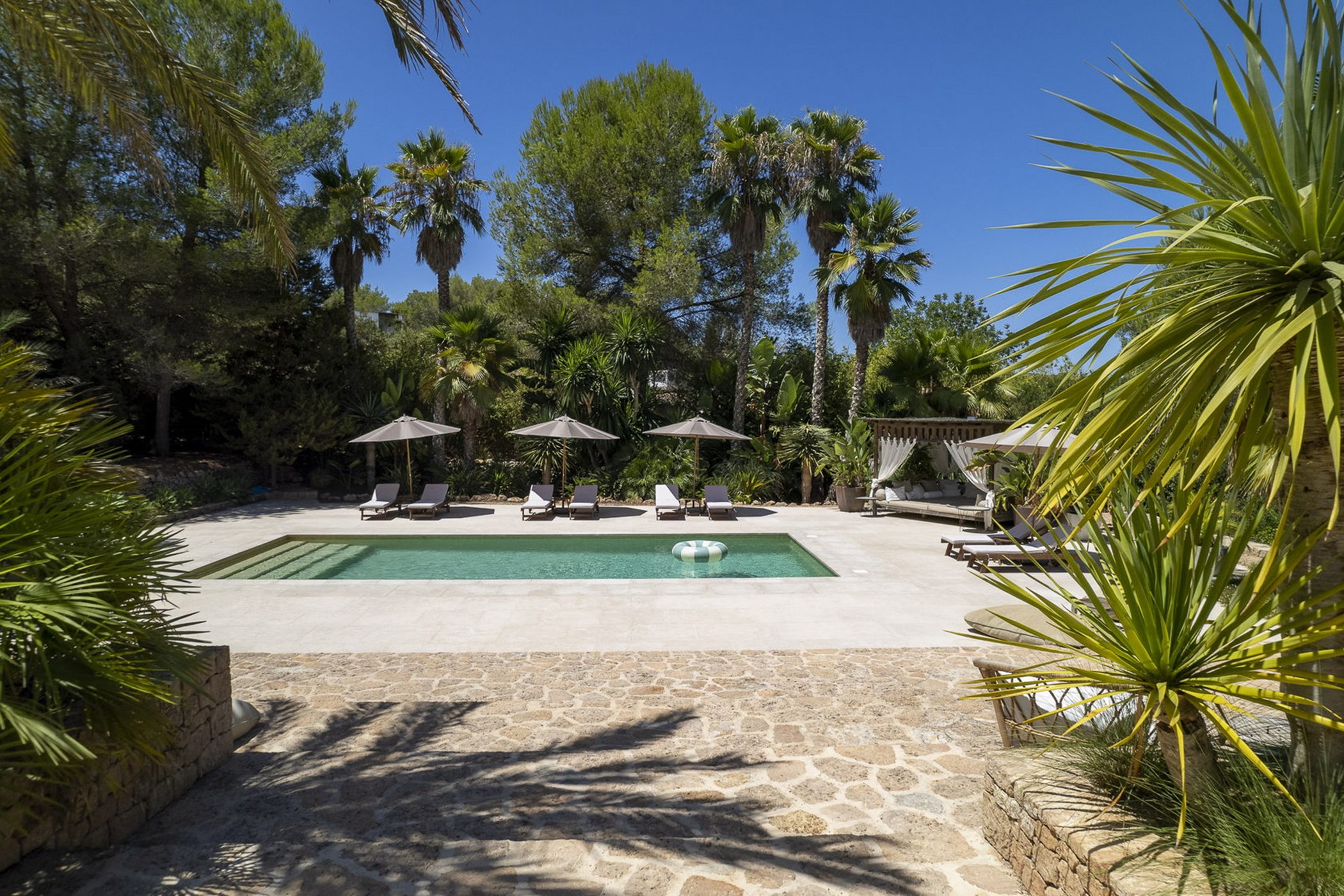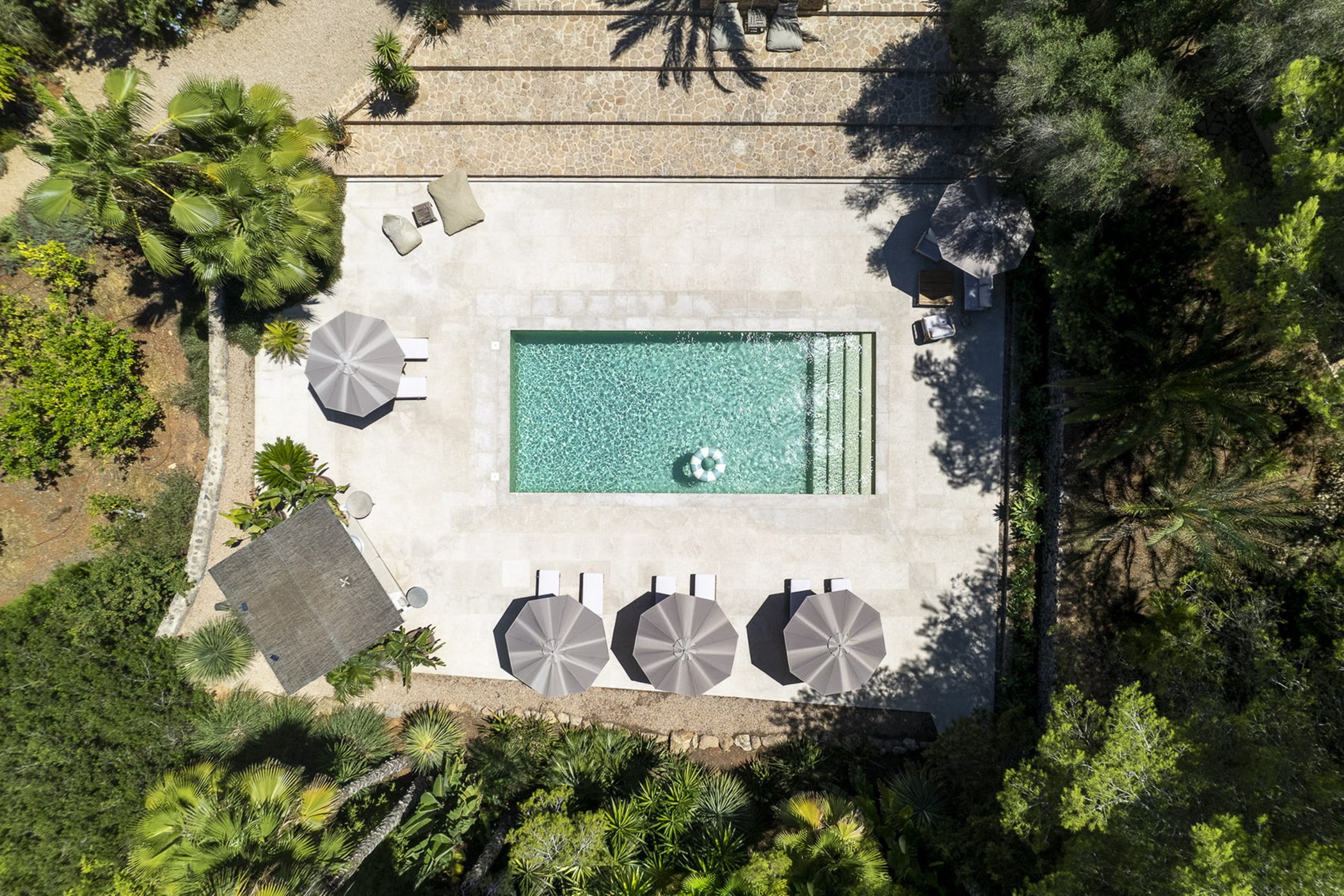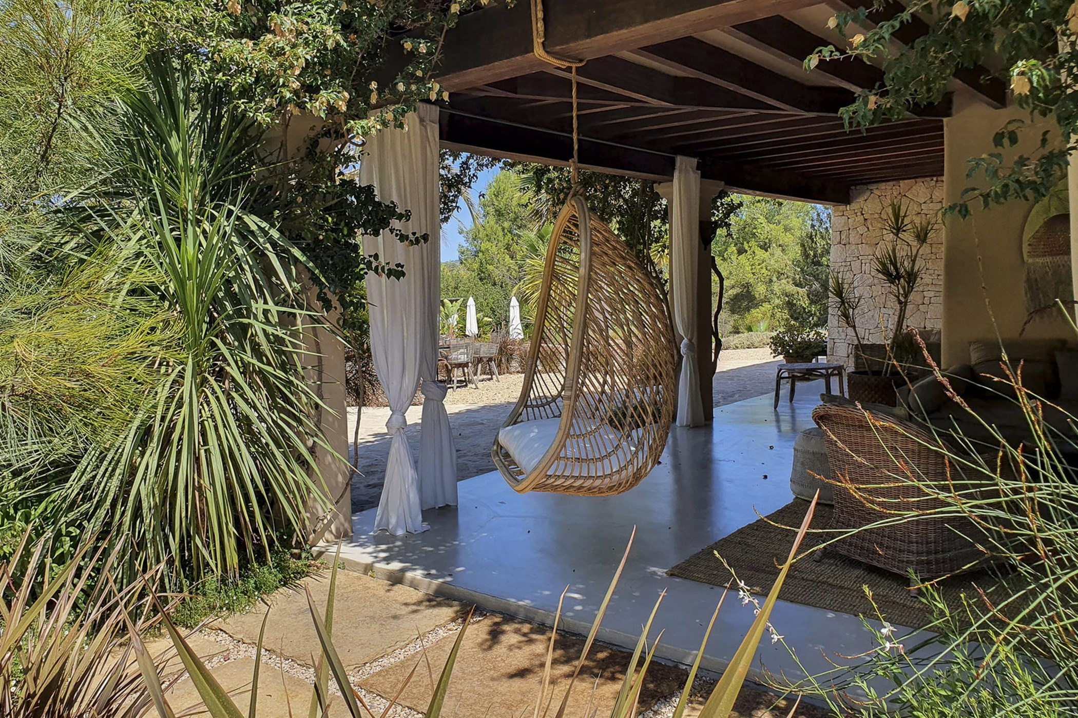 Can Mira is a five bedroom villa, newly built stone by stone within the magical embrace of ancient pine trees and a forest that holds secrets only those with an open-heart and unfettered imagination can uncover. Perfectly hidden deep in the campo, its proximity to restaurants, beaches, shops and Ibiza town are to be rejoiced in; nothing is far from your Island hideaway. Follow the twisting country roads and within minutes you find yourself in the village of Santa Gertrudis, a cool cute social hub, where stocking up on organic essentials, popping in to browse artisan home wares in Es Cucones or an indulgent no shame people watching, café con leche in hand from the village square are all easy peasey.