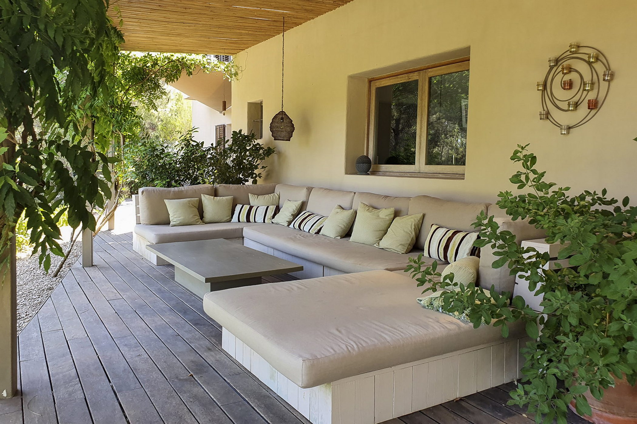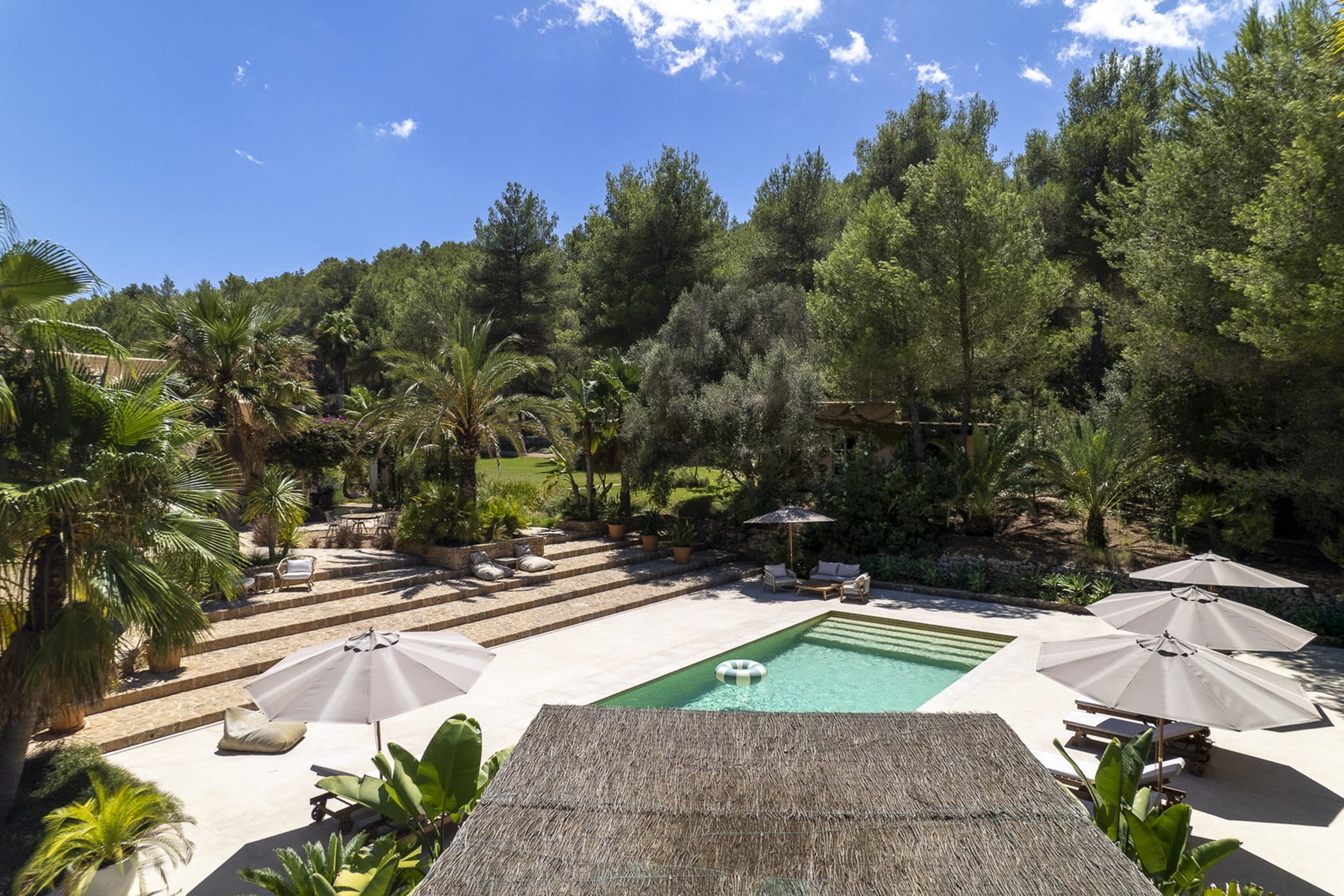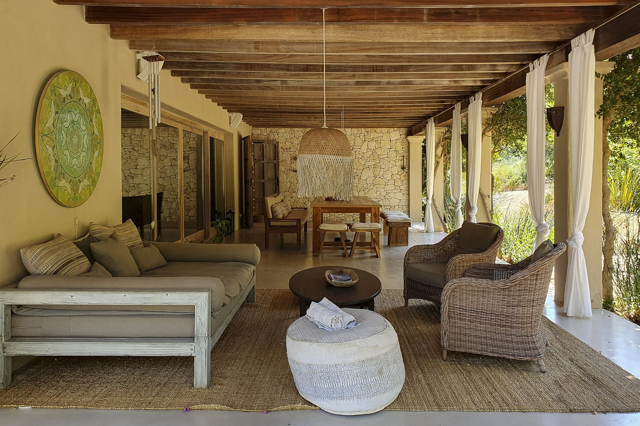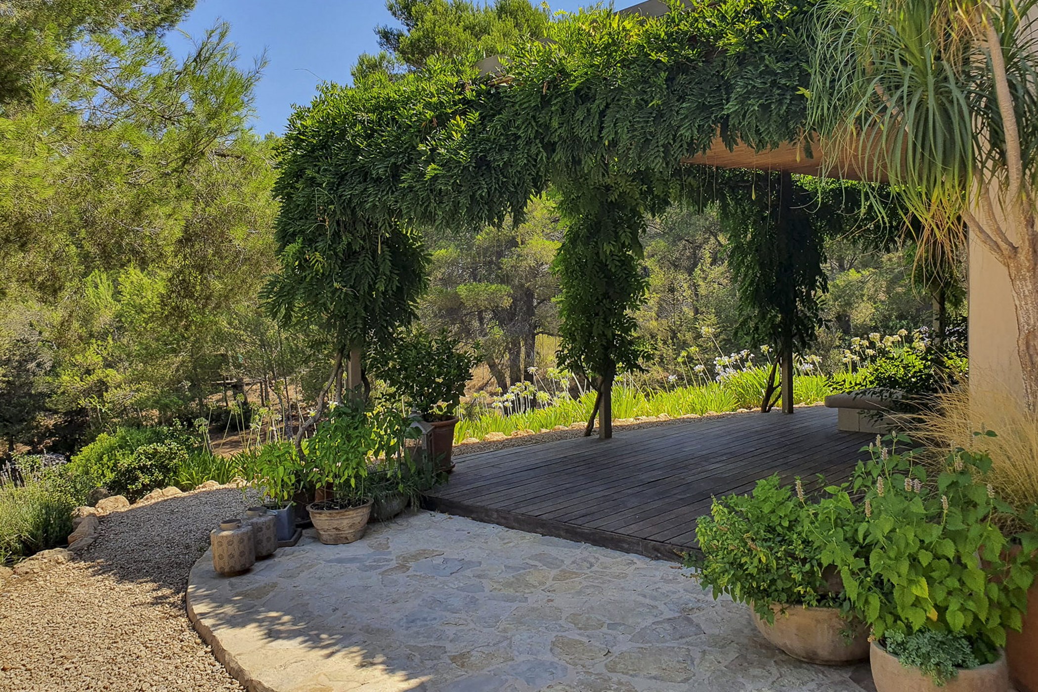 Can Mira is a five bedroom villa, newly built stone by stone within the magical embrace of ancient pine trees and a forest that holds secrets only those with an open-heart and unfettered imagination can uncover. Perfectly hidden deep in the campo, its proximity to restaurants, beaches, shops and Ibiza town are to be rejoiced in; nothing is far from your Island hideaway. Follow the twisting country roads and within minutes you find yourself in the village of Santa Gertrudis, a cool cute social hub, where stocking up on organic essentials, popping in to browse artisan home wares in Es Cucones or an indulgent no shame people watching, café con leche in hand from the village square are all easy peasey.