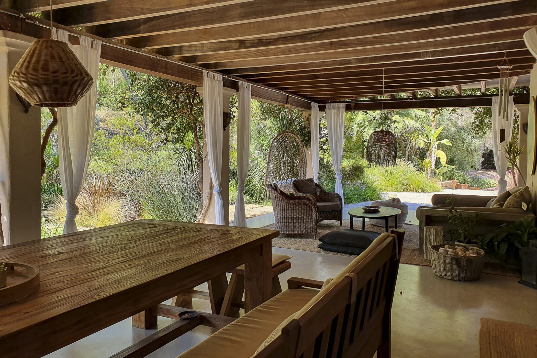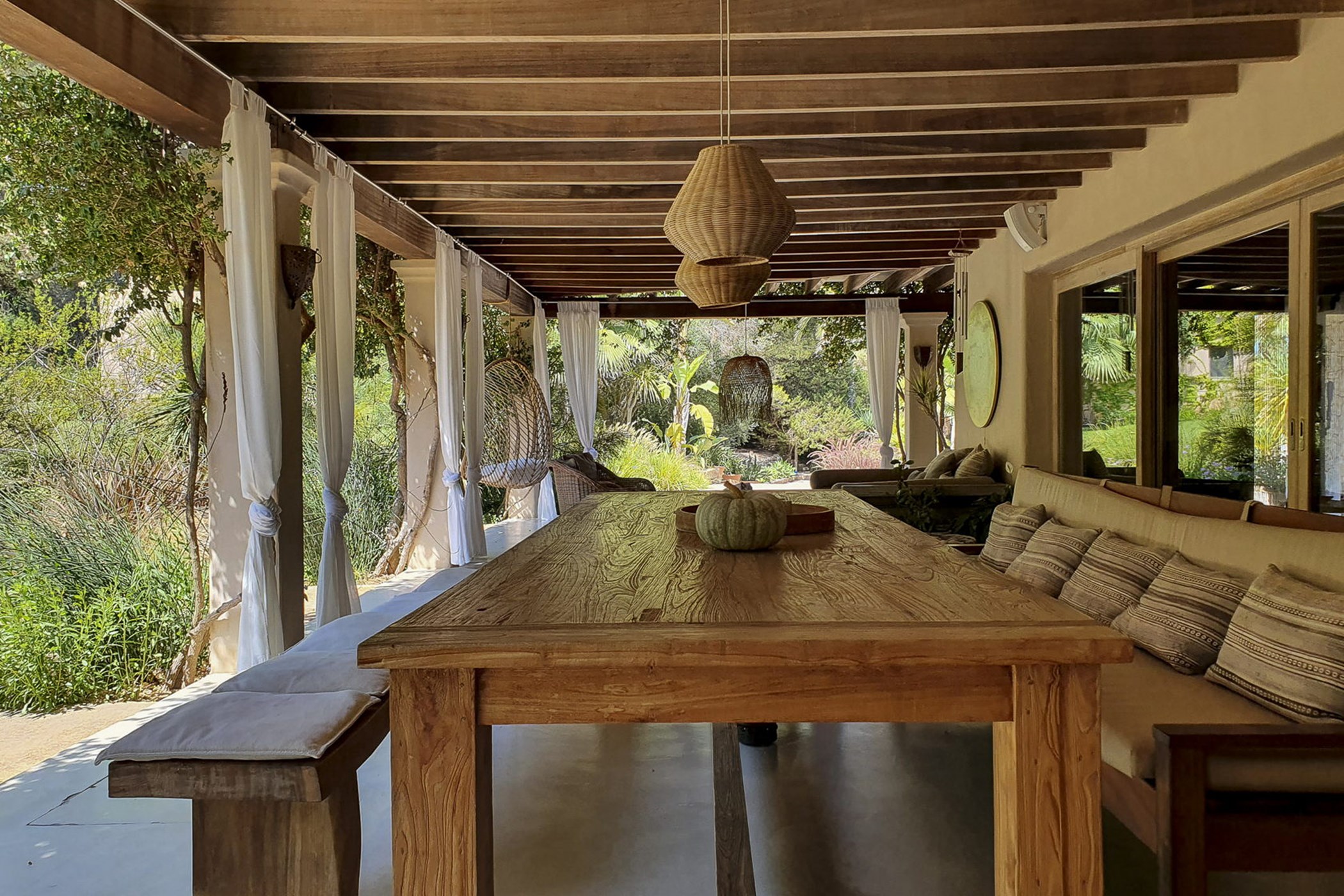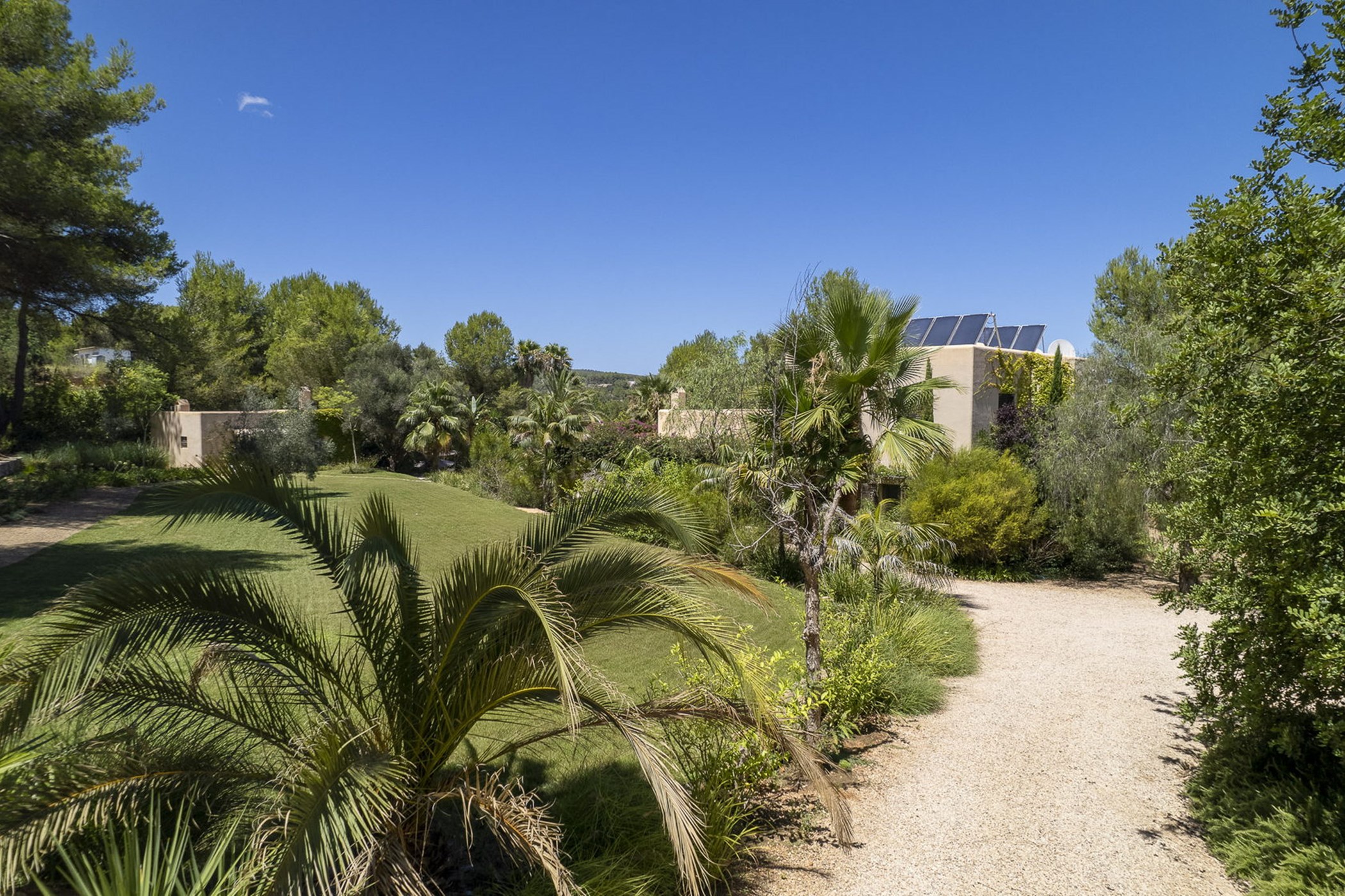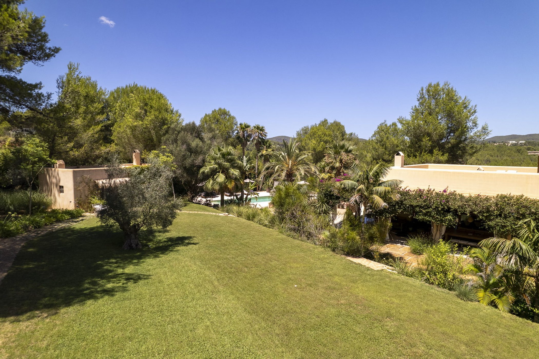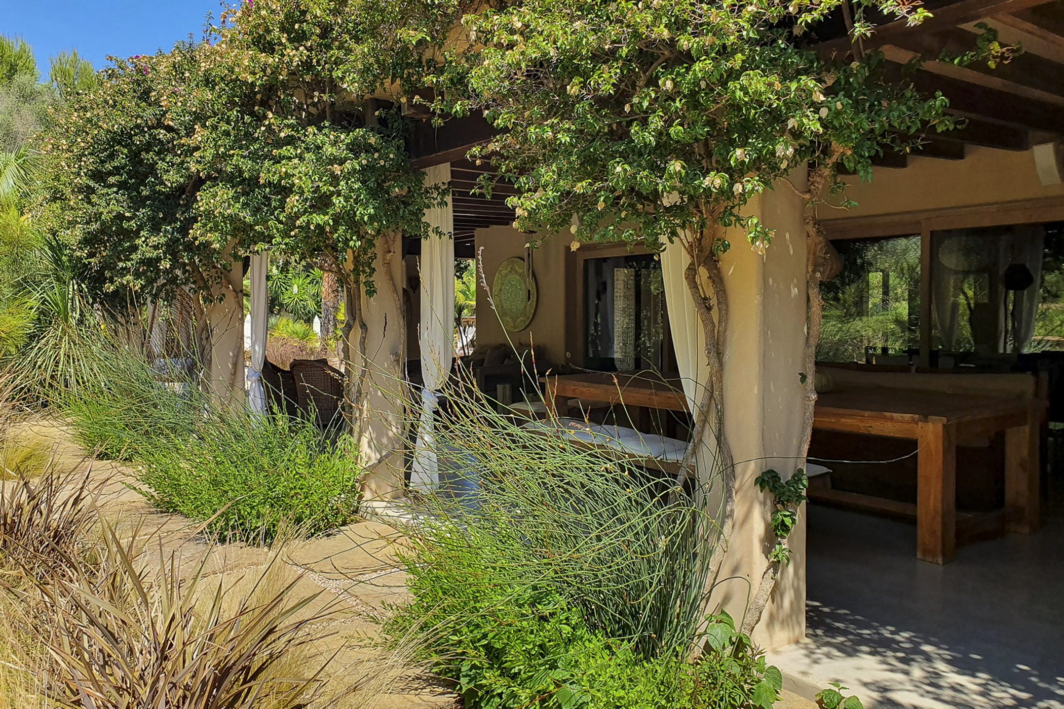 Can Mira is a five bedroom villa, newly built stone by stone within the magical embrace of ancient pine trees and a forest that holds secrets only those with an open-heart and unfettered imagination can uncover. Perfectly hidden deep in the campo, its proximity to restaurants, beaches, shops and Ibiza town are to be rejoiced in; nothing is far from your Island hideaway. Follow the twisting country roads and within minutes you find yourself in the village of Santa Gertrudis, a cool cute social hub, where stocking up on organic essentials, popping in to browse artisan home wares in Es Cucones or an indulgent no shame people watching, café con leche in hand from the village square are all easy peasey.