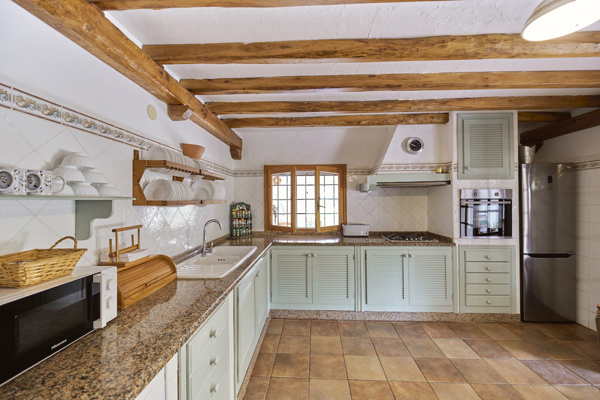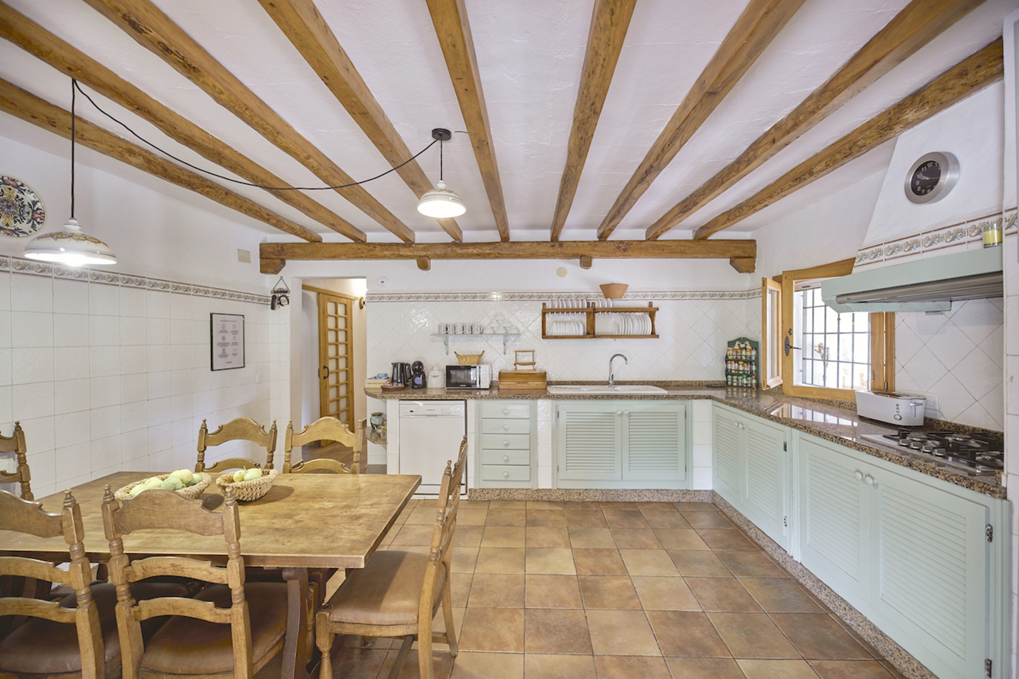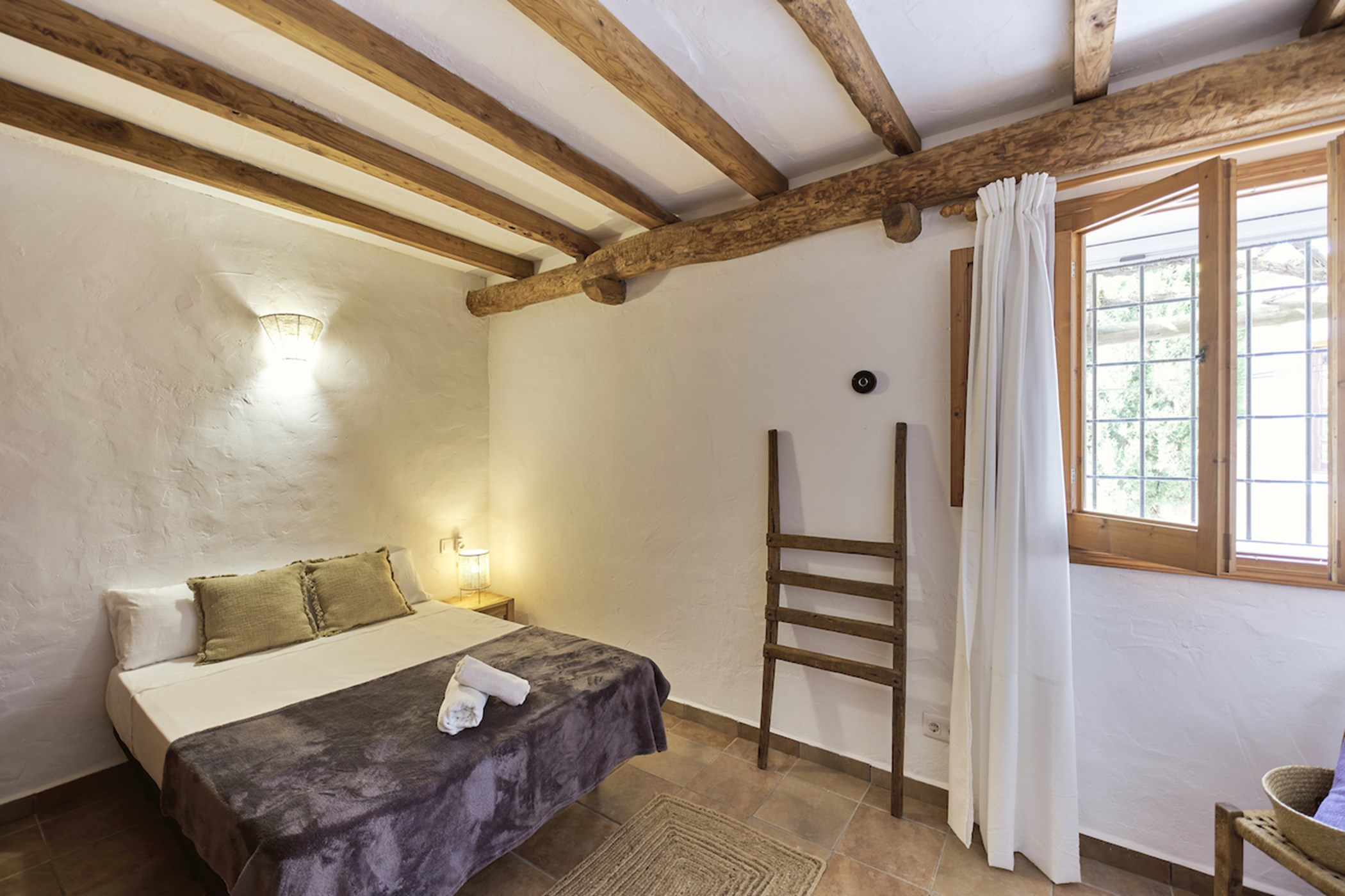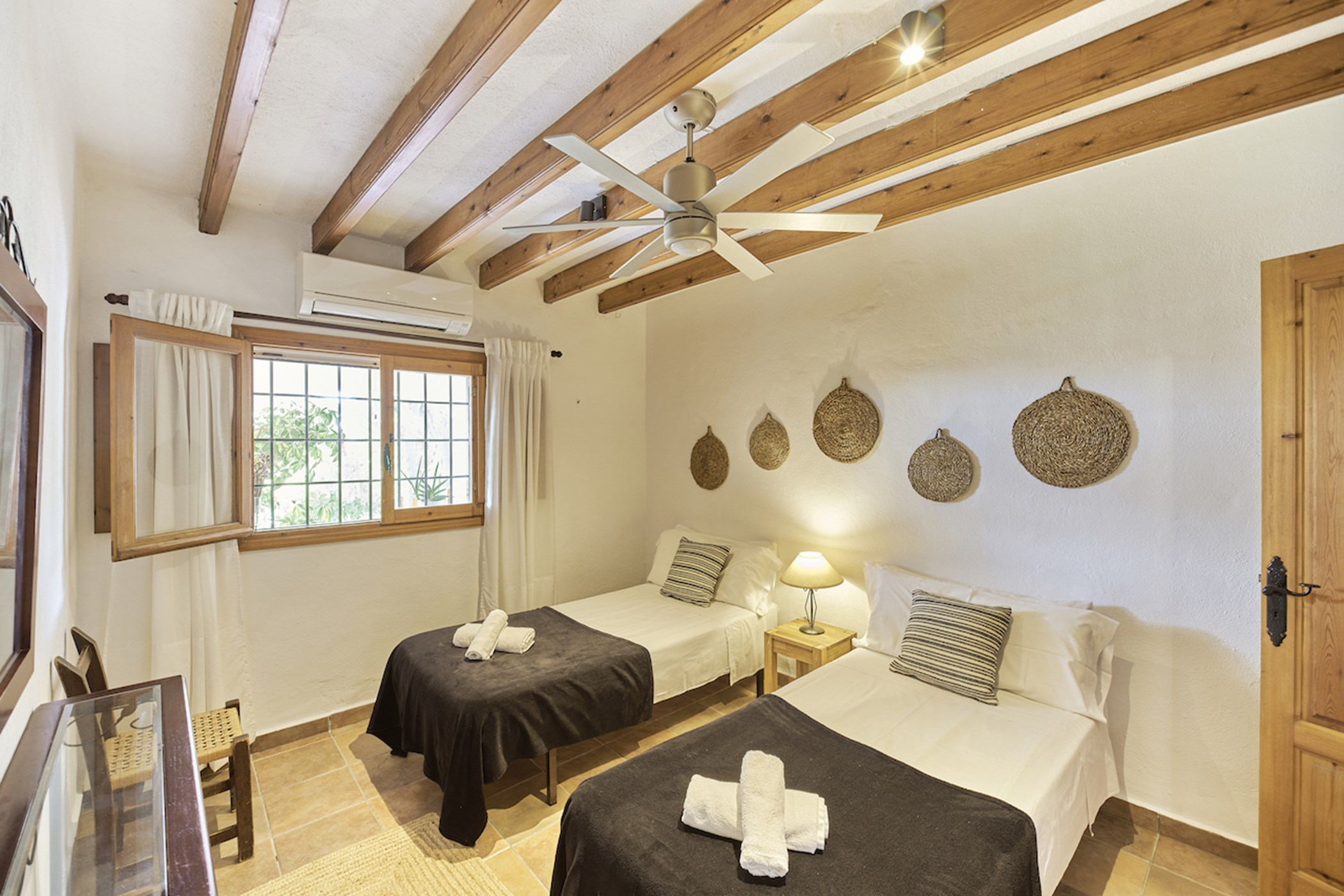The villa features 5 charming bedrooms with wooden ceilings, exterior windows, and tasteful Mediterranean décor. The sleeping arrangements include:
