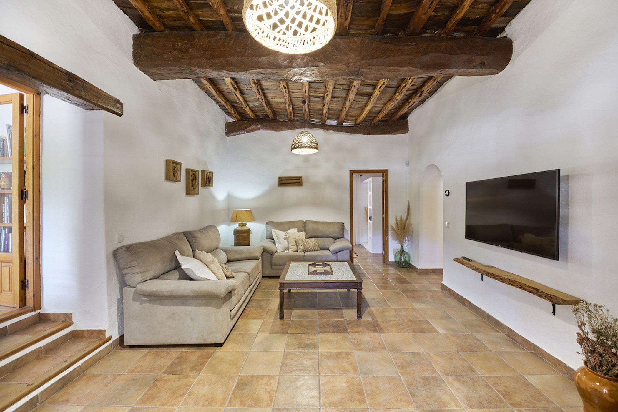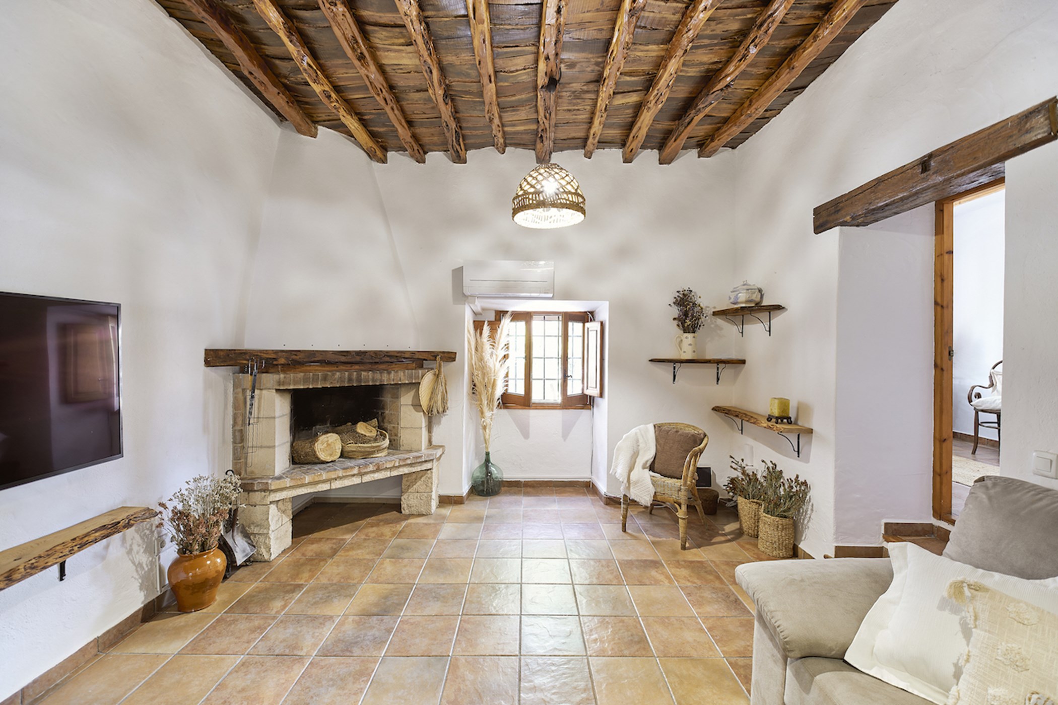 The living room, adjacent to the terraces, serves as a central gathering place. With inviting furnishings, a fireplace, and traditional juniper-beamed ceilings, it offers a warm and cozy ambiance where you can relax with friends and family.