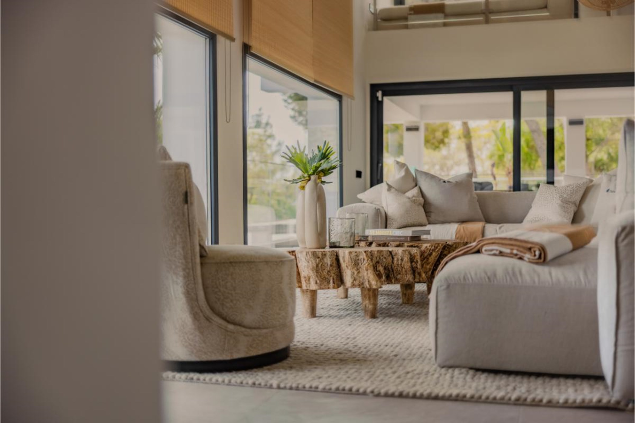 Inside, the home is finished to the highest standards, combining sleek modern architecture with organic textures, natural wood, and warm, earthy tones. Floor-to-ceiling glass walls flood the interiors with natural light and frame the sweeping sea views. The open-plan living spaces flow effortlessly onto expansive terraces, blurring the line between indoors and outdoors.