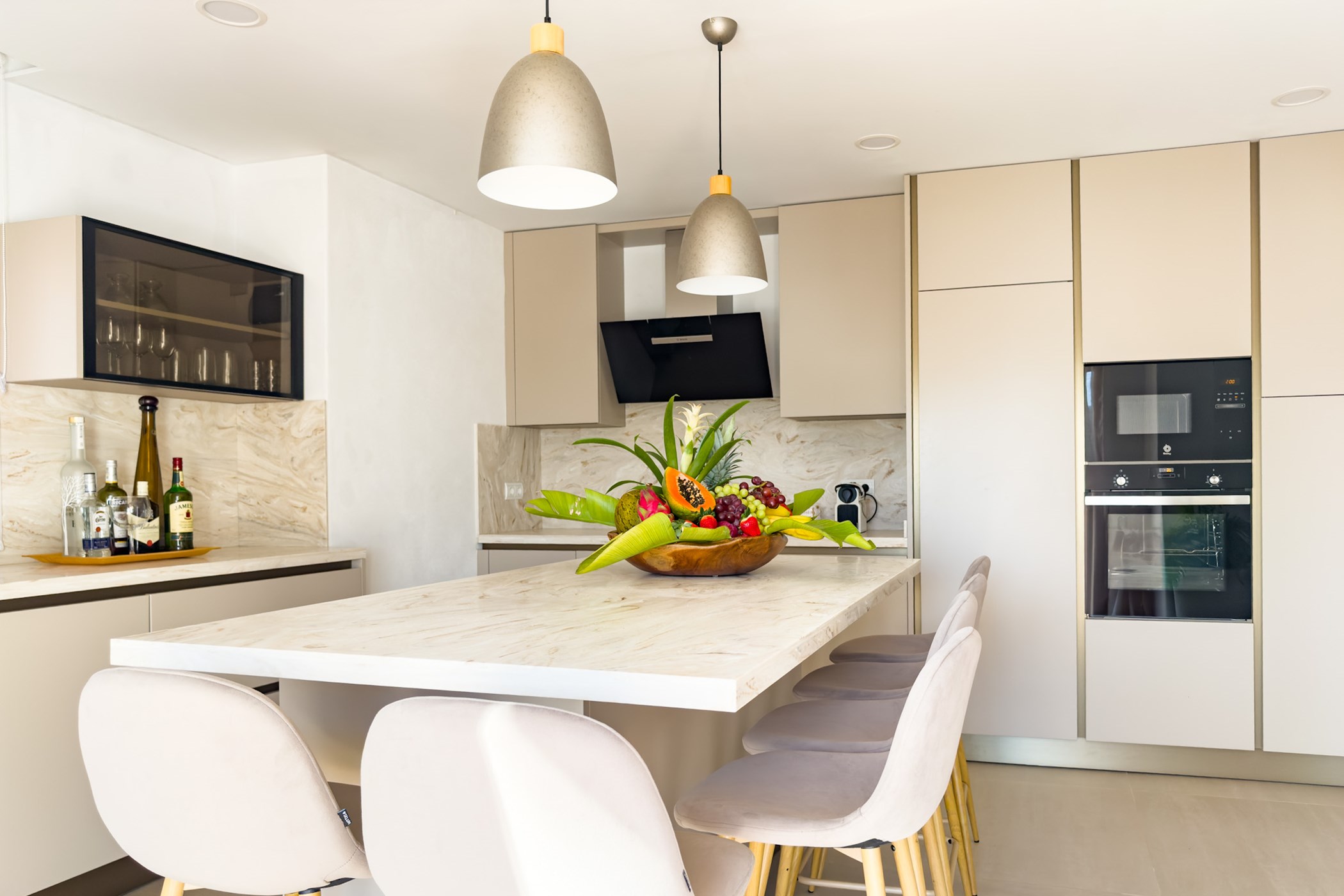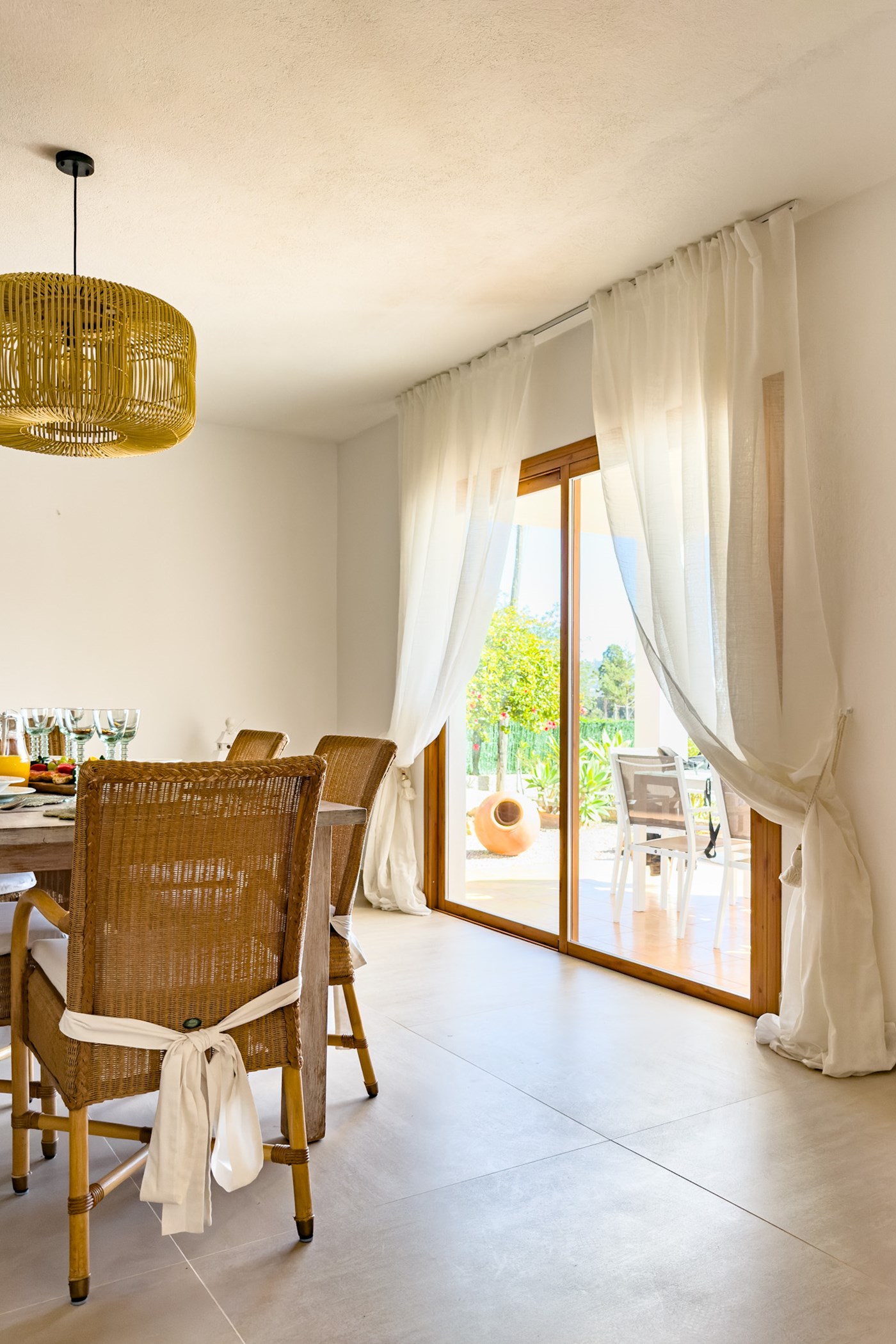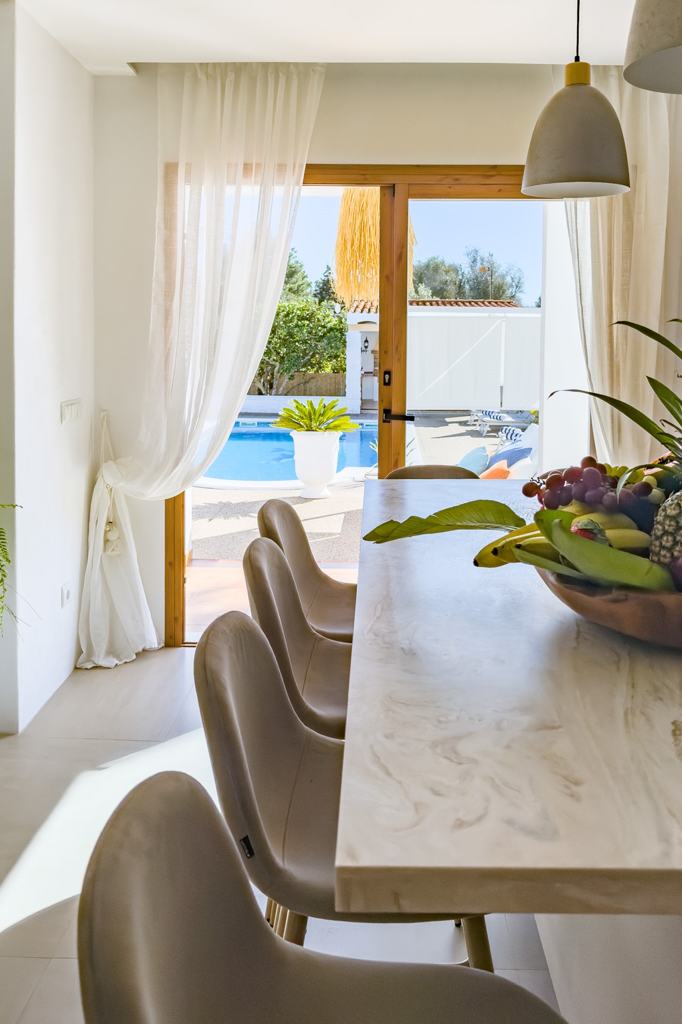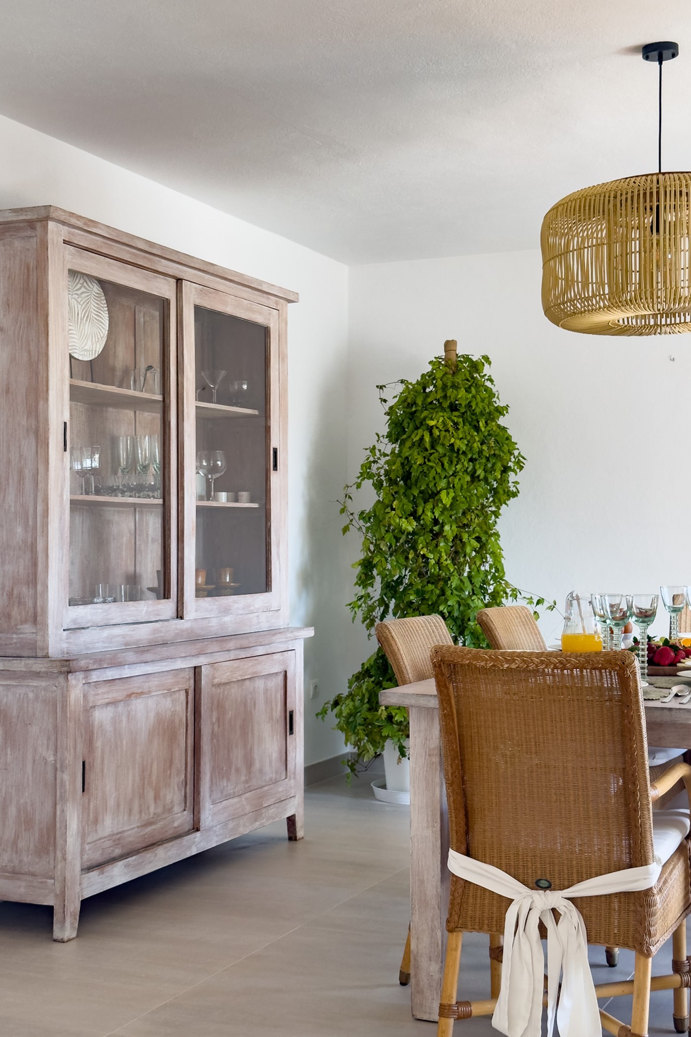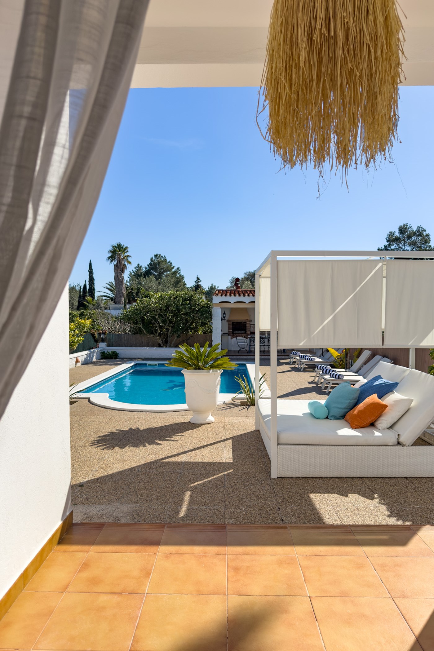 The villa’s exterior is a true oasis, boasting a stunning swimming pool surrounded by sun loungers, perfect for soaking up the sun. The meticulously maintained gardens feature Balinese beds, ideal for unwinding and enjoying the peaceful surroundings. This private outdoor space invites you to disconnect and immerse yourself in Ibiza’s serenity. Additionally, we provide complimentary bed linens and towels for your convenience.