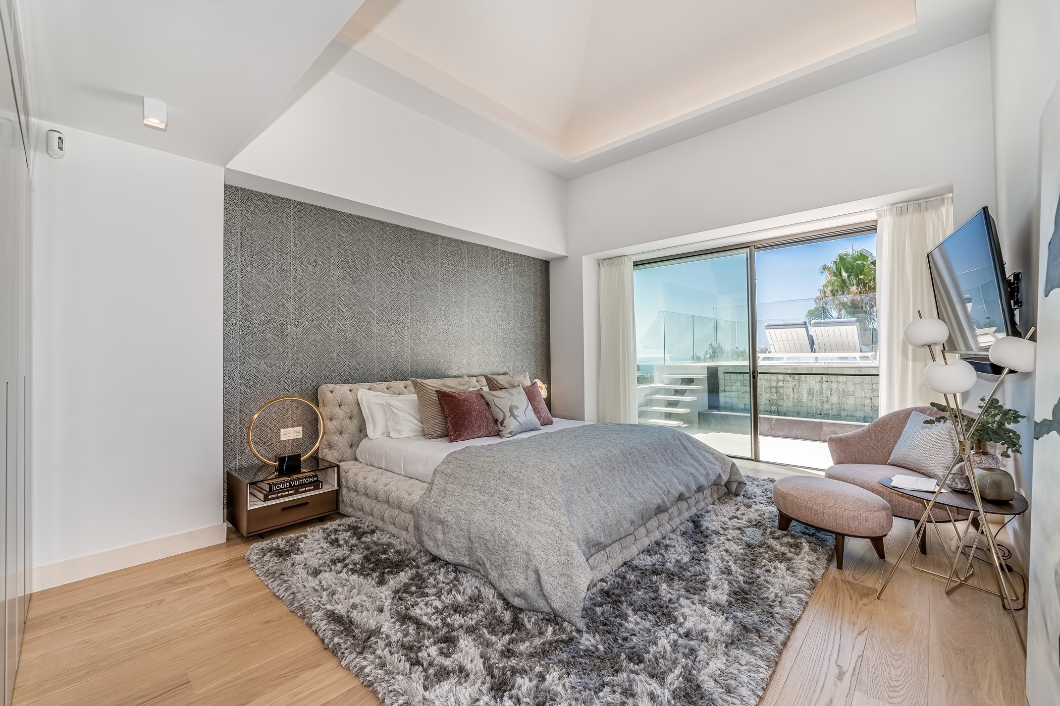 On the ground floor, you'll discover two exceptional en-suite bedrooms and a comfortable TV room. Additionally, a guest bedroom with its own terrace and garden is strategically located on the lower floor, adjacent to the gym and sauna area.