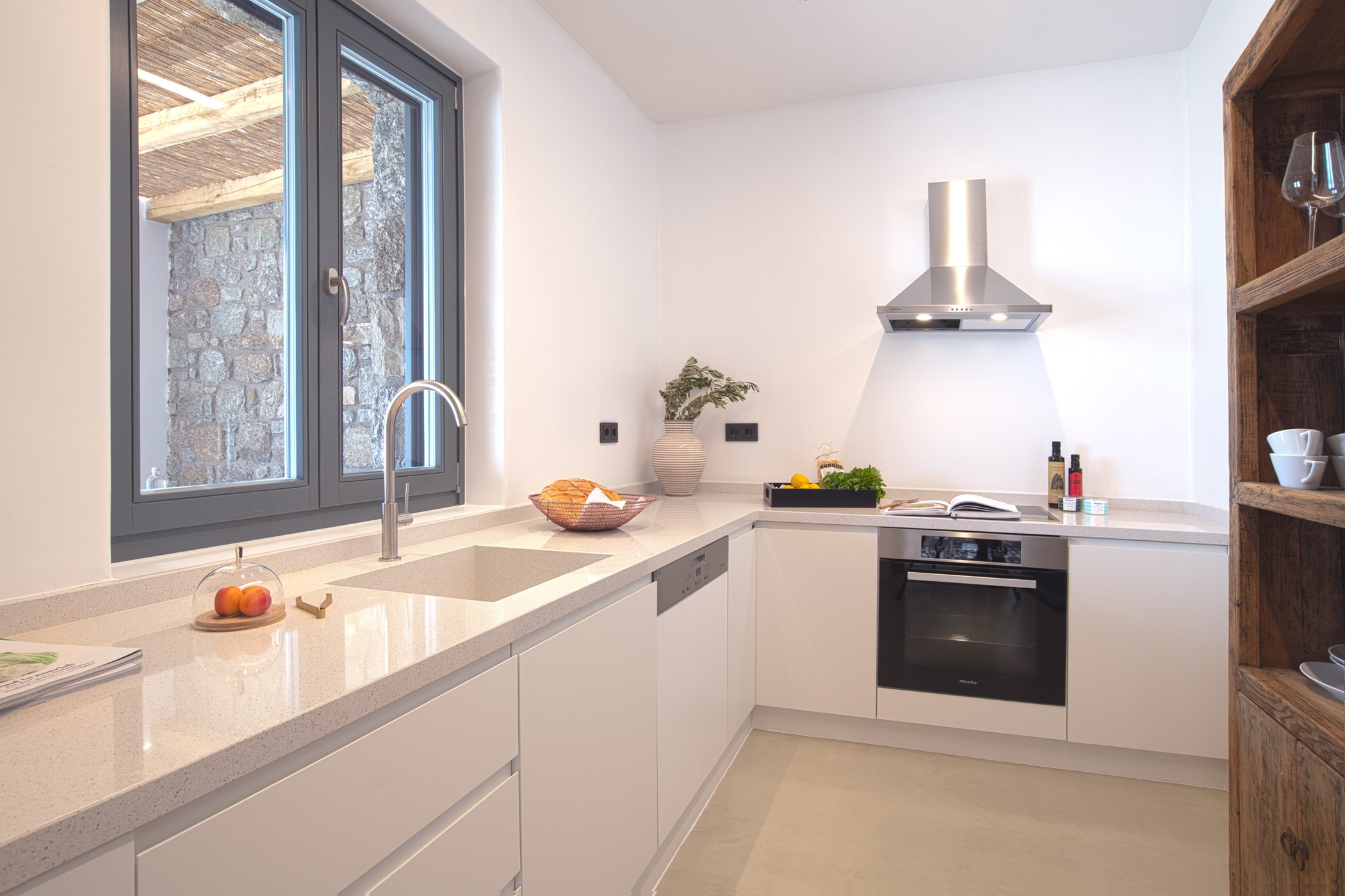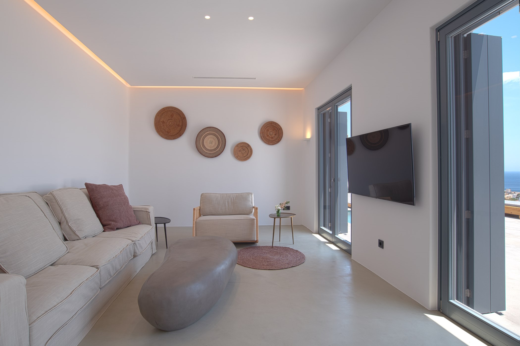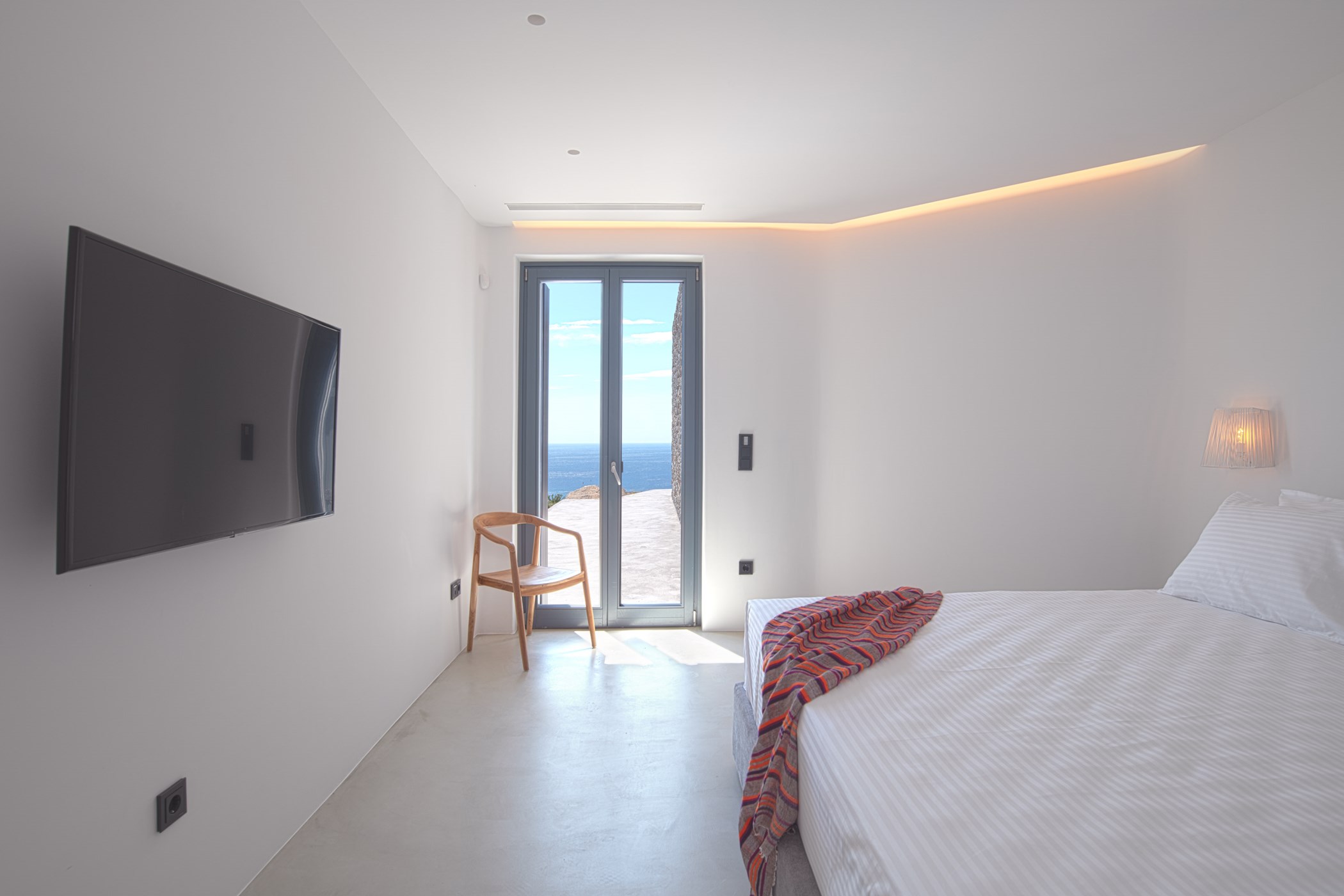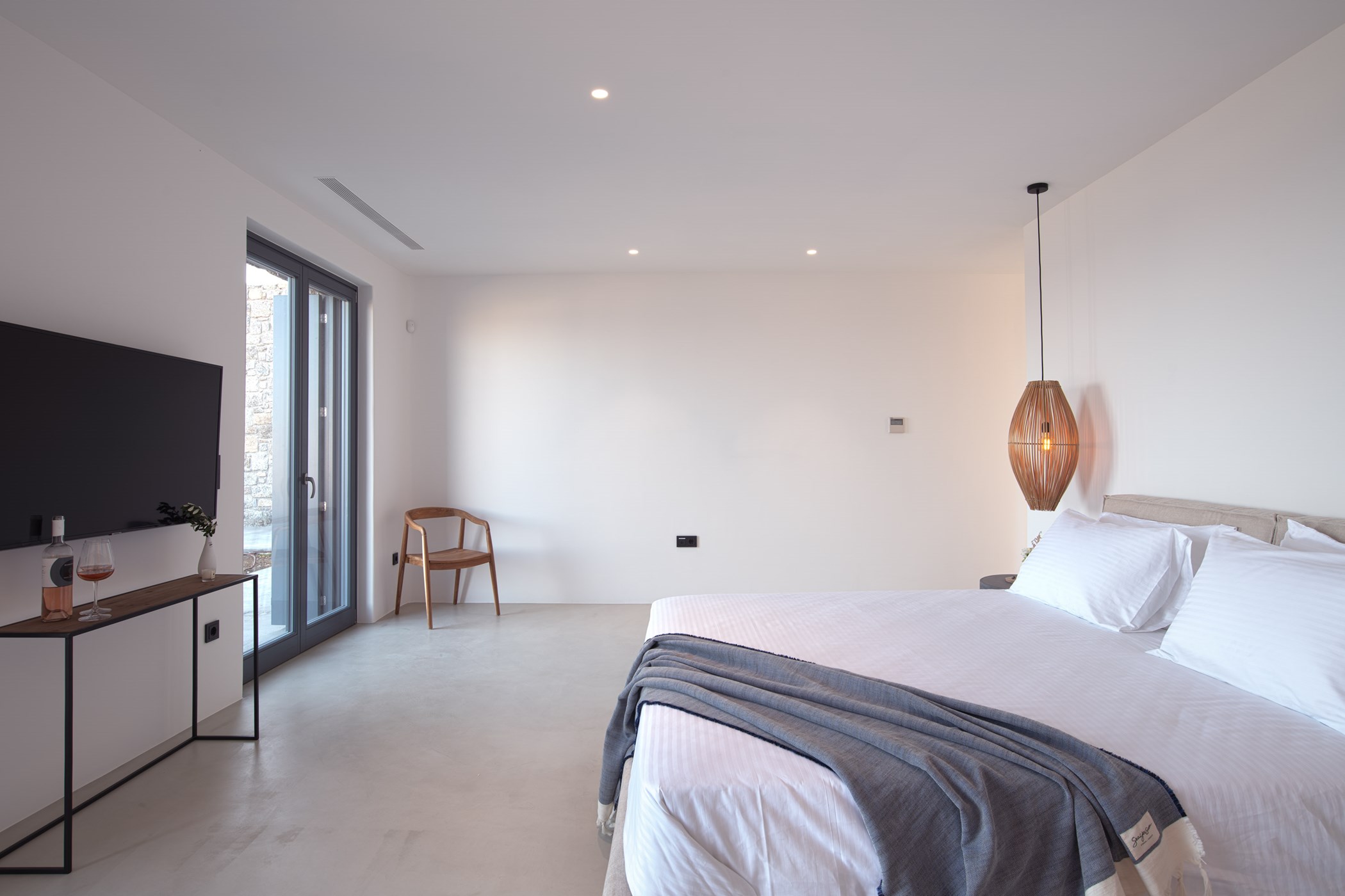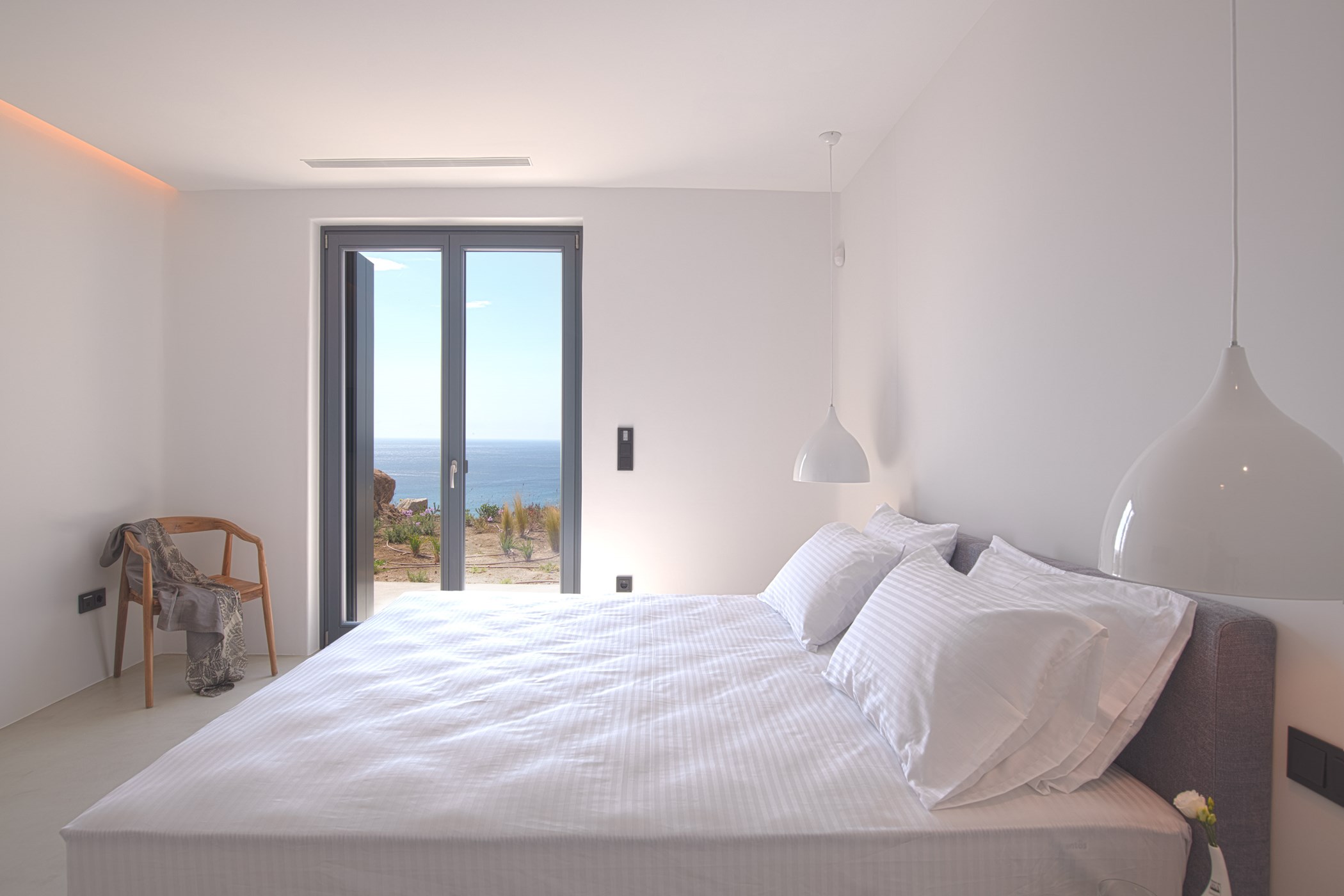 The interiors are minimal yet dictated both by modern architecture and the island's vernacular. Clean lines, polished concrete floors and uniform white walls that reflect the sunlight create a canvas that allows nature to become the focal point of the setting. To that end, the living areas are pierced by glass doors that connect the interior to the landscape. The ground level features a cozy living room, a fully equipped kitchen with modern appliances and a guest WC. A staircase leads to the four different sized bedrooms that occupy the lower level, all equipped with glass doors that open to the terrace and their own bathroom. Although the house is part of a complex, it is designed to offer privacy without compromising its captivating vistas.