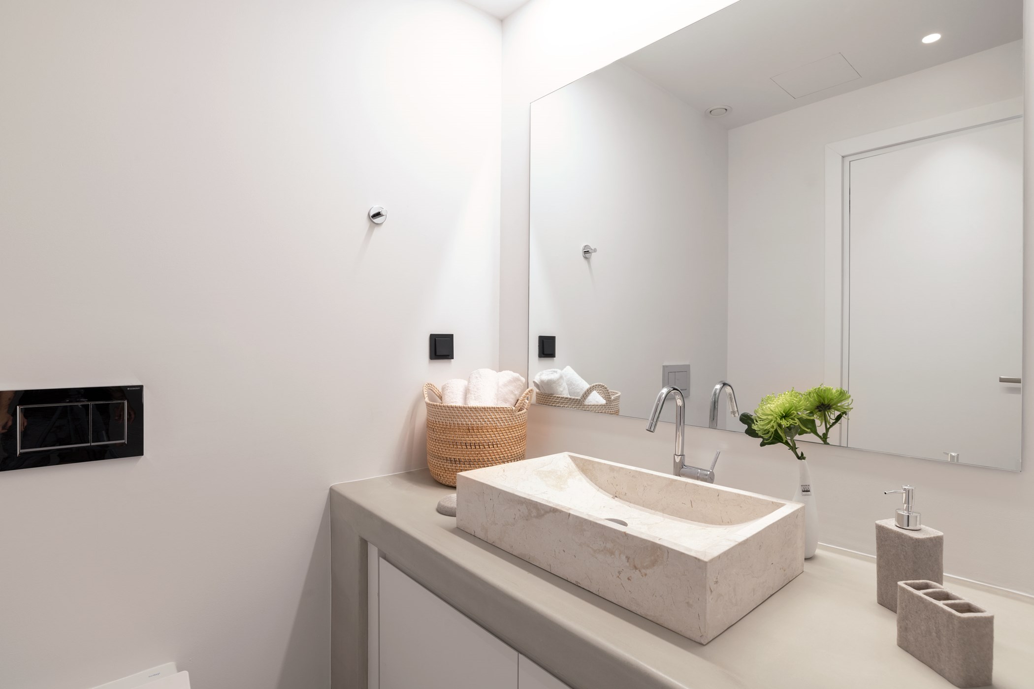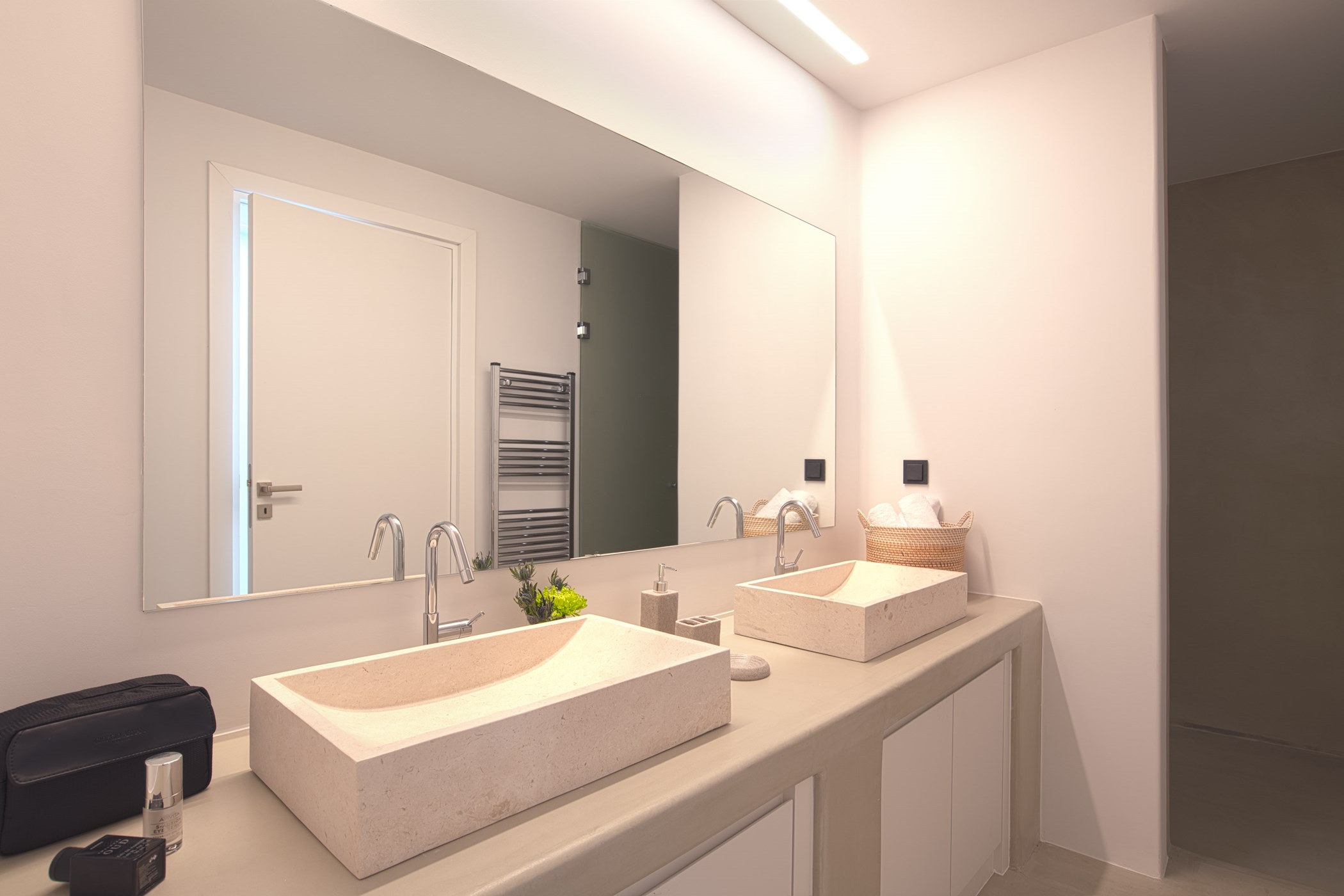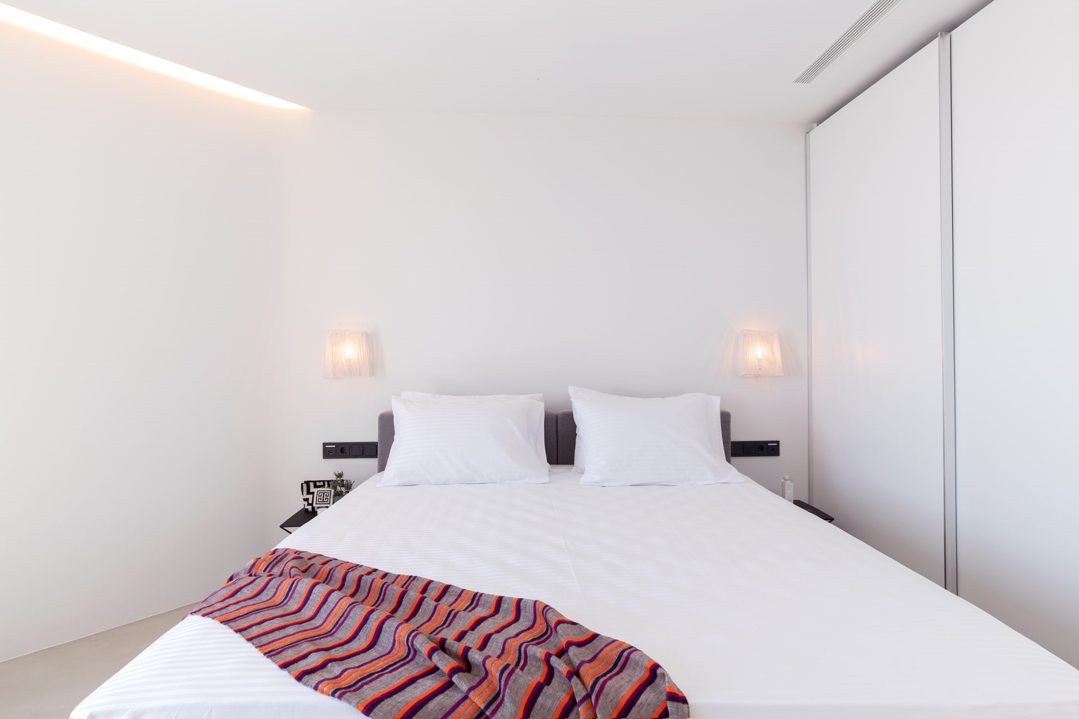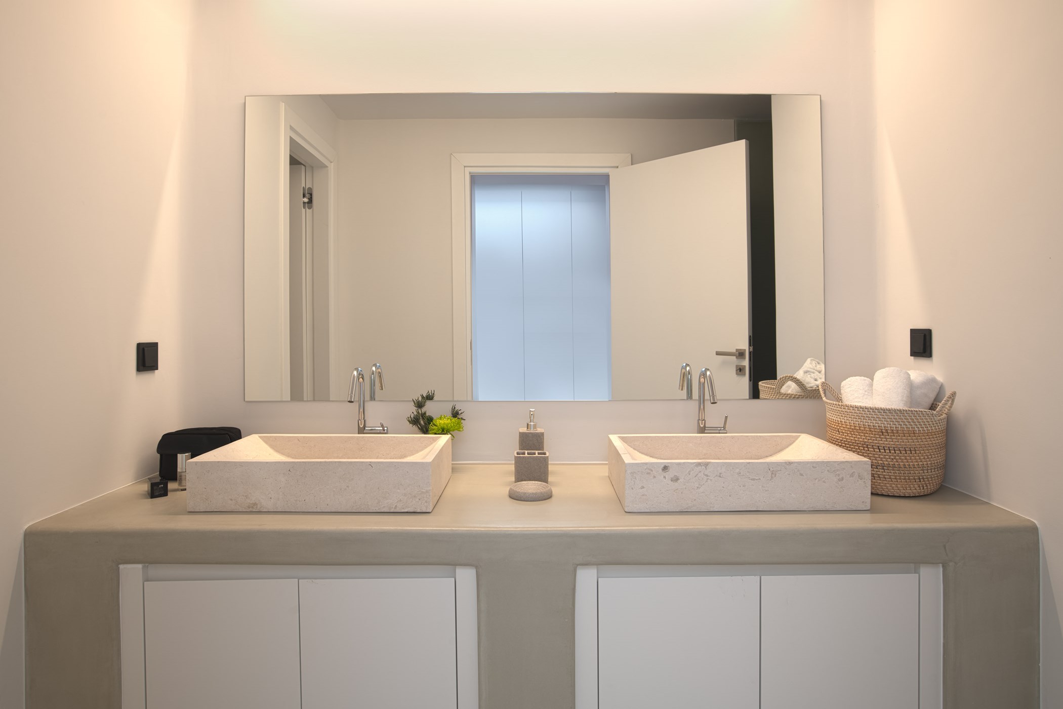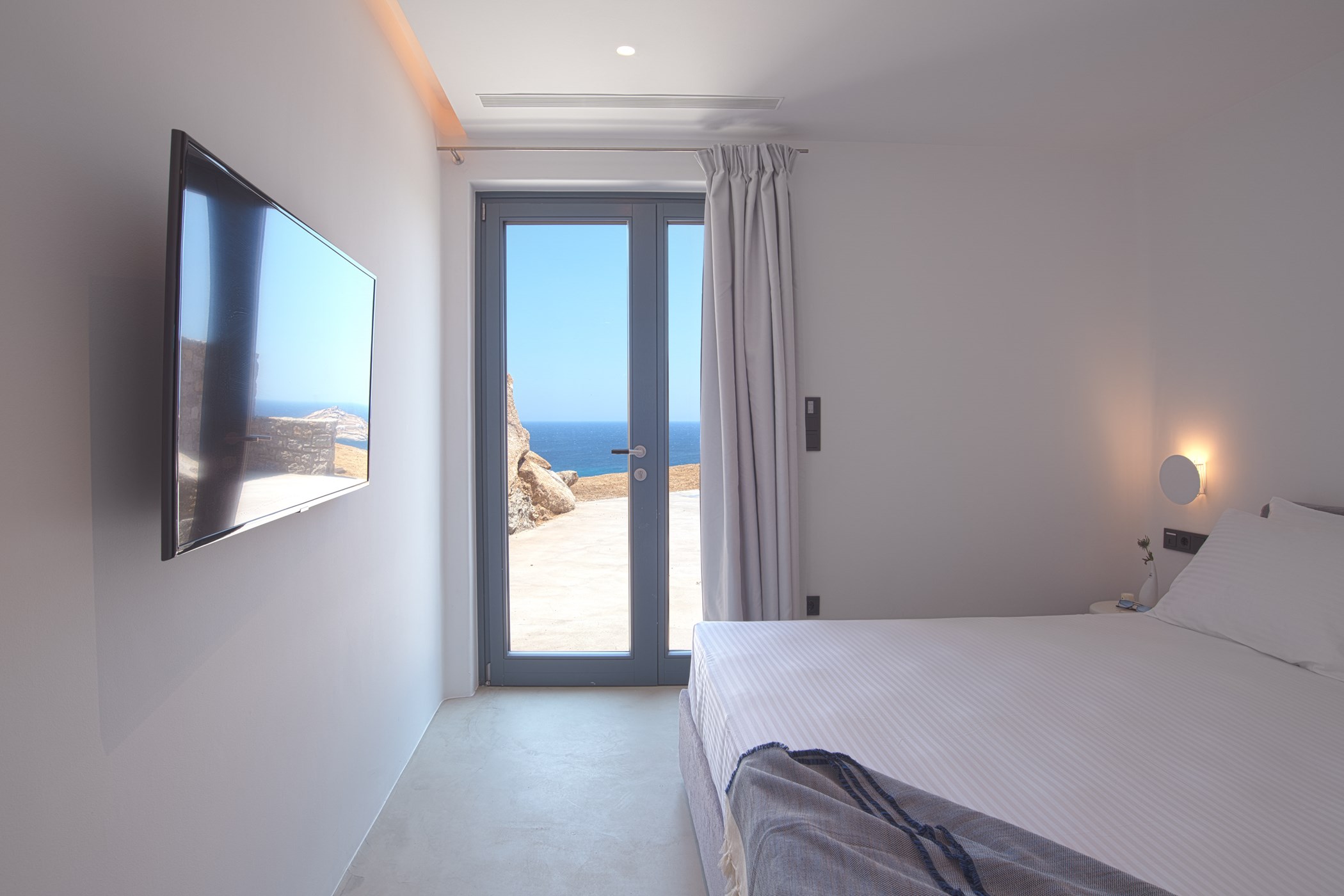 The interiors are minimal yet dictated both by modern architecture and the island's vernacular. Clean lines, polished concrete floors and uniform white walls that reflect the sunlight create a canvas that allows nature to become the focal point of the setting. To that end, the living areas are pierced by glass doors that connect the interior to the landscape. The ground level features a cozy living room, a fully equipped kitchen with modern appliances and a guest WC. A staircase leads to the four different sized bedrooms that occupy the lower level, all equipped with glass doors that open to the terrace and their own bathroom. Although the house is part of a complex, it is designed to offer privacy without compromising its captivating vistas.