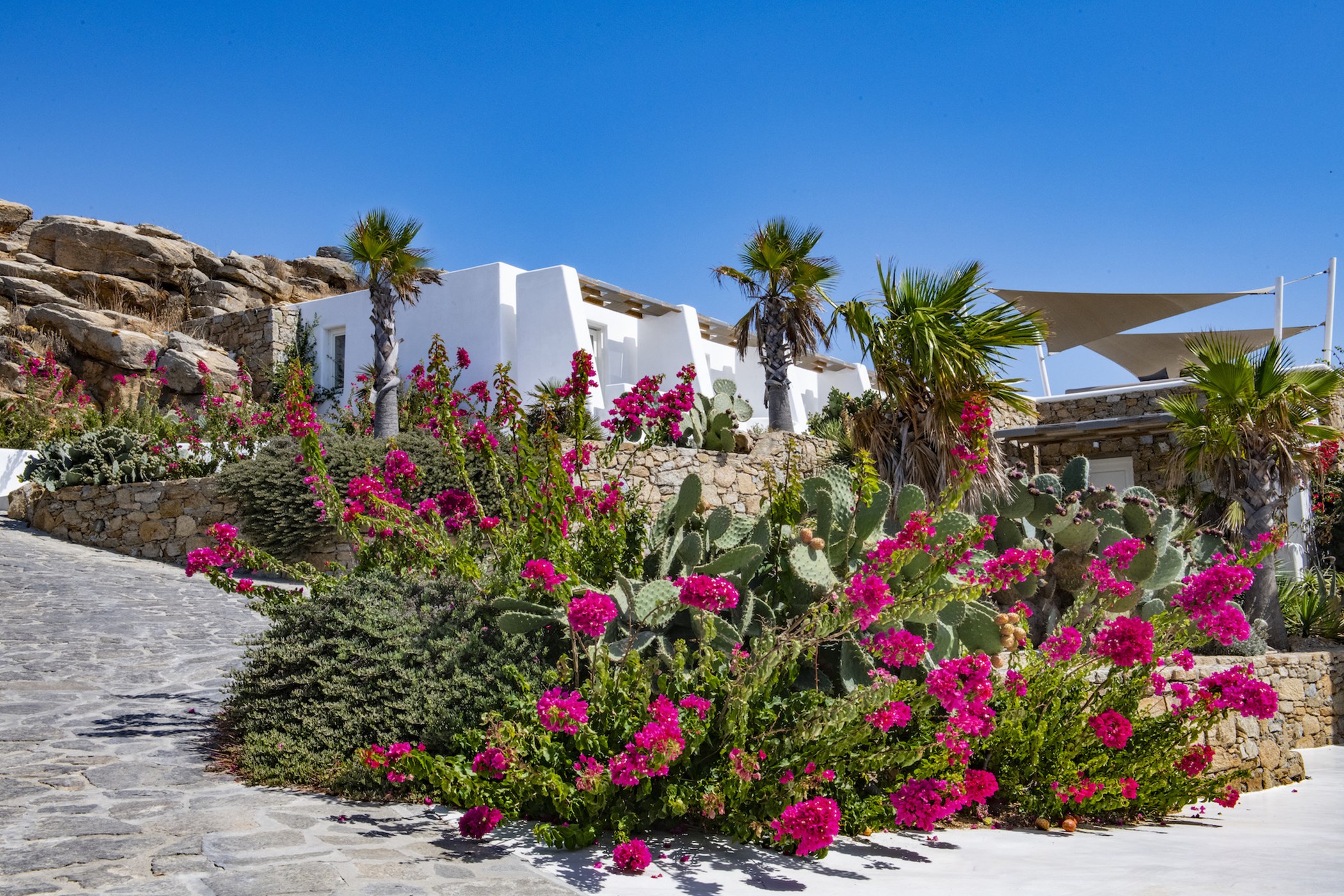 Luxury Suite Adeline is an elegant hilltop one-bedroom suite located on the distinctive area of Agia Sofia – Tourlos. This particular suite shares a stunning pool and gorgeous outdoor spaces with its sister Rylie another one-bedroom suite within the same property. Deployed in a total area of 67sq. m on one level living space, the lovely suite enjoys panoramic sea views of Mykonos town and the Aegean Sea and can accommodate up to 4 guests.