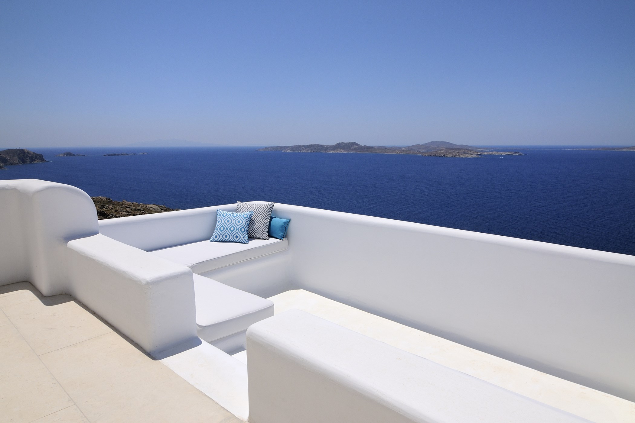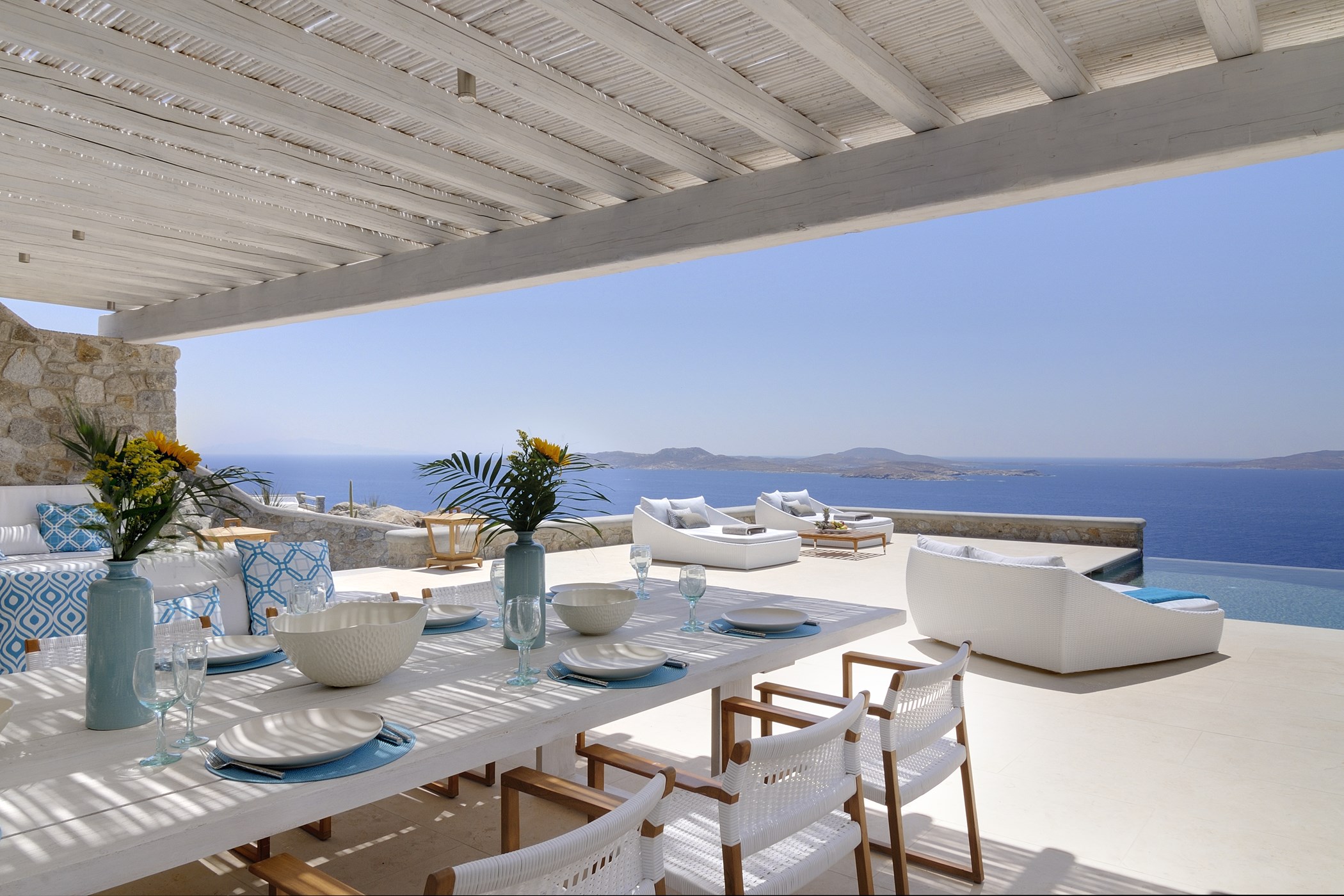 Sea Breeze is a wonderful 9-bedroom property situated at the west tip of the island. Thanks to its privileged location it offers the opportunity to witness terrific sunsets during every evening of your holiday retreat. The luxurious brand-new villa spreads in 550 m2 across multiple levels to welcome up to 18 guests. The property exudes the elegance and sophistication of the island combining modern minimal style with traditional Mykonian architecture. Keeping a local touch in the interior design, all living areas are warm, with soft light wooden floors and wooden pillars at the ceiling, Cycladic arches and white surfaces. And while the indoors are well-appointed, it’s the outdoors here that are truly spectacular. The exterior, along with the dining, lounge and pool areas, all designed in perfect harmony, provide the guests with an overall feeling of calmness and serenity.