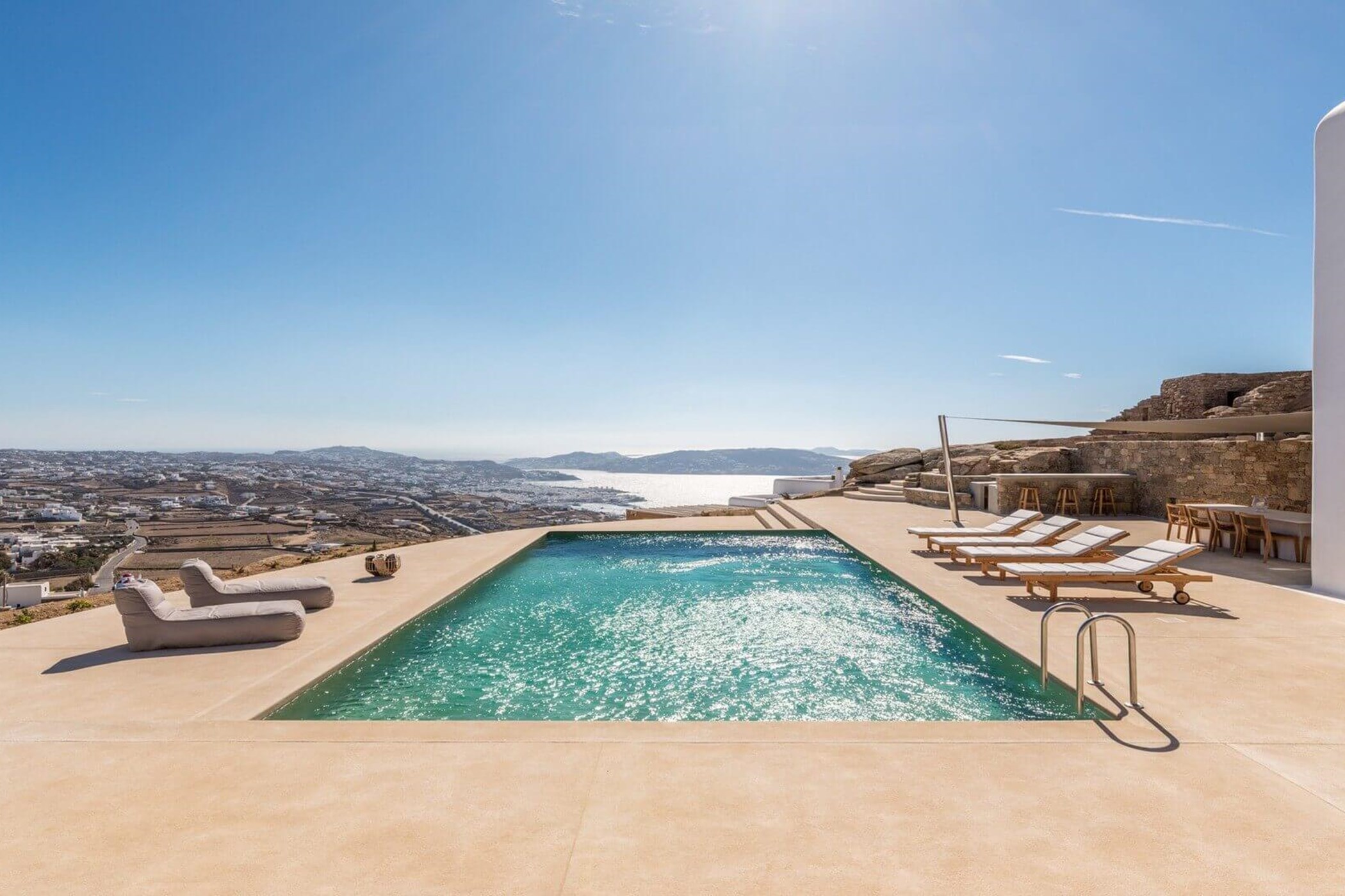 The unmistakably Mykonian design, influenced by Cycladic minimalism, showcases whitewashed exteriors and minimal Art Deco interiors. This villa seamlessly blends luxury and privacy, offering a retreat with cozy interiors, a private pool surrounded by granite rocks, and expansive lounges for relaxation. Attention to detail is paramount, evident in the elegant decoration with wooden furniture in earth tones, creating a harmonious blend of indoor and outdoor living.