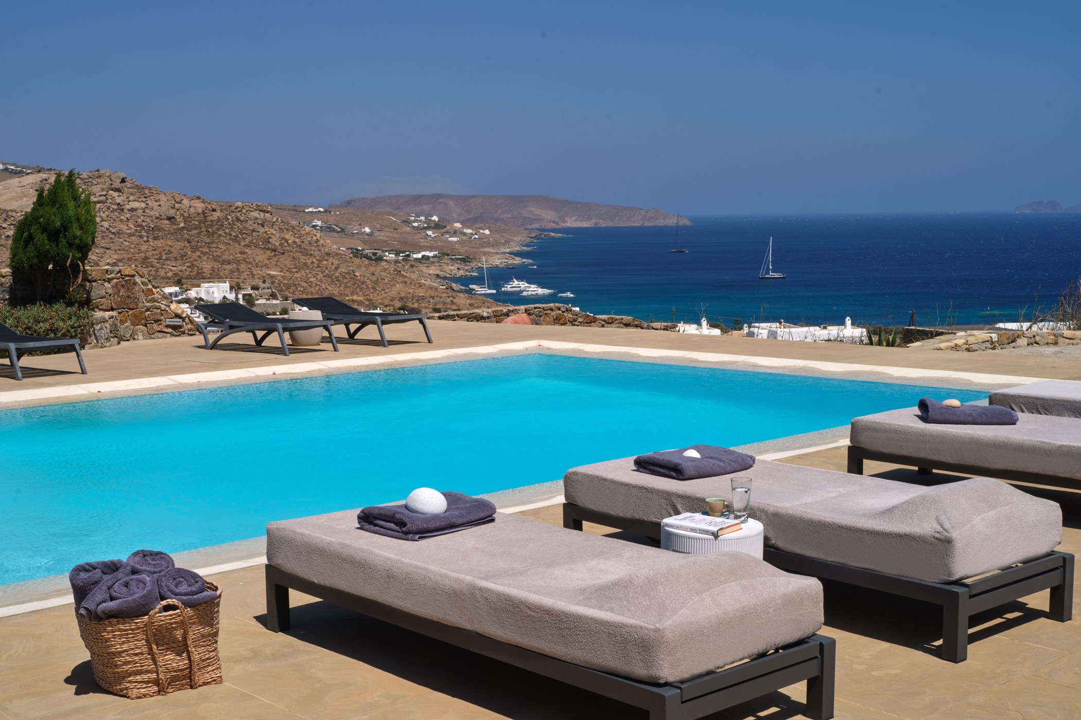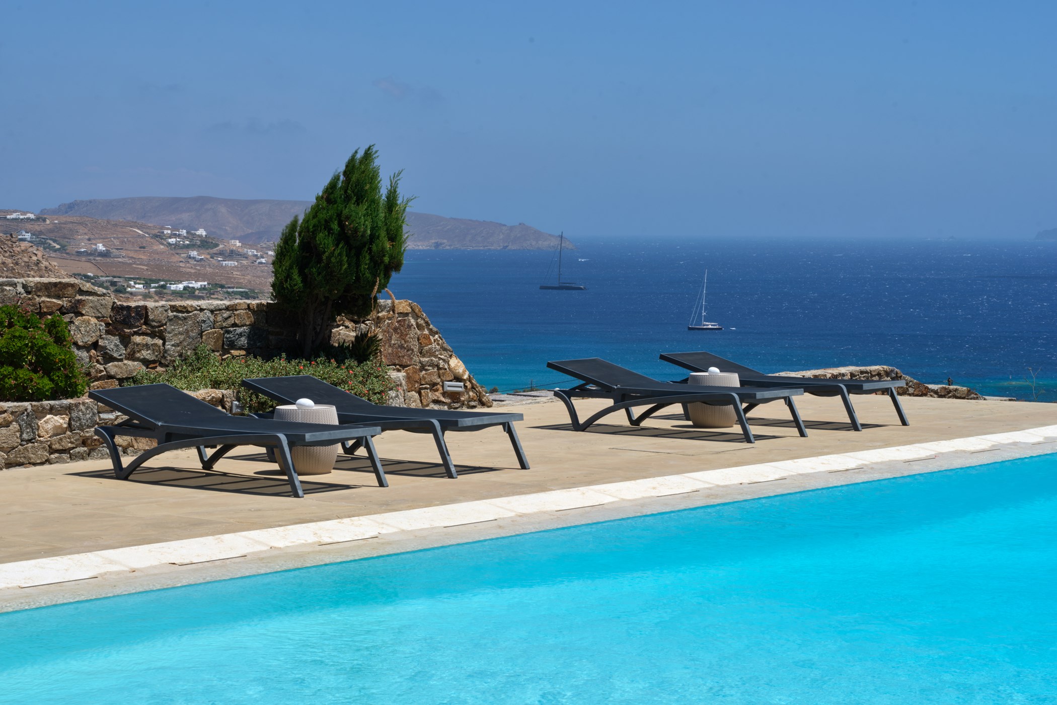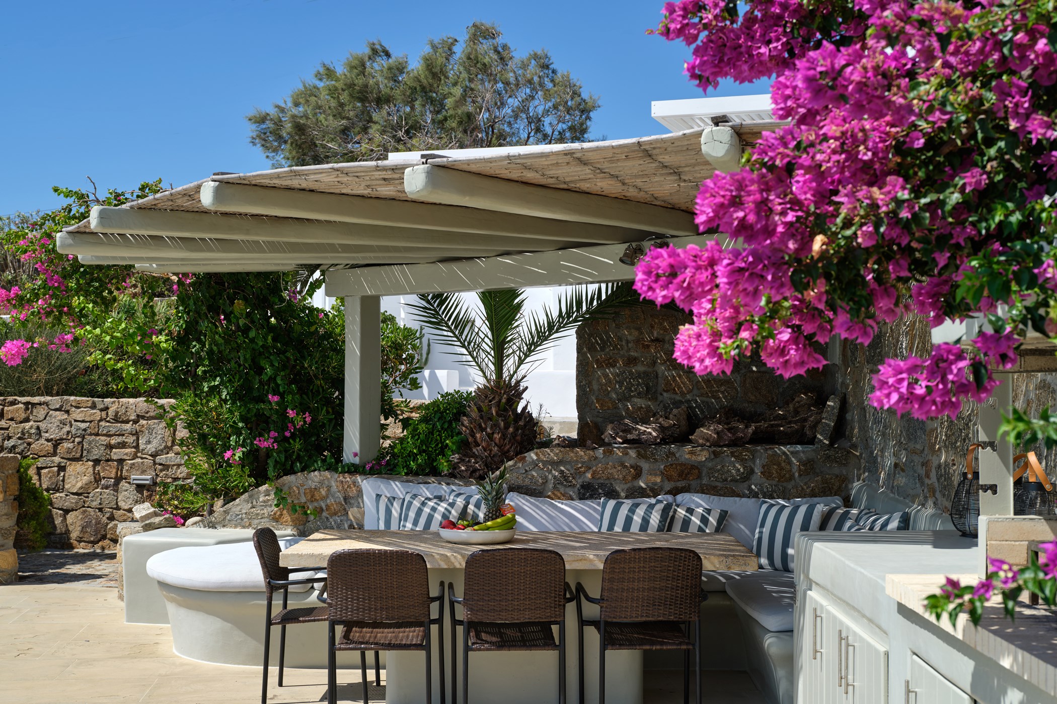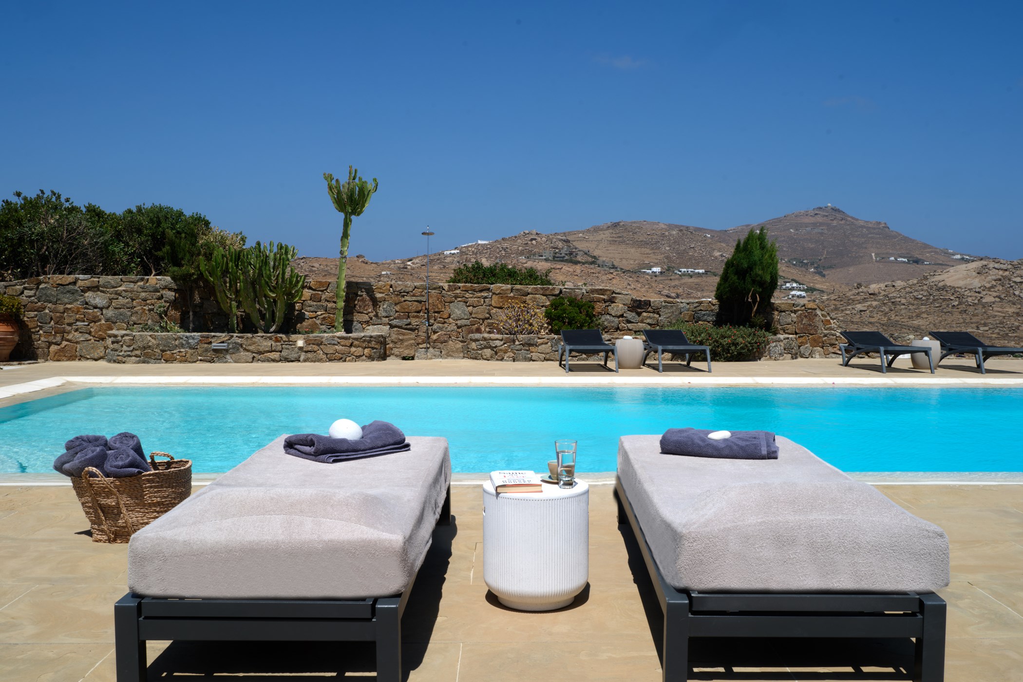 Outside, the villa’s beautiful pool terrace will literally take your breath away as it boasts 360̊ views to the rough plains of the area and the mesmerizing sea. The large swimming pool is surrounded by sun loungers and comfy armchairs that breathe in every inch of the villa’s Mediterranean scenery. Numerous pergola-shaded lounging areas with stone built sofas along with its al fresco dining setting right by the BBQ complement the absolute summer bliss offered by this villa .