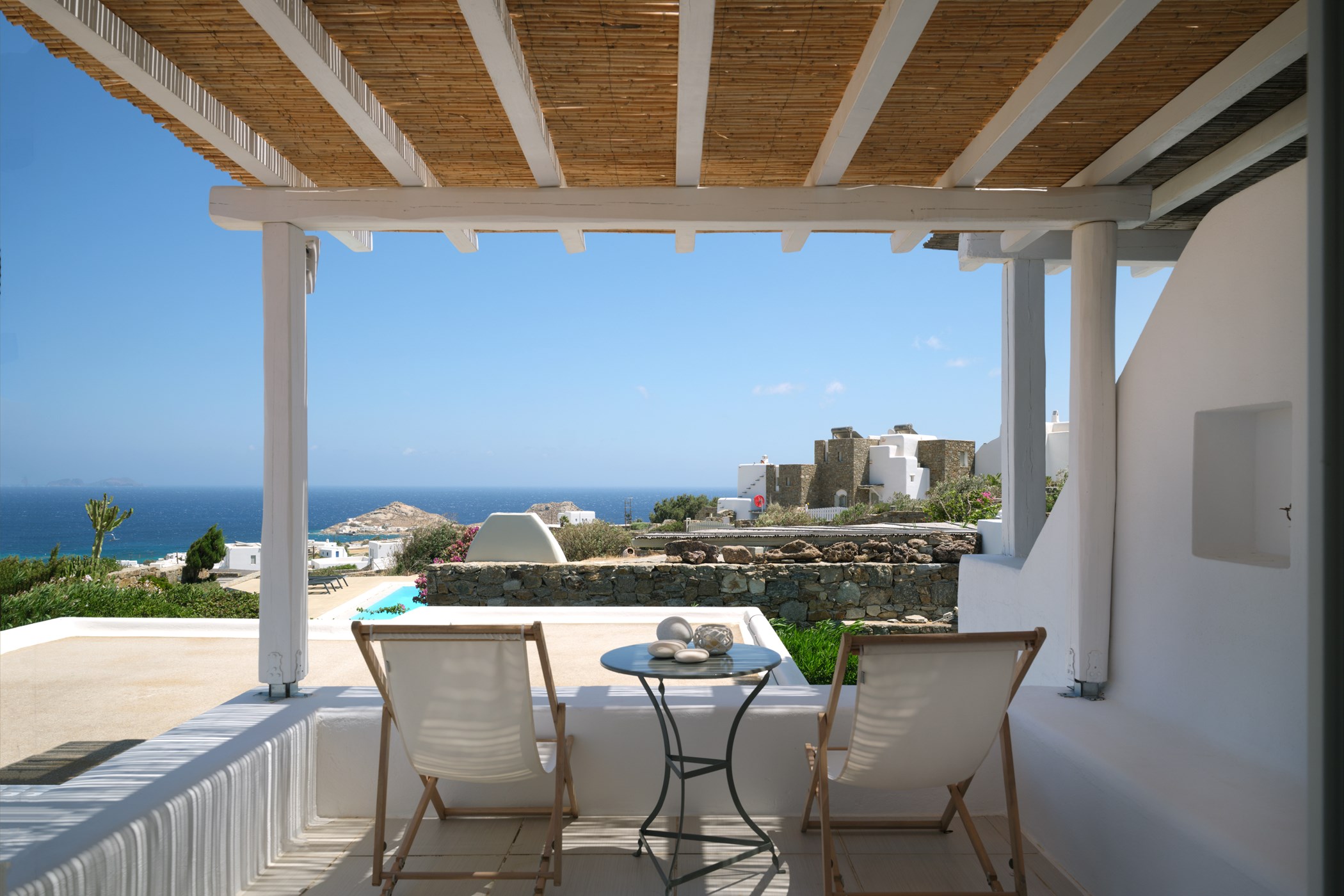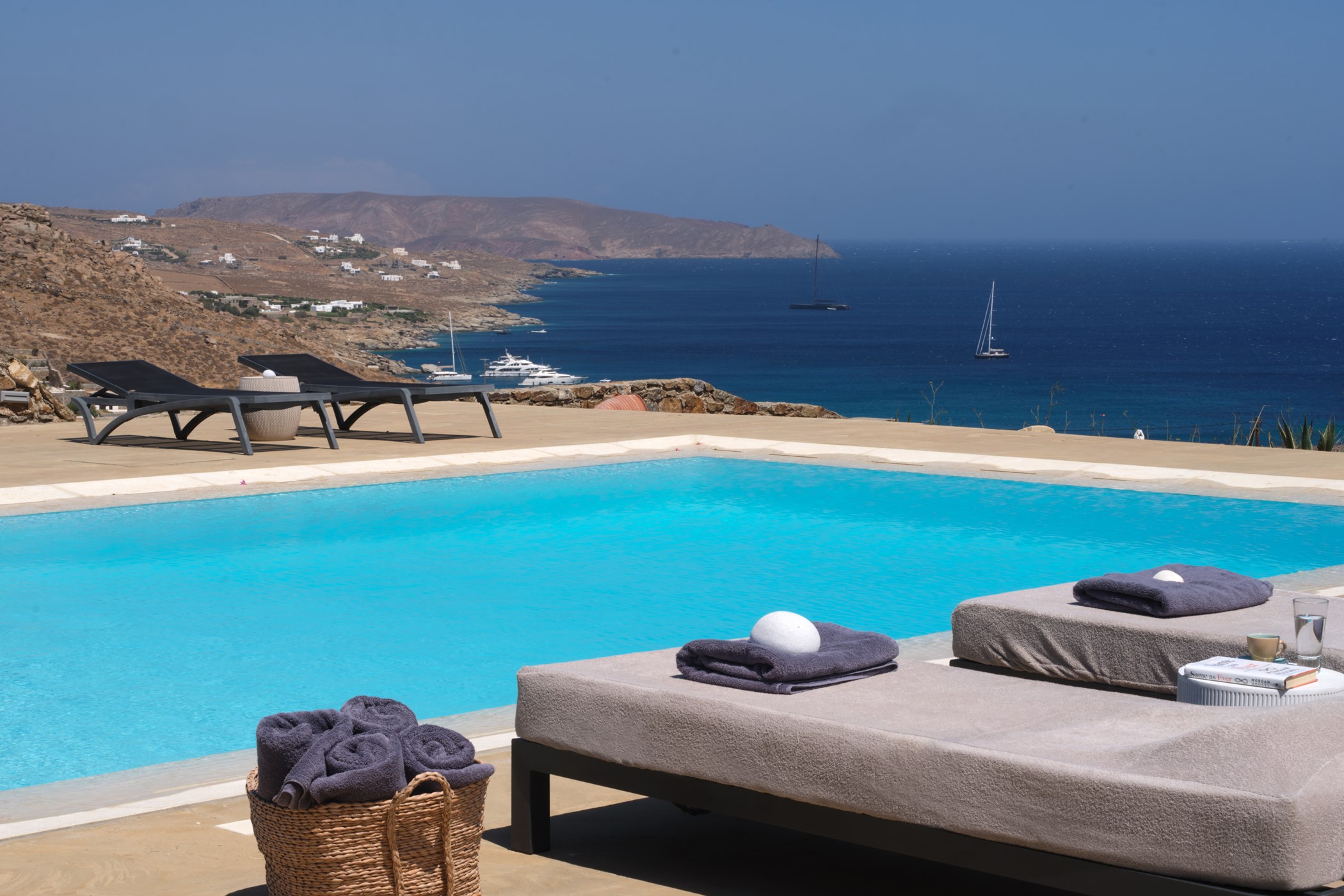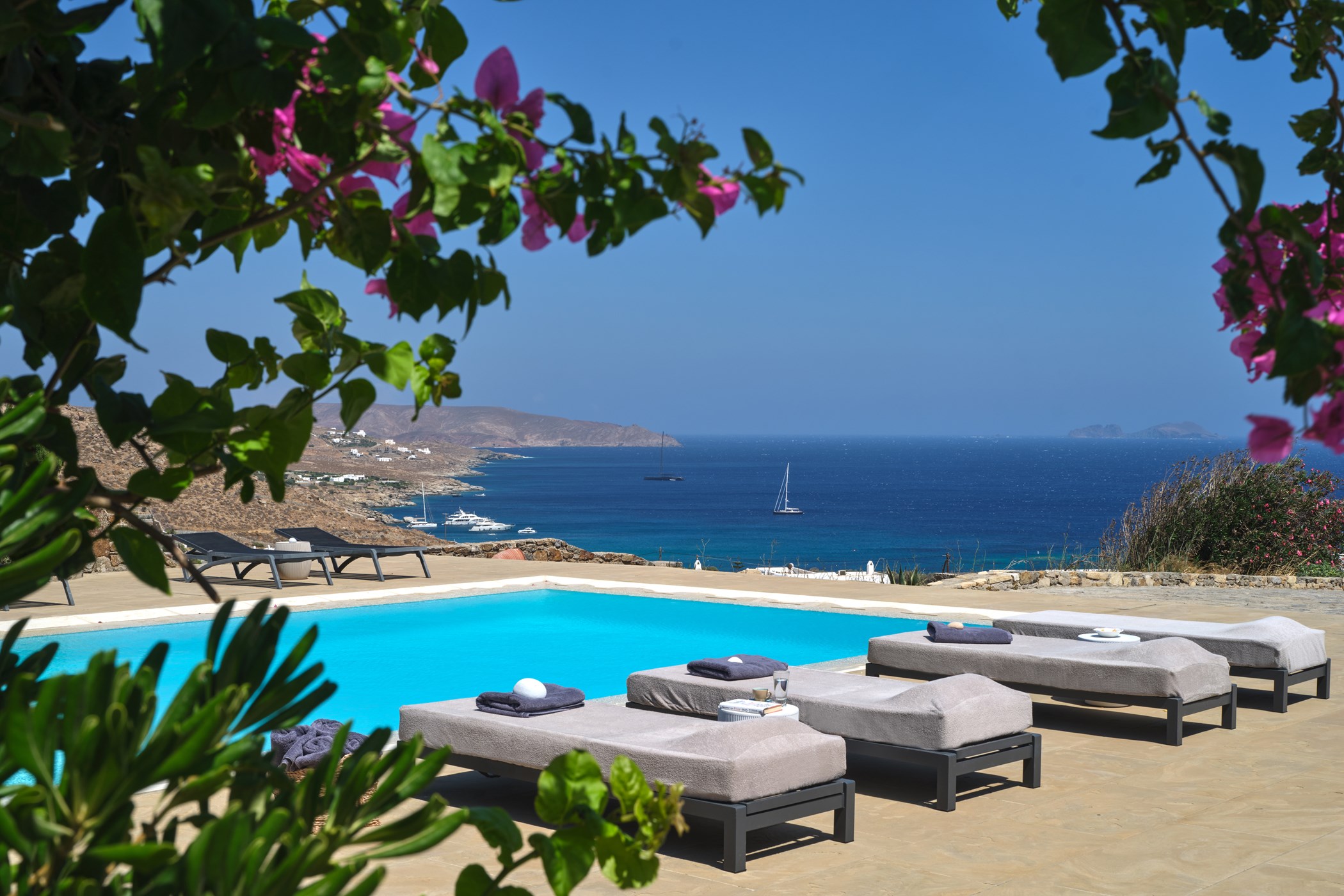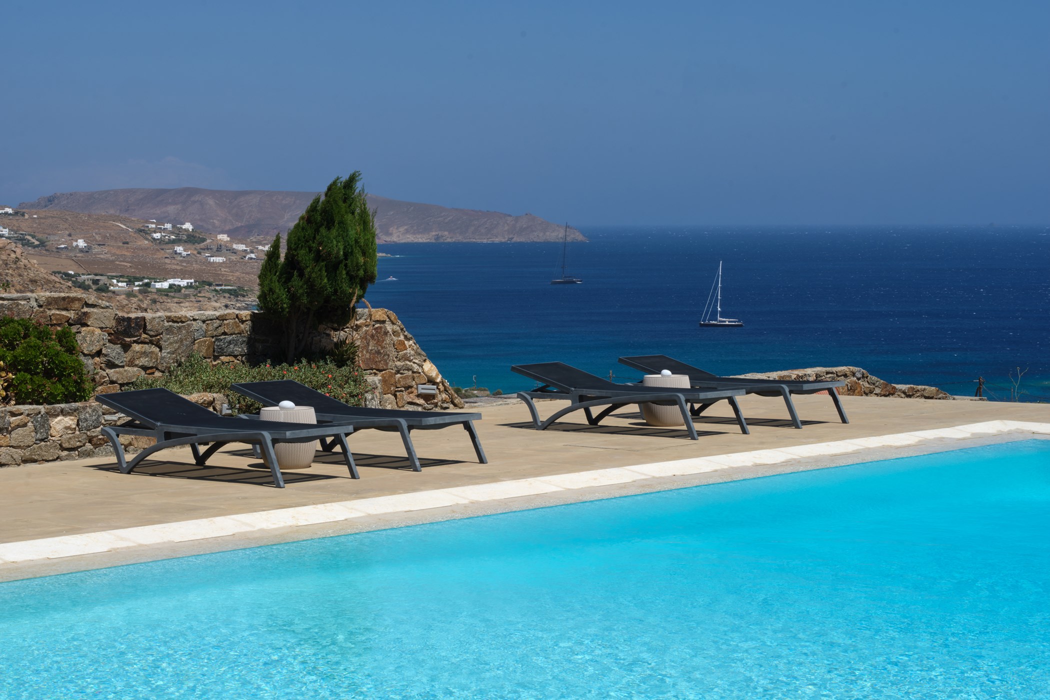 Outside, the villa’s beautiful pool terrace will literally take your breath away as it boasts 360̊ views to the rough plains of the area and the mesmerizing sea. The large swimming pool is surrounded by sun loungers and comfy armchairs that breathe in every inch of the villa’s Mediterranean scenery. Numerous pergola-shaded lounging areas with stone built sofas along with its al fresco dining setting right by the BBQ complement the absolute summer bliss offered by this villa .