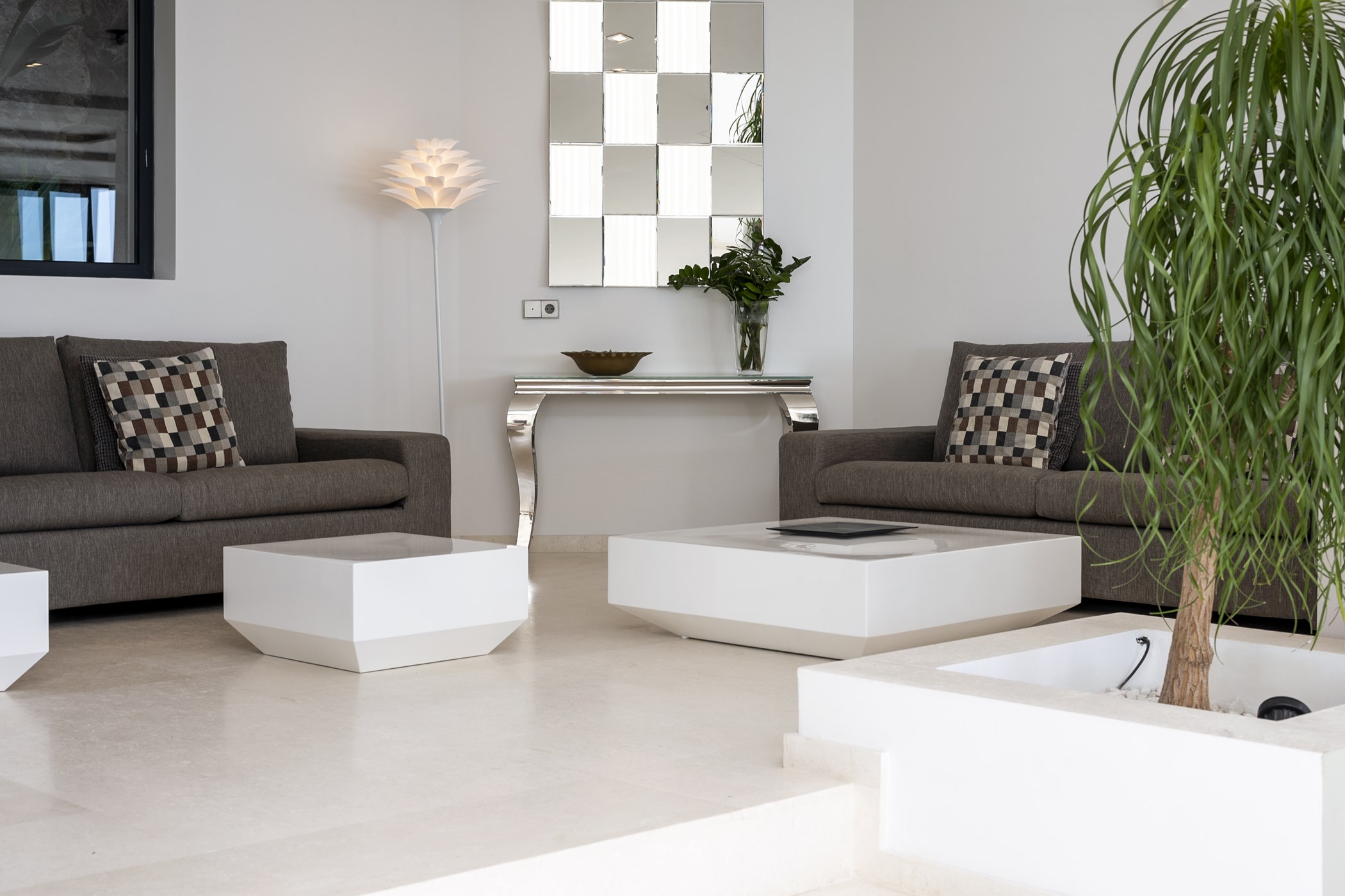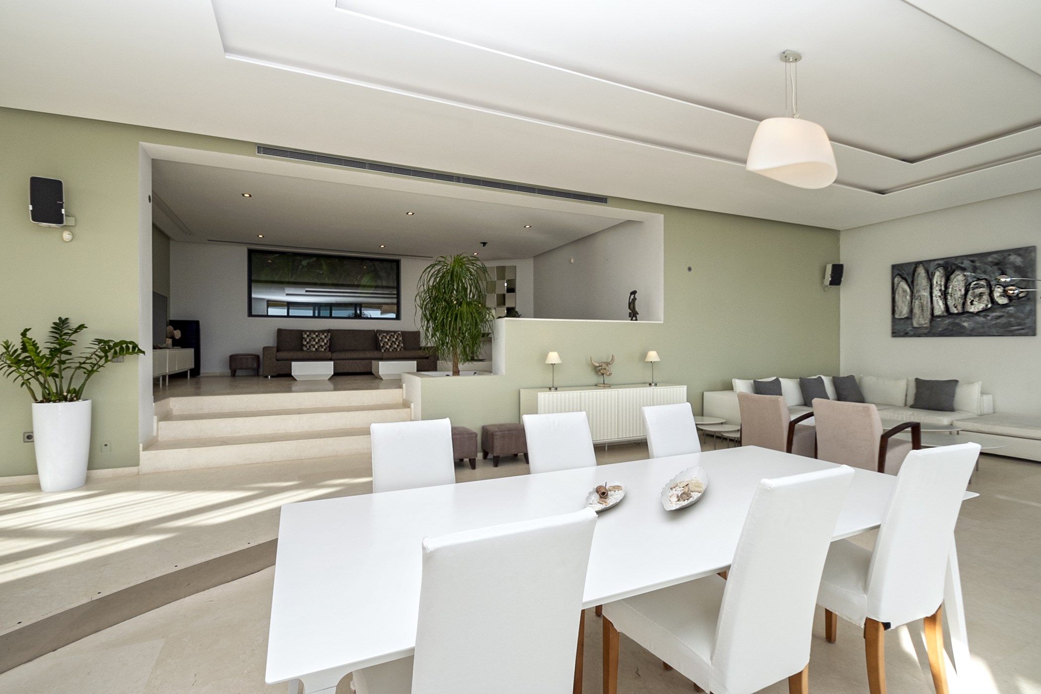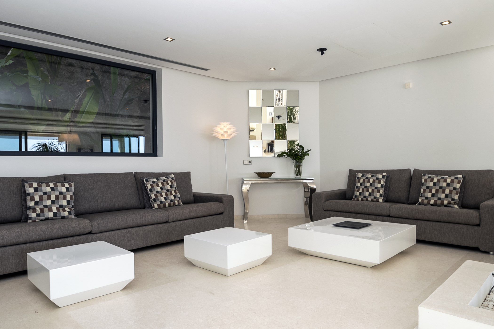 This modern, contemporary villa is polished with cool grey-white interiors and marble floors with an expansive natural flood of sunlight entering through the floor to ceiling windows. As you enter this prestigious property, a unique feature stone wall captivates your attention stretching from the stairway on each level. The first floor is open plan with a casual seated lounge, a second mezzanine lounge, and a formal and second, more relaxed dining area all serviced by the sleek contemporary kitchen.