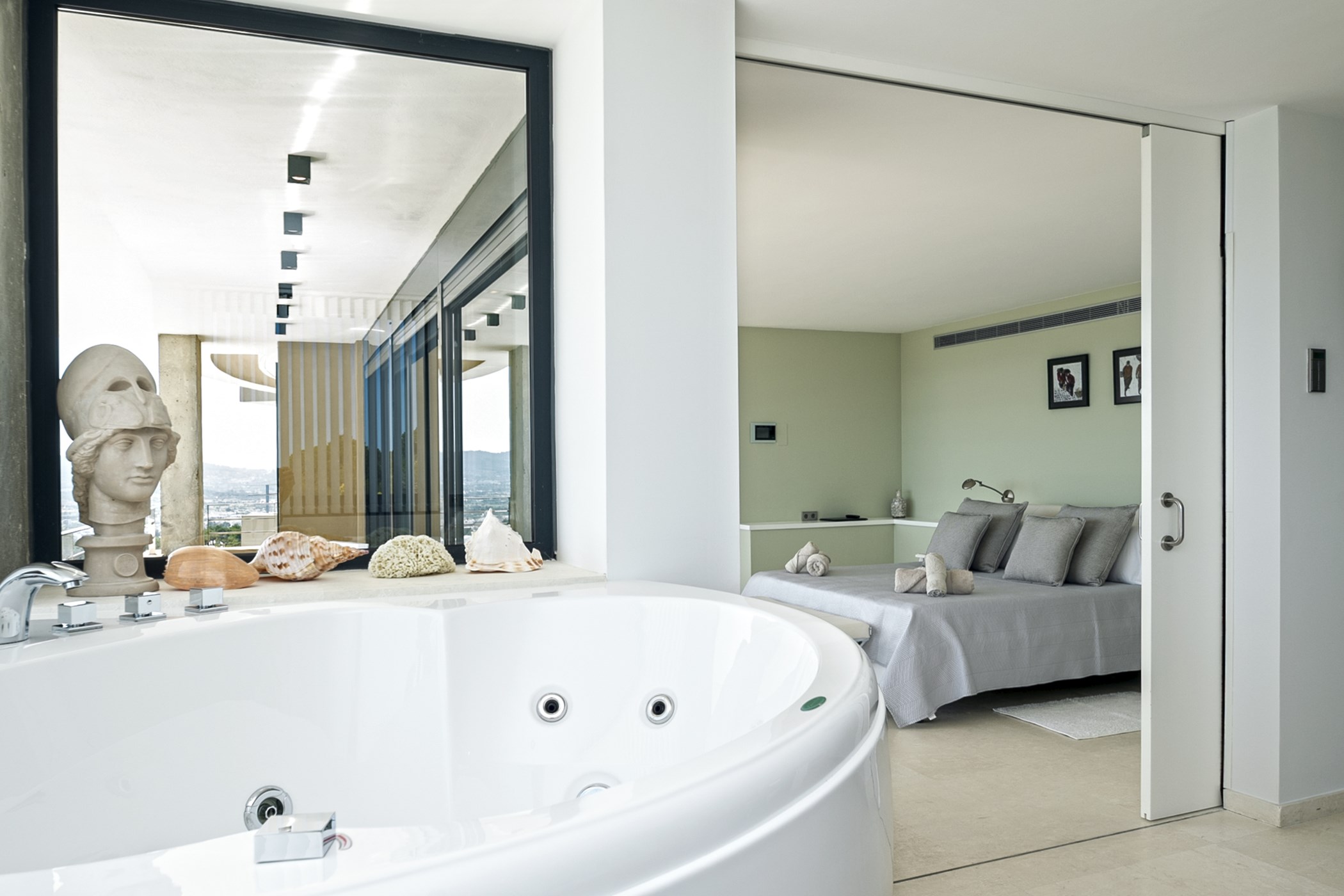 The master suite is resplendent with a king size bed, en-suite bathroom with shower and jetted tub, and access to a private terrace with unrivalled sea views.