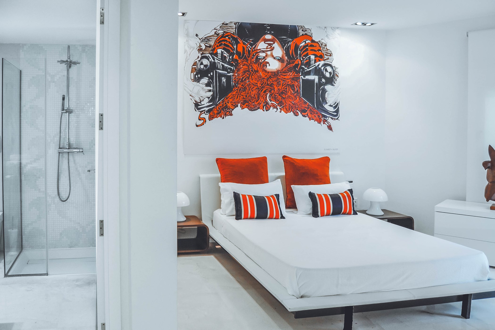 The interiors of Villa Adalyn are elegantly bright with a white backdrop, colourful designer furnishings and decor with pop culture wall hangings and artworks. The main house is designed with a lounge area which enjoys exceptional views, an abundance of comfortable seating, a spacious dining table and a fully equipped modern kitchen. The bedrooms are all en-suite, and there is also a gym and a sauna. The style of the home is elegant and sophisticated throughout.