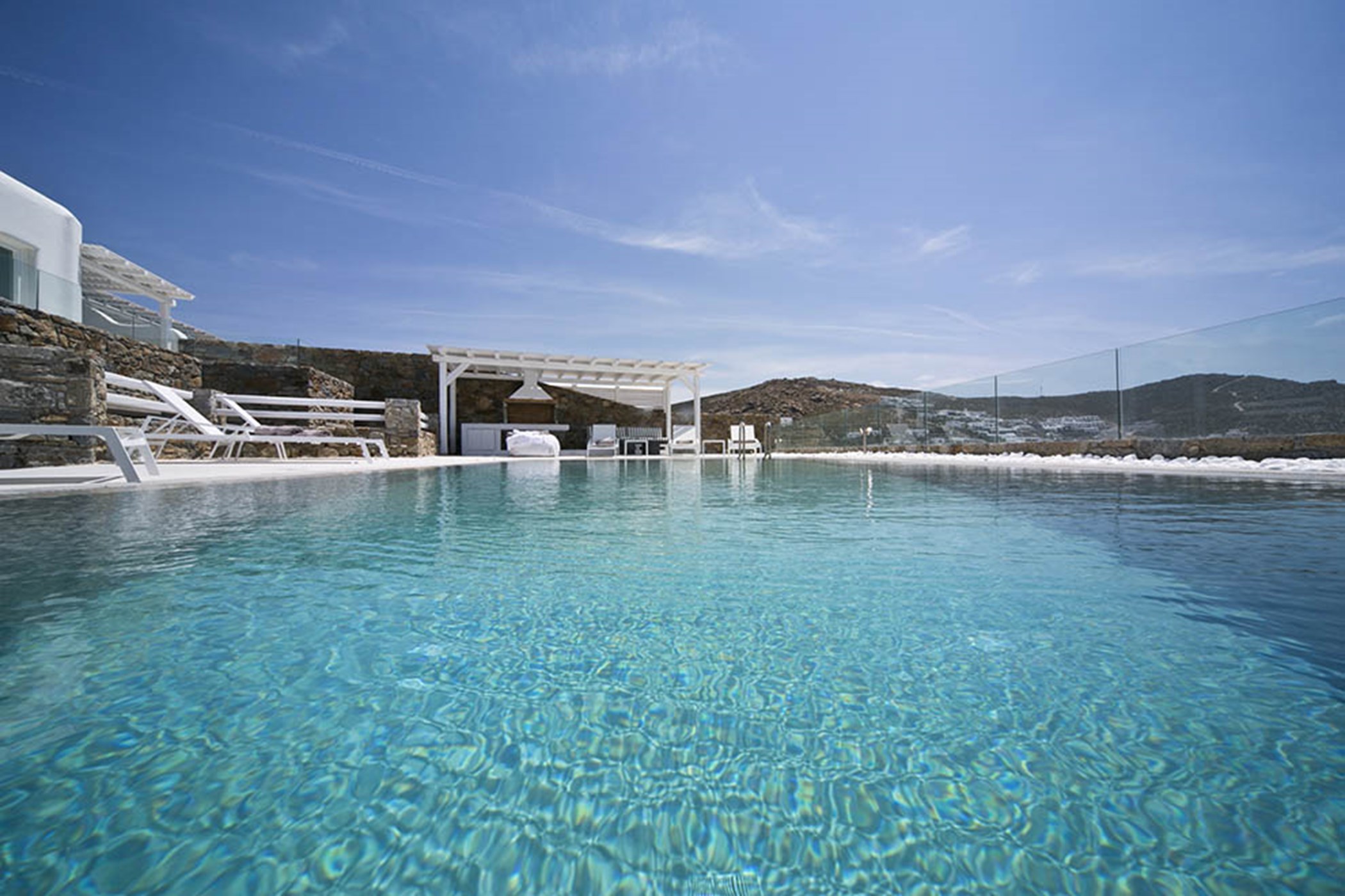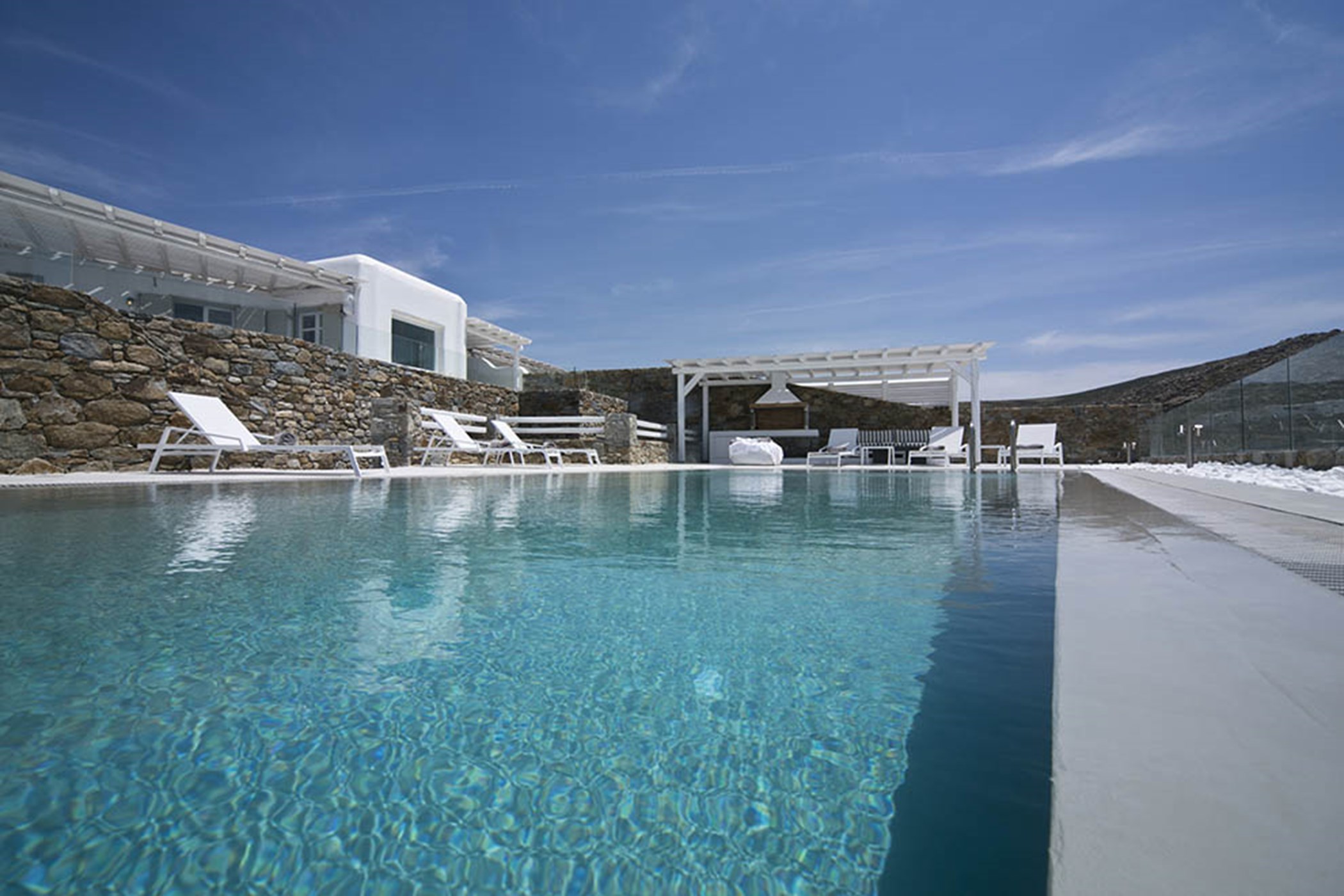 The outdoor area of the villa rental features gorgeous terraces in white wood, a large swimming pool with overflow, pergola-covered sitting and dining areas and a BBQ near to the poolside. Moreover, Villa Ariana is an eco-friendly home as 85% of its assets are fully recyclable and all electric & electronic devices belong to the lowest Energy consumption class, giving it a soft environmental footprint.