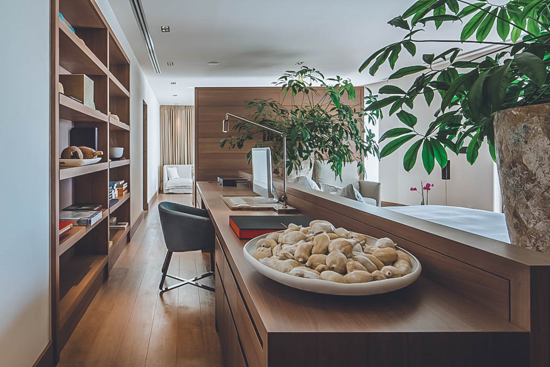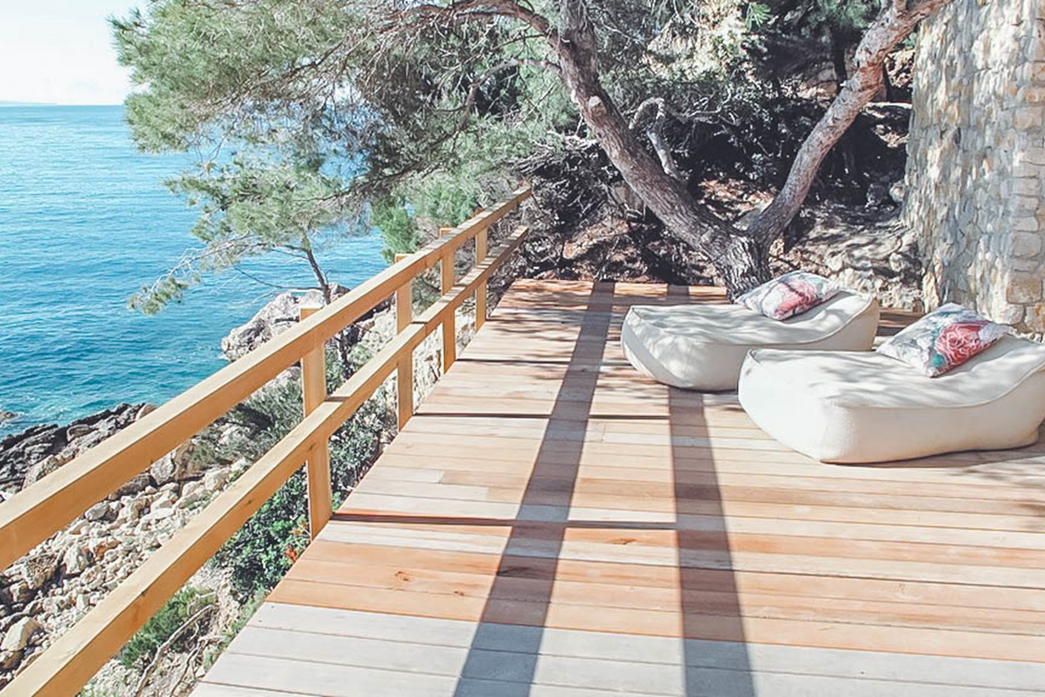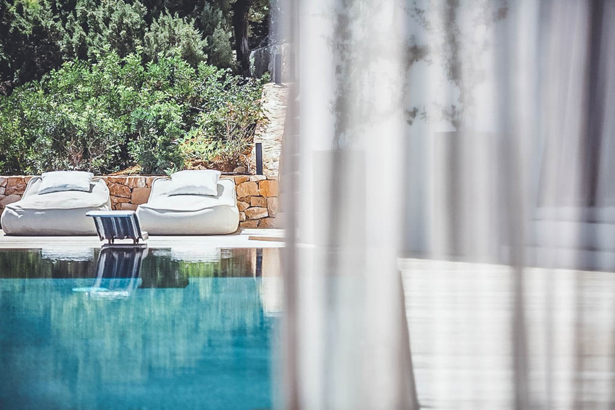 The spectacular infinity pool and carved cliff-side terrace area are the centrepiece of Villa Bailey's breathtaking exteriors. The perfectly maintained gardens are surrounded by terraces with luxurious sunbeds, comfortable shaded seating areas, and authentic al fresco dining spaces. Additionally, the rooftop offers several serene spaces, including a shaded pavilion with a swinging bench.