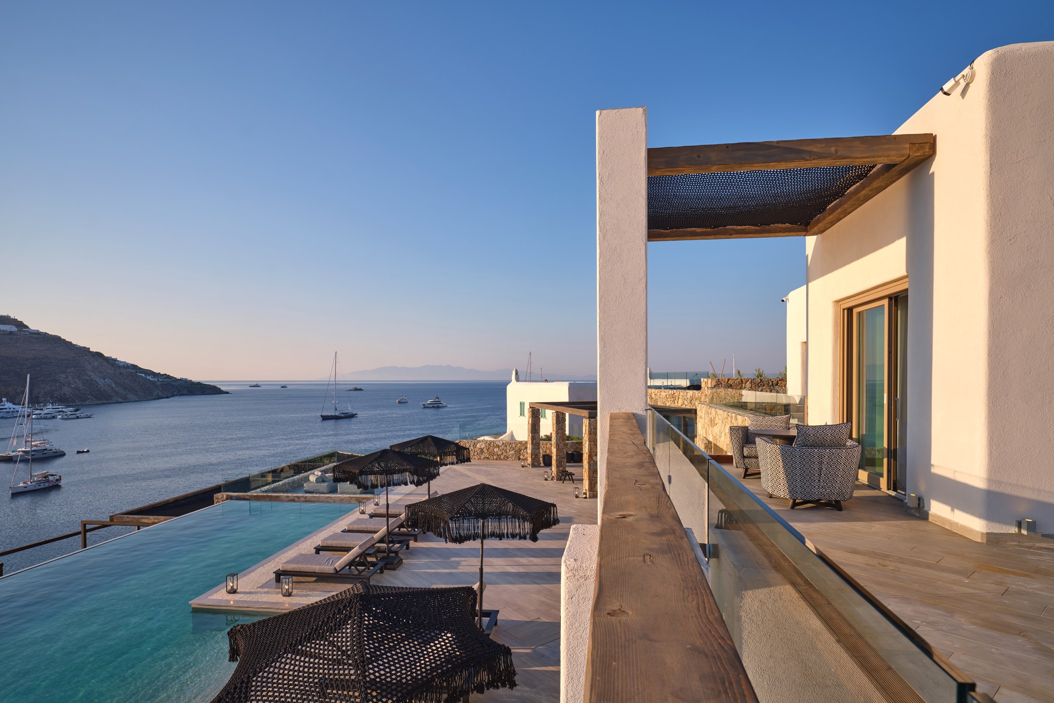 The modern and elegant living room invites you to feel at home. With the warm colors and sophisticated design, dine with style gazing at the sea. Indulge in luxury living and spoil yourself. Unwind your senses, in the exquisite rooms with modern features and stylish patterns. The private mansion boasts expansive areas, elegant style and amazing views, ensures your ultimate Mykonian luxury experience.