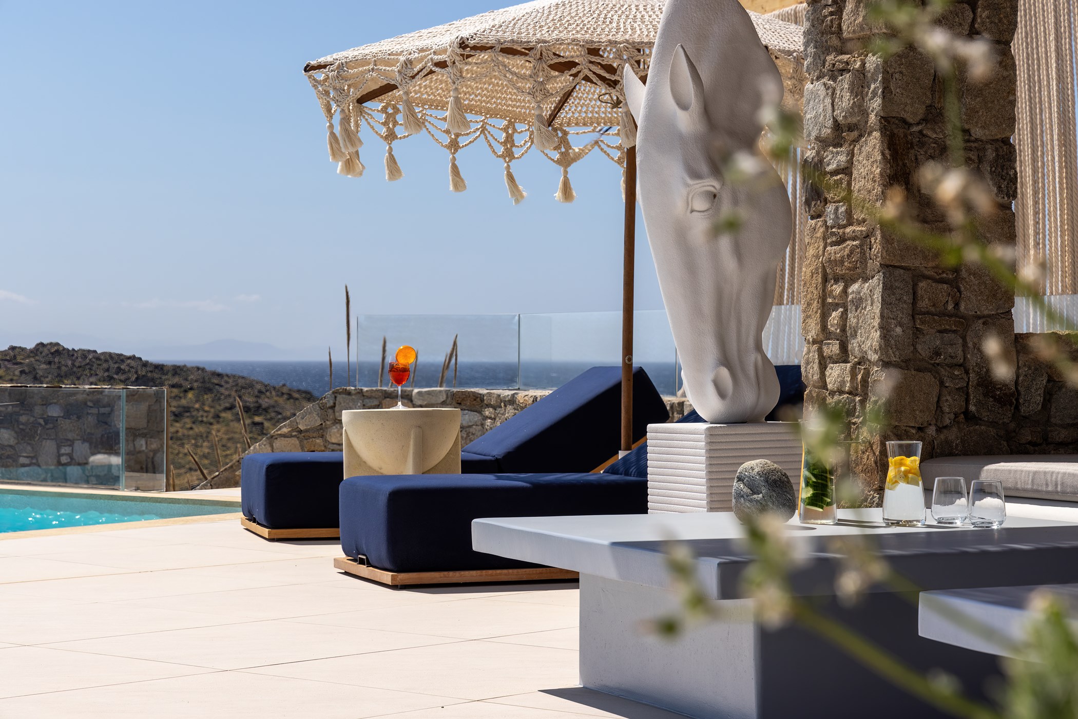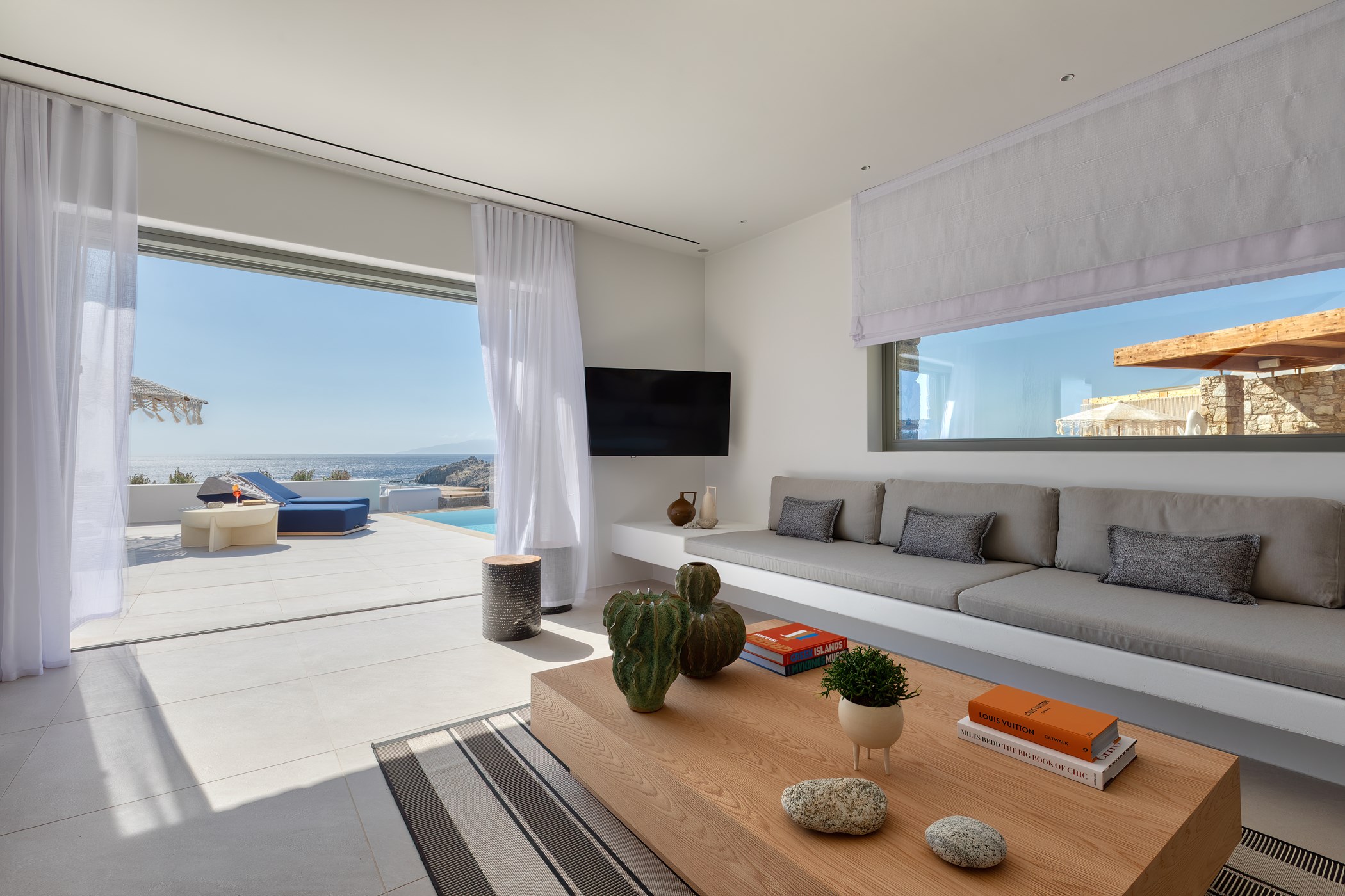 Spanning 700 m2, this haven grants direct access to Nammos and Scorpios, just 1.5 sea miles away. Mykonos city is a mere 5 km drive (5km from Nammos, 7km from Scorpios & 10km from Principote).