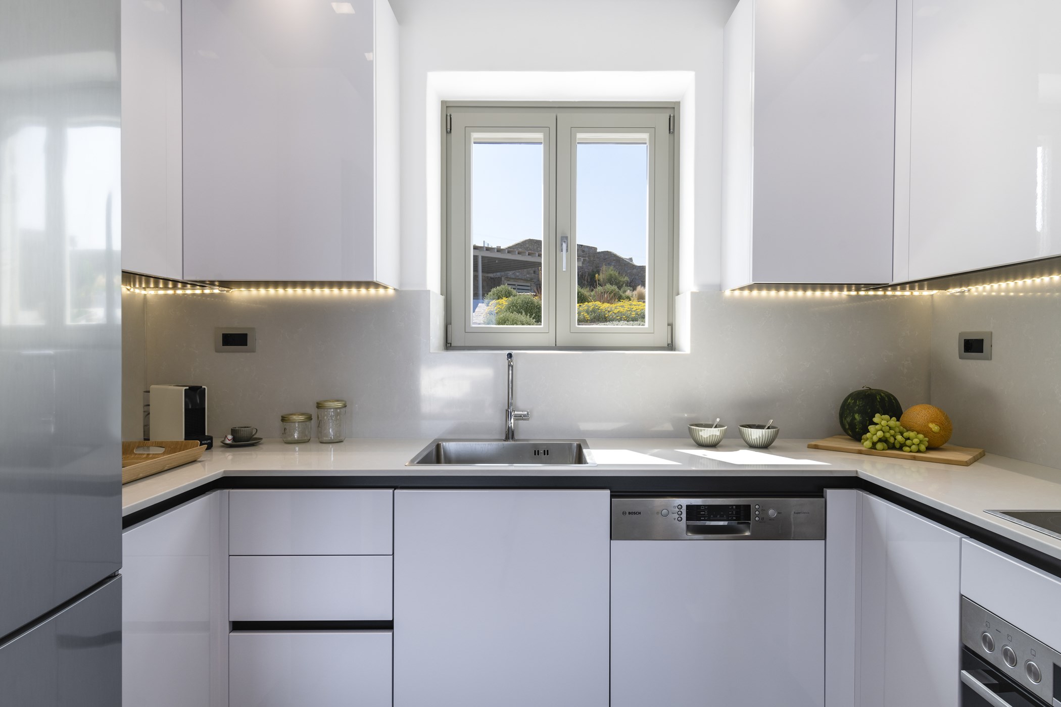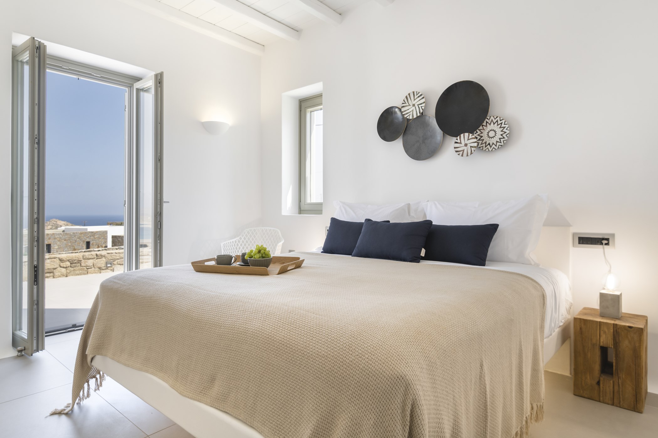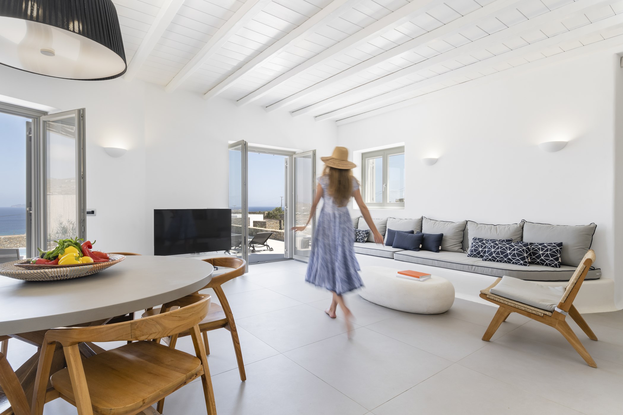 Step inside the beautiful home to discover three double bedrooms, two of them en-suite, providing a comfortable retreat for up to 6 guests. The interiors boast an elegant fusion of contemporary decor with minimalist accents. Enjoy the bright living room and dining area, both offering stunning sea views, while the carefully curated details in the bedrooms evoke an atmosphere of refined elegance and comfort.