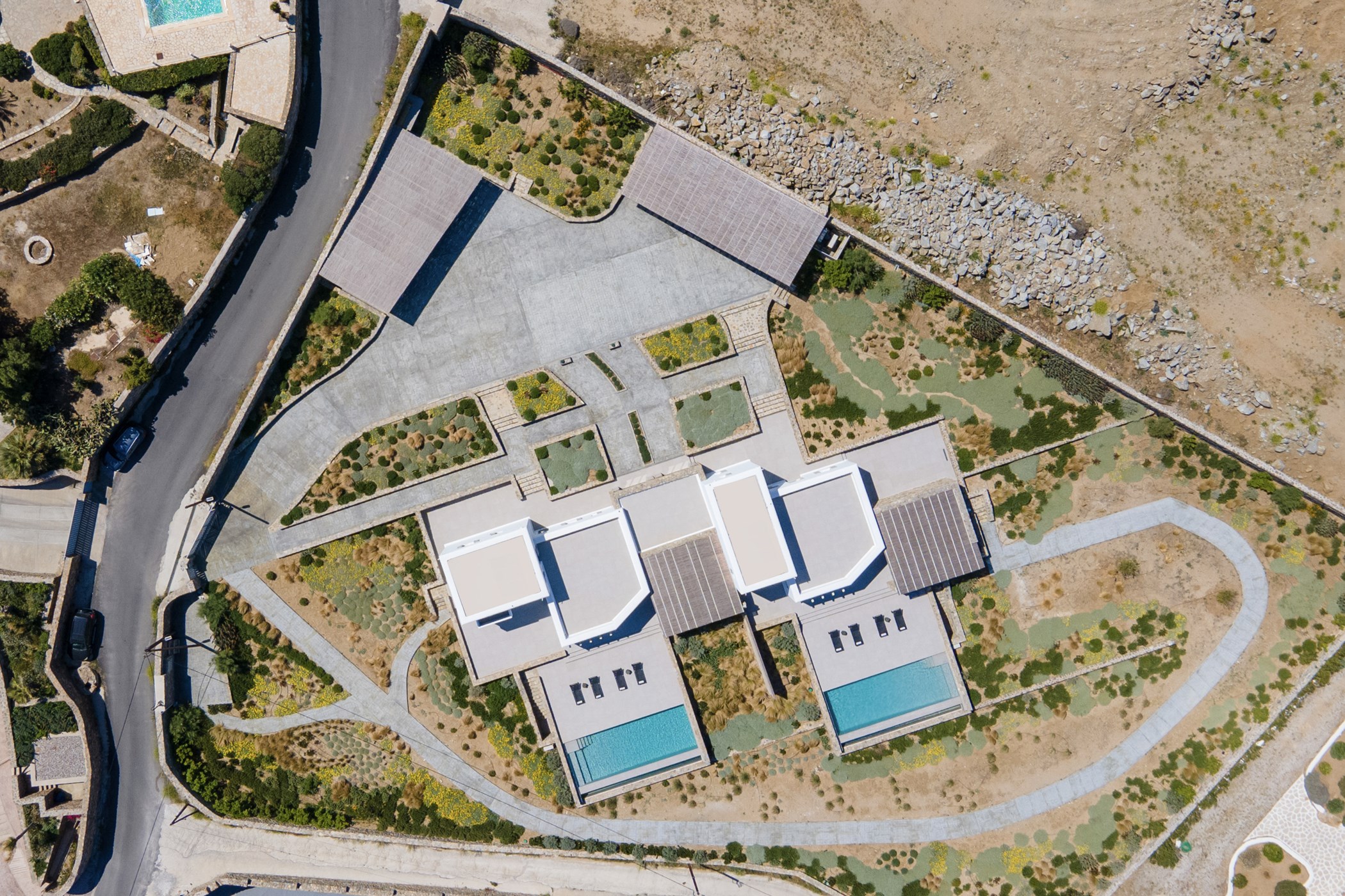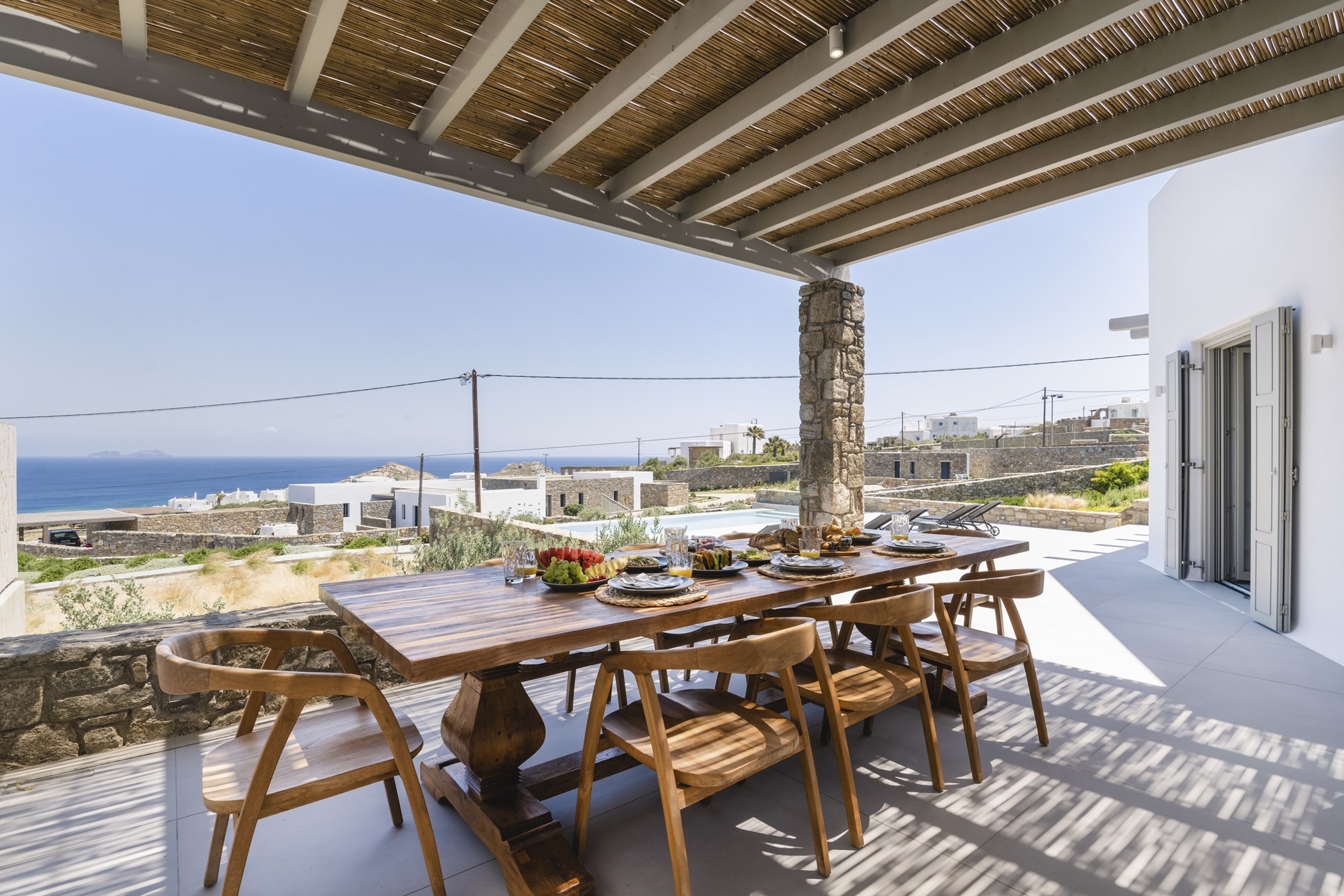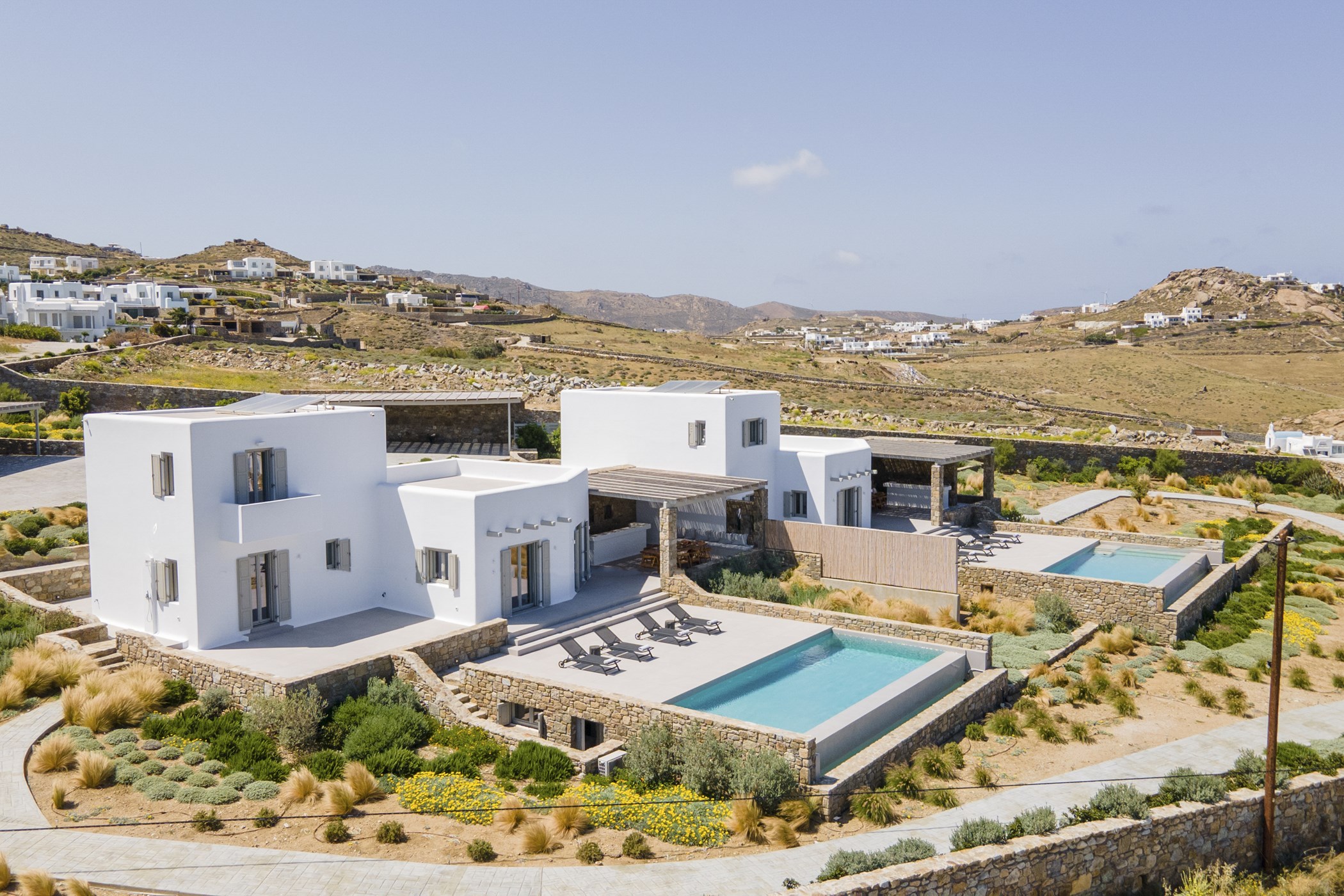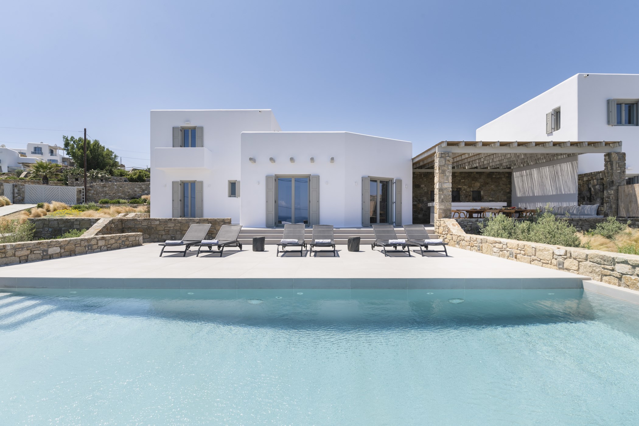 Immerse yourself in the luxury of Villa Cherine's outdoor spaces, just steps from the sea, where every moment is adorned with breathtaking views of the Aegean's natural beauty. The villa shares its idyllic setting with Villa Claire, both standing proudly on a sprawling 4,700 sqm plot, ensuring each retains its privacy and independence.
