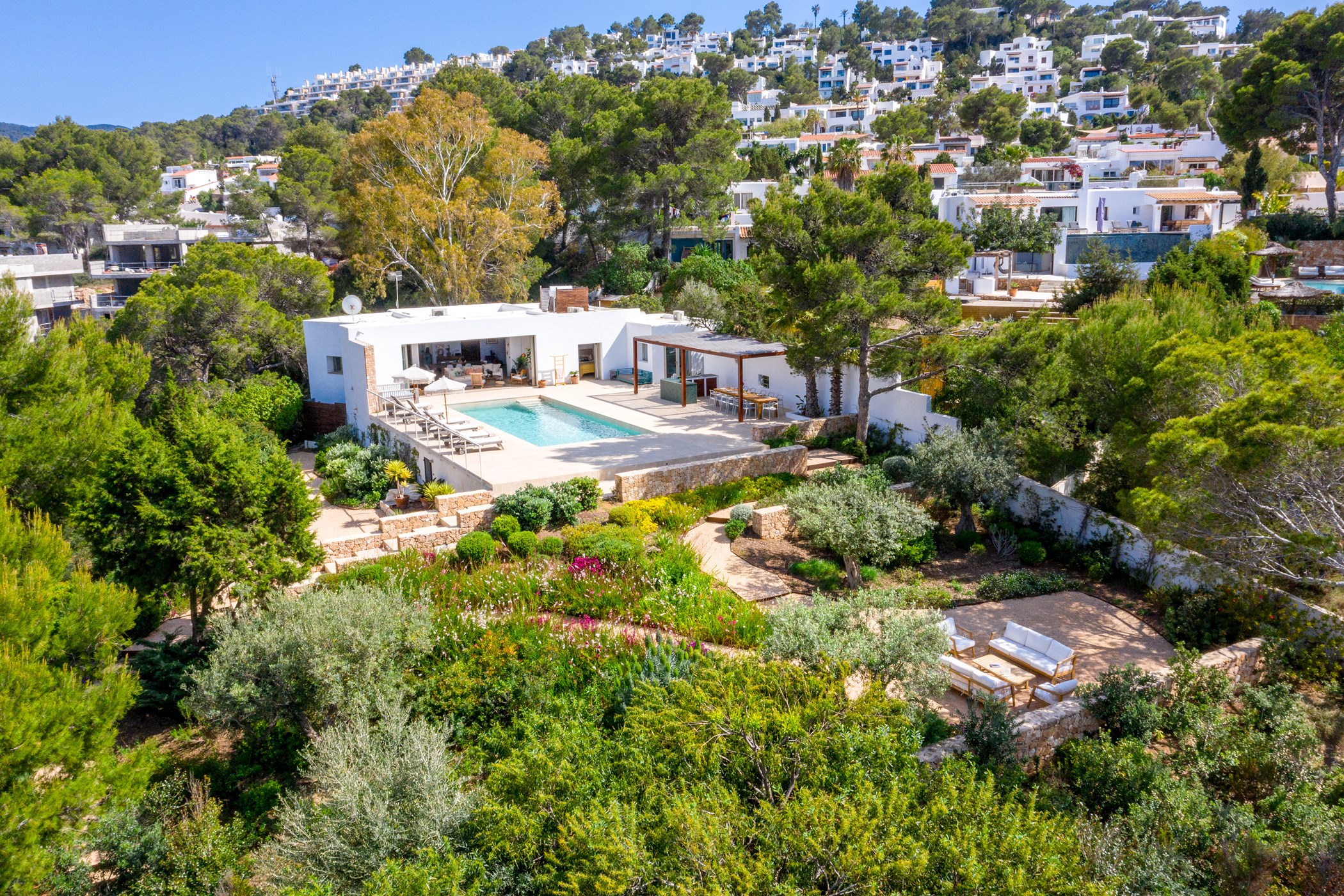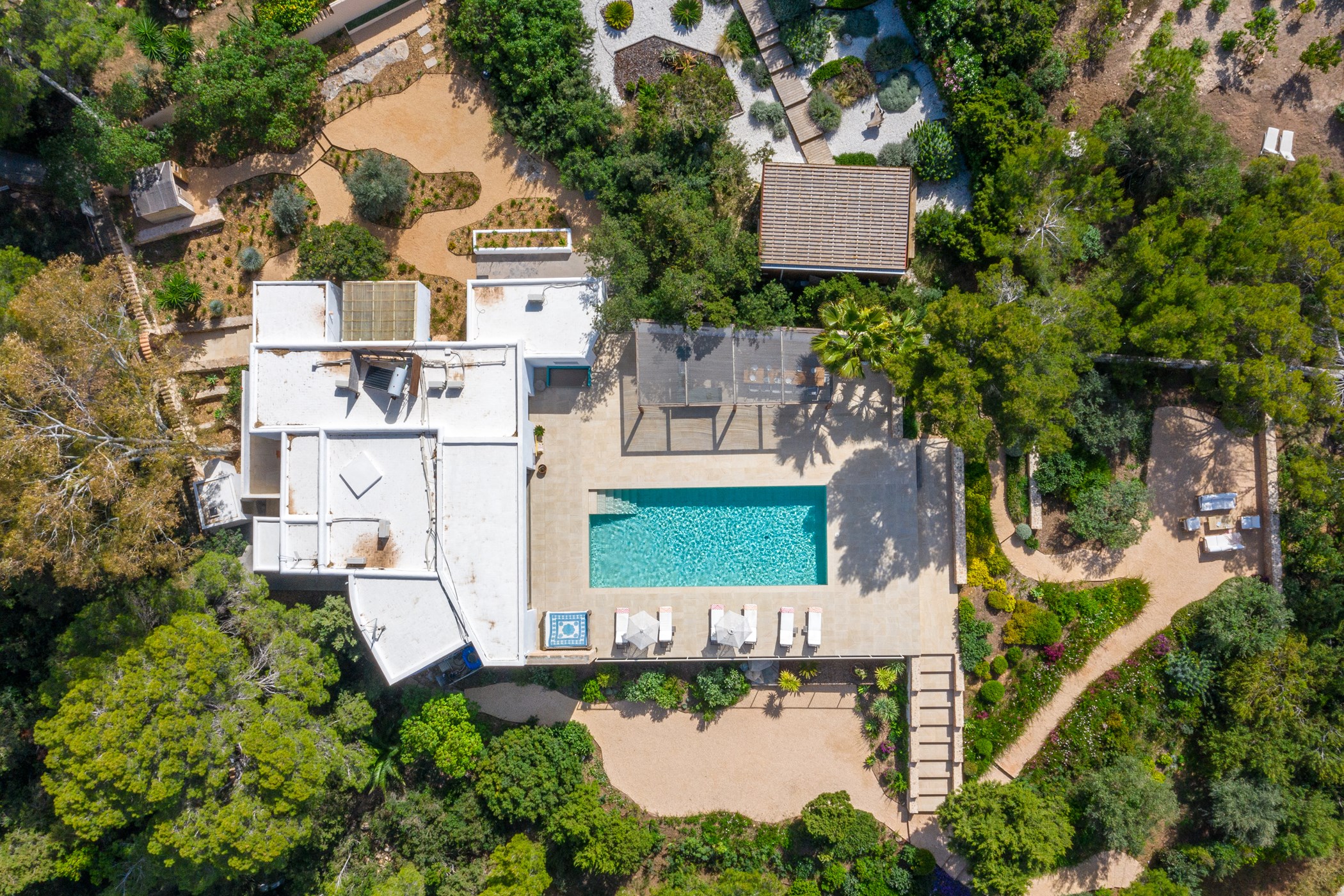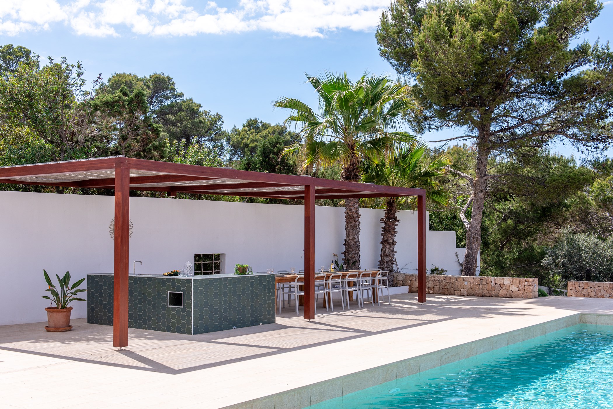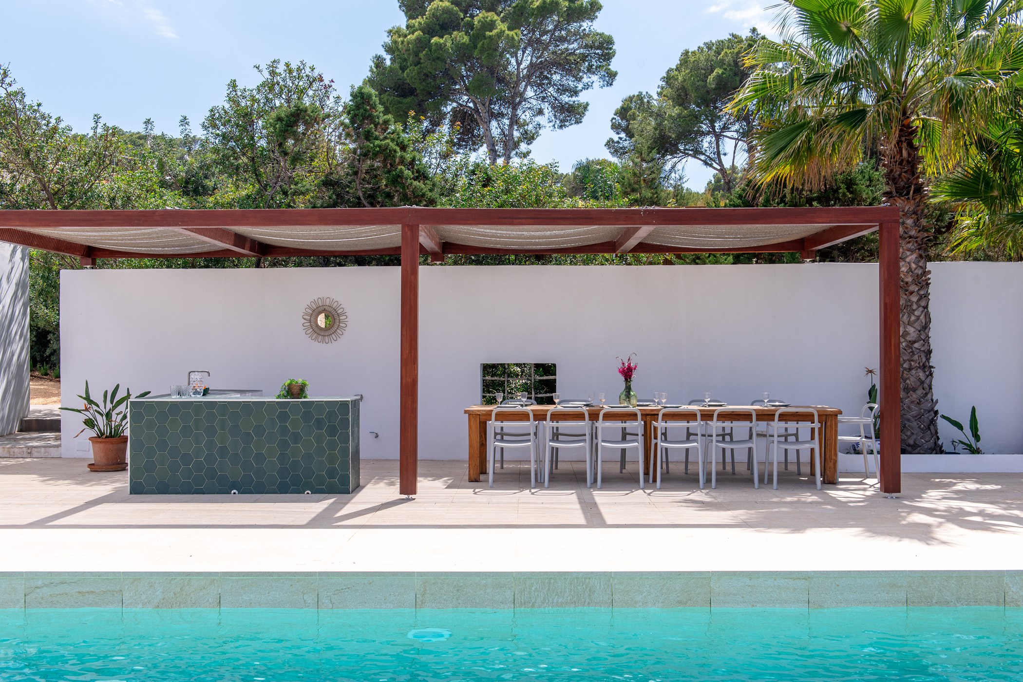 The exterior boasts a welcoming Mediterranean garden with vibrant colors and several chill-out areas, perfect for socializing with family and friends or enjoying some quiet time alone. The garden features a large pool with sunbeds, an outdoor covered dining area with a barbecue, and a spacious table for everyone to gather and enjoy local specialties.