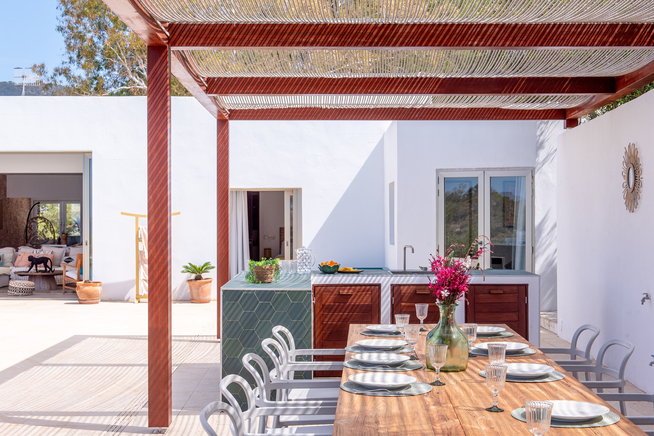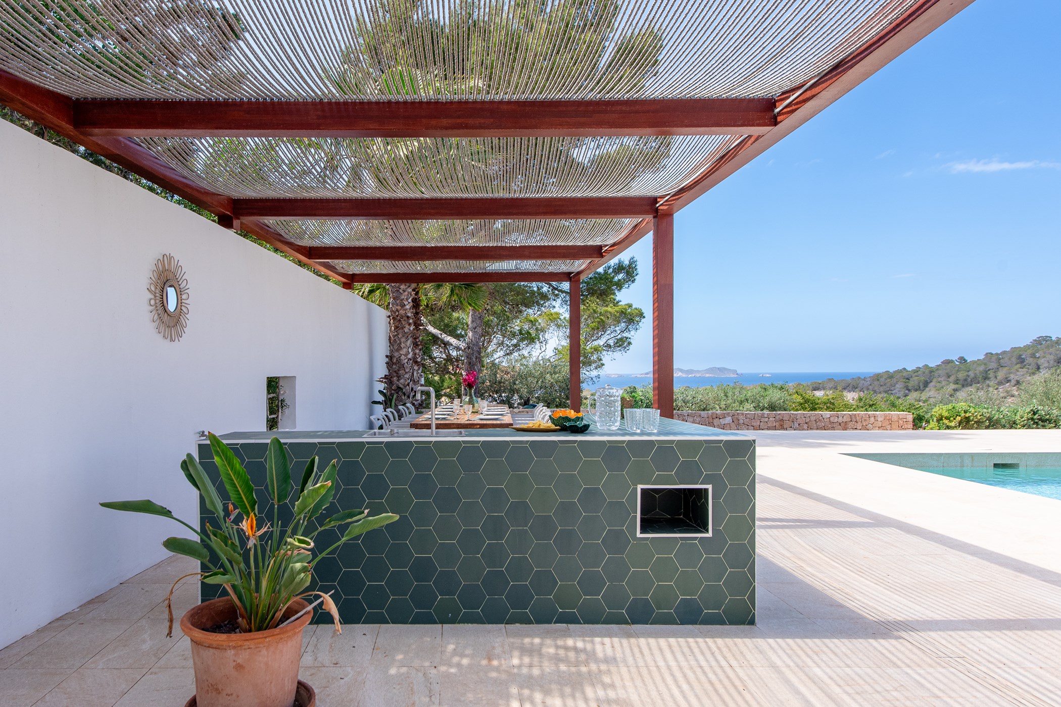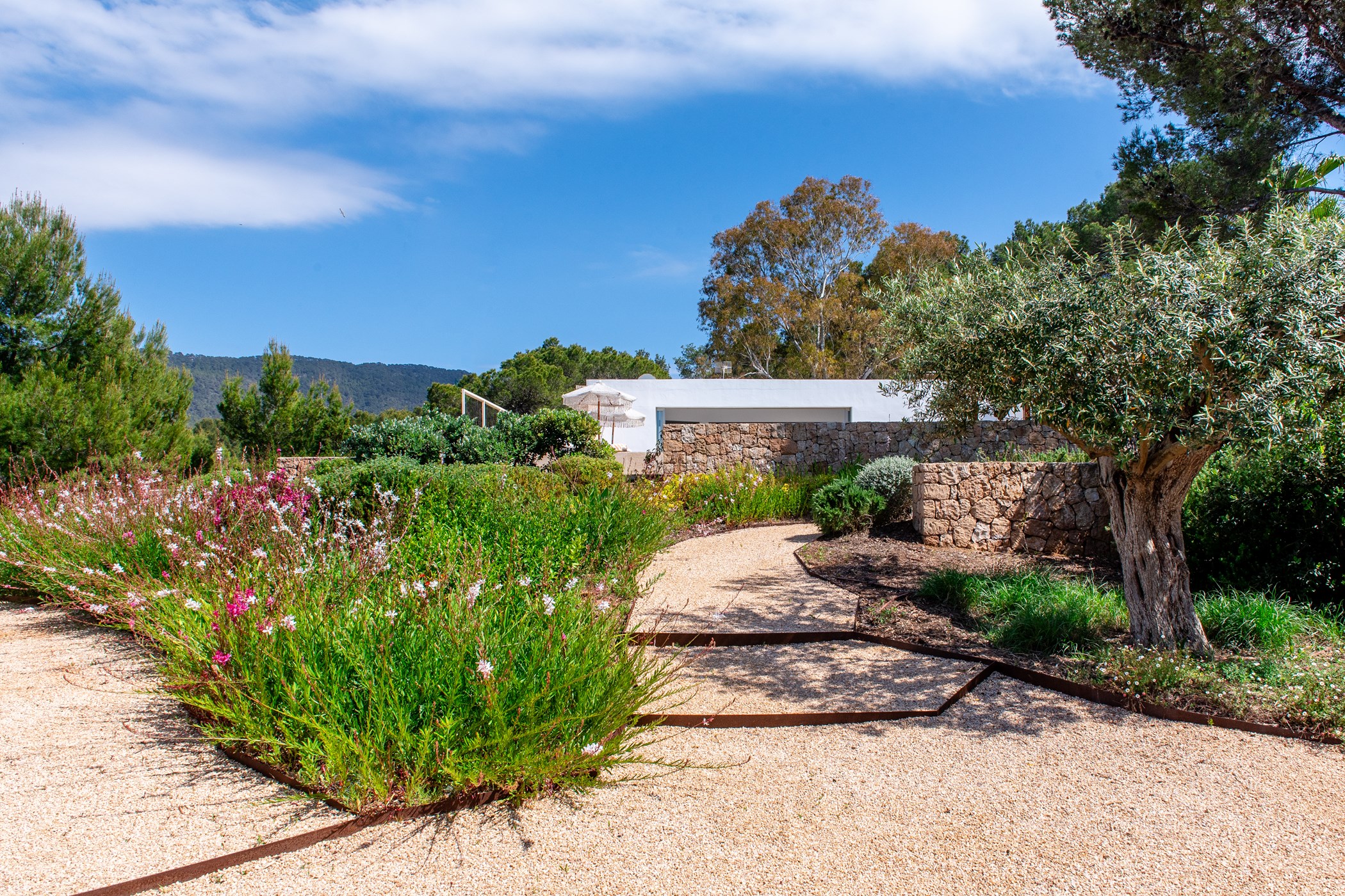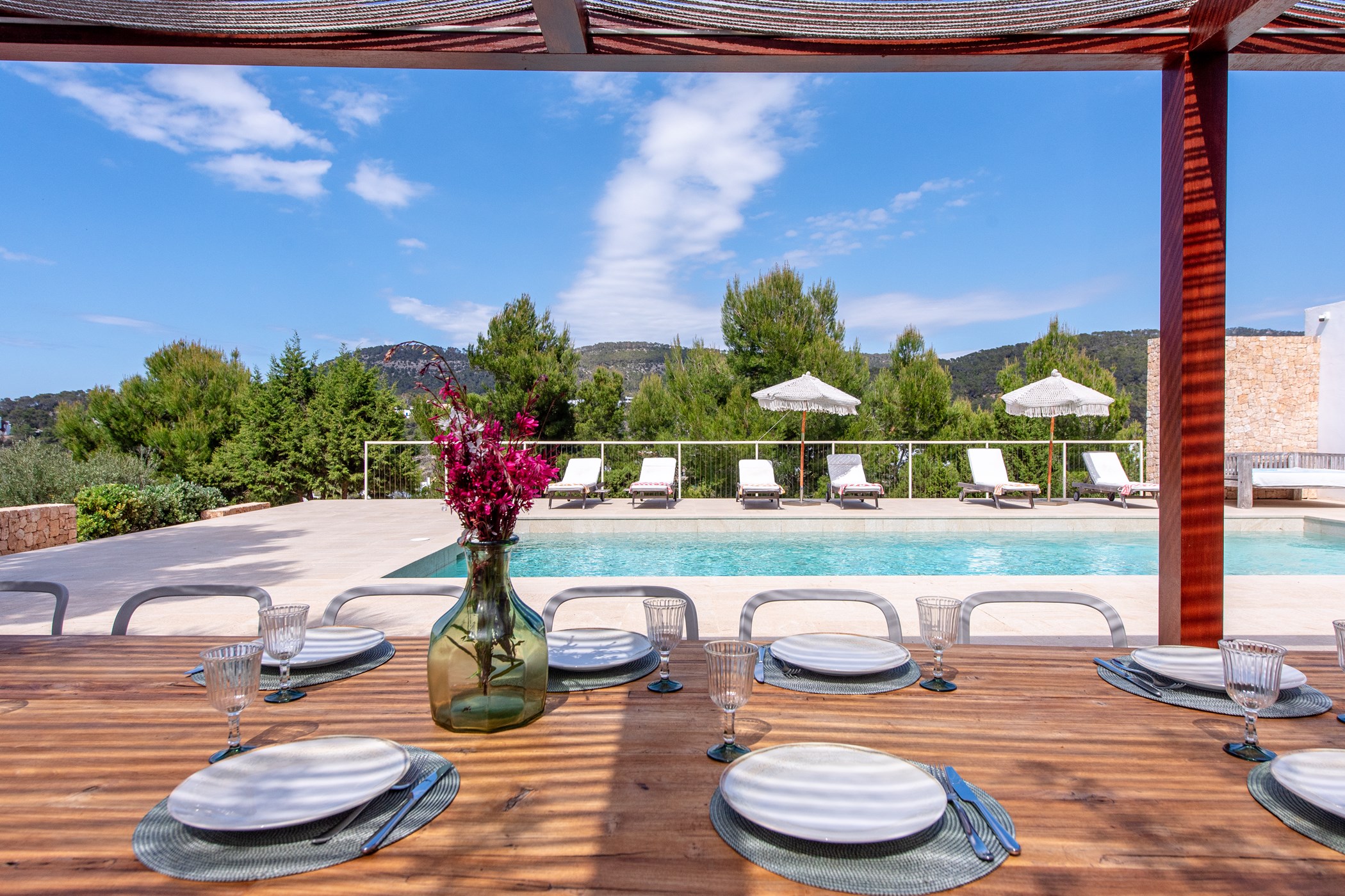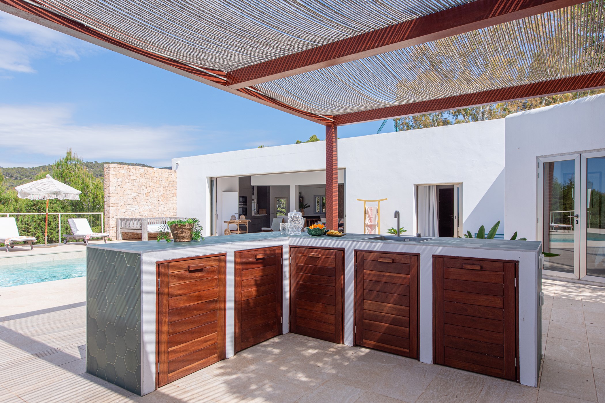 The exterior boasts a welcoming Mediterranean garden with vibrant colors and several chill-out areas, perfect for socializing with family and friends or enjoying some quiet time alone. The garden features a large pool with sunbeds, an outdoor covered dining area with a barbecue, and a spacious table for everyone to gather and enjoy local specialties.