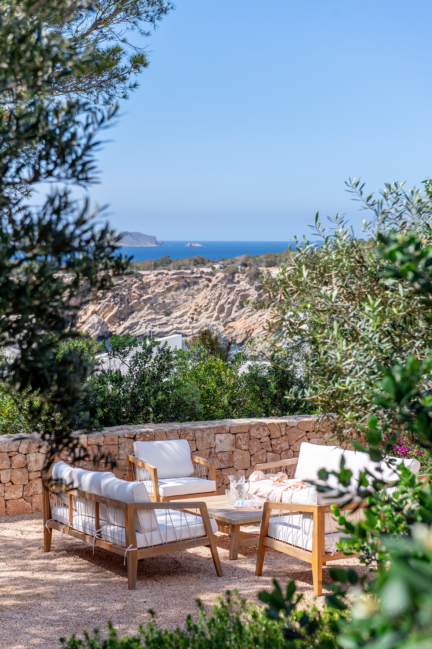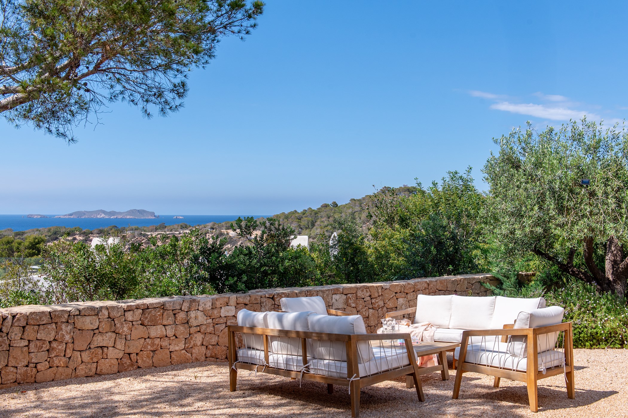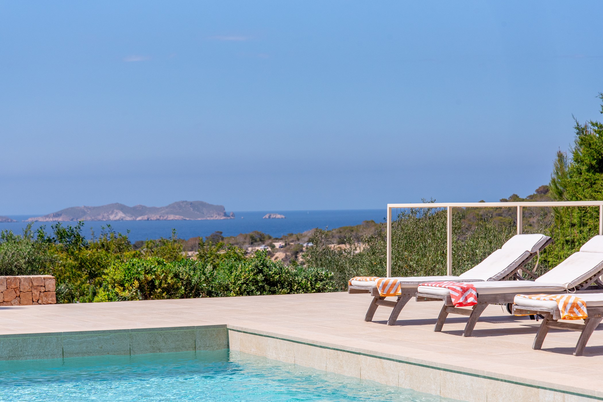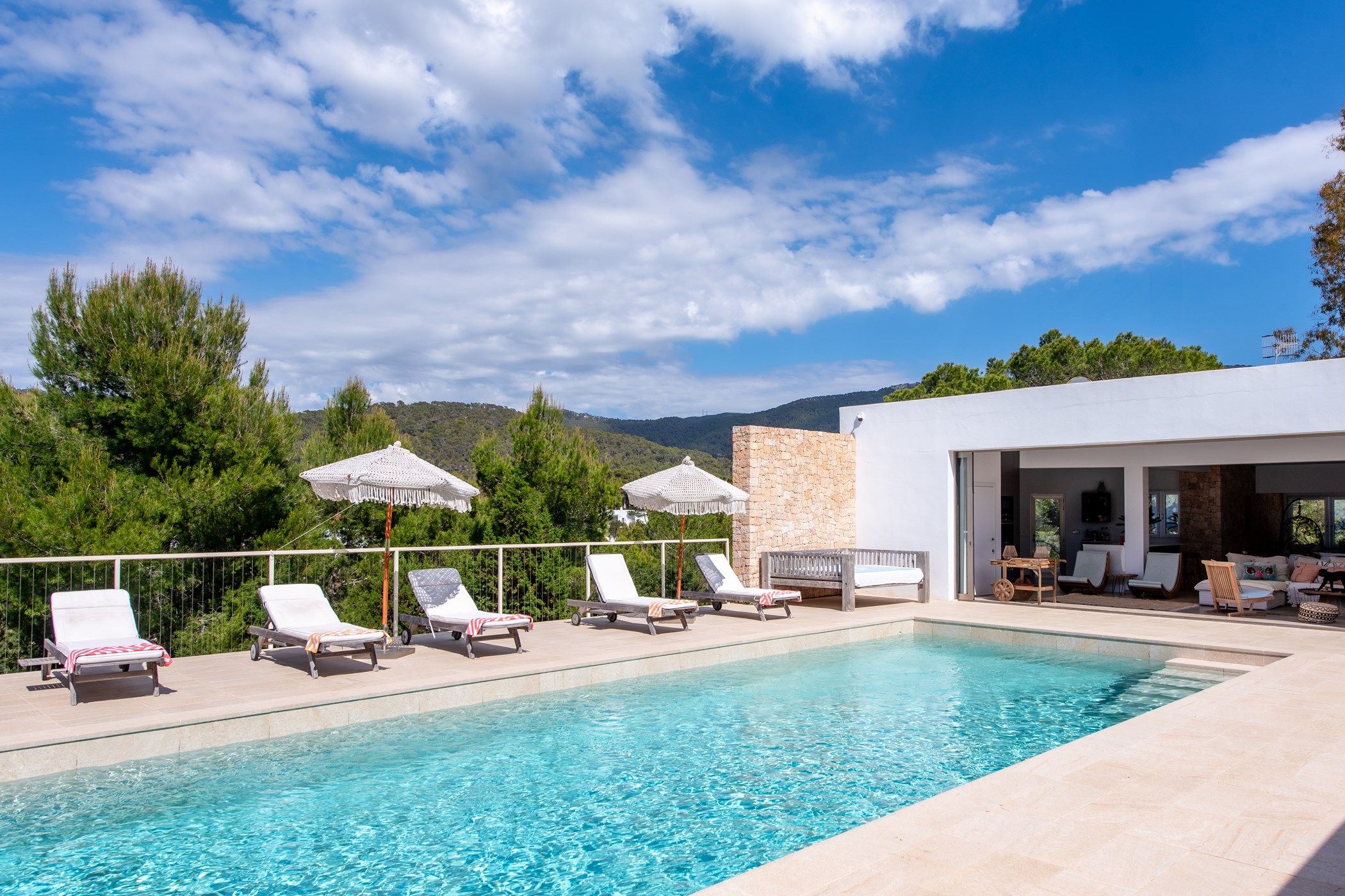 The villa accommodates up to 8 guests with 4 bedrooms in the main house and an additional independent bedroom that can be used for staff. The interior features a spacious living area with large sliding doors that open to the pool area, offering breathtaking sea views and sunsets. The fully equipped open kitchen provides everything you need for a comfortable stay.