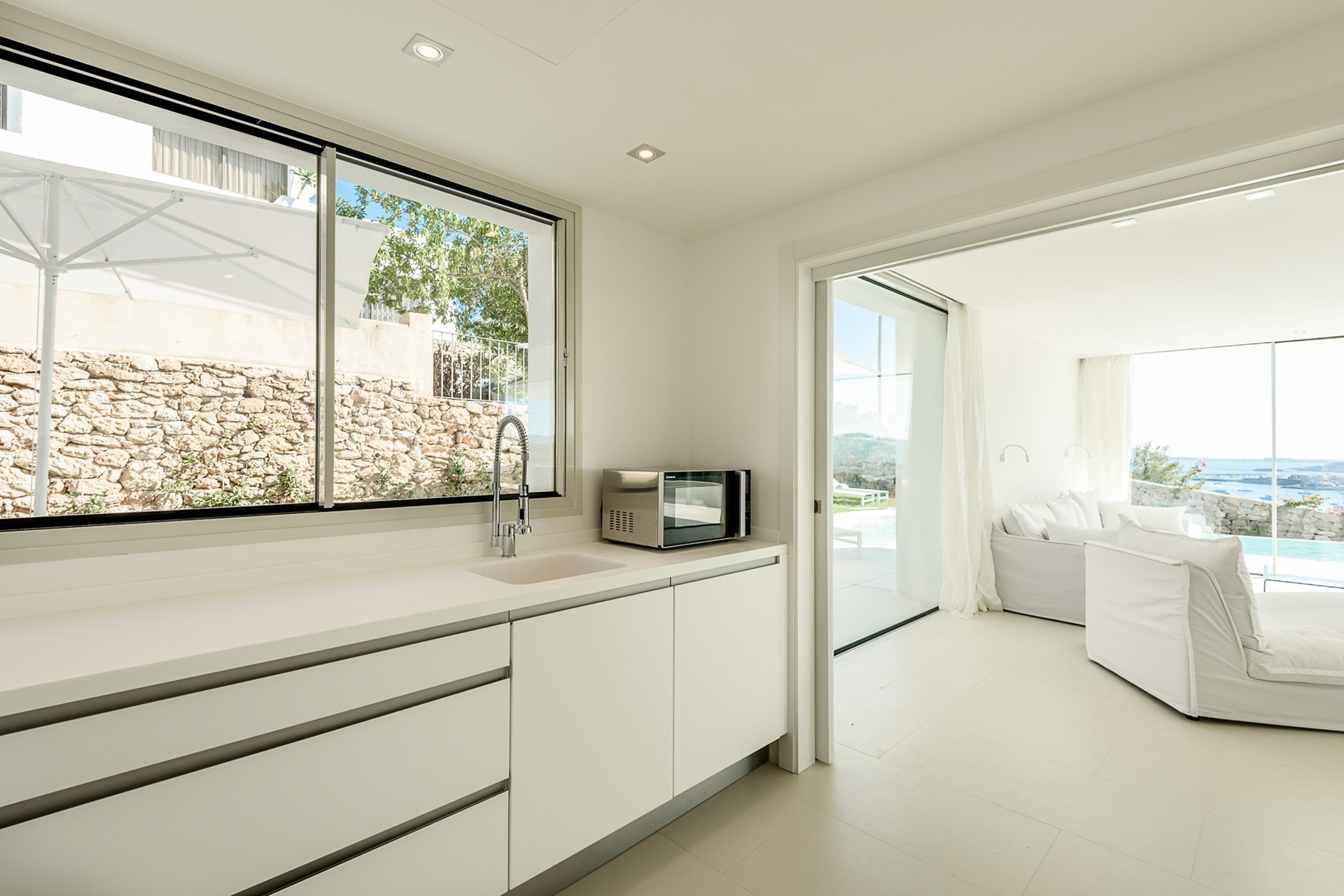 The sea panorama is fully integrated into the open living and dining area. If you open the large windows, the infinity pool looks like a natural extension of the living area. Exterior becomes interior and vice versa.