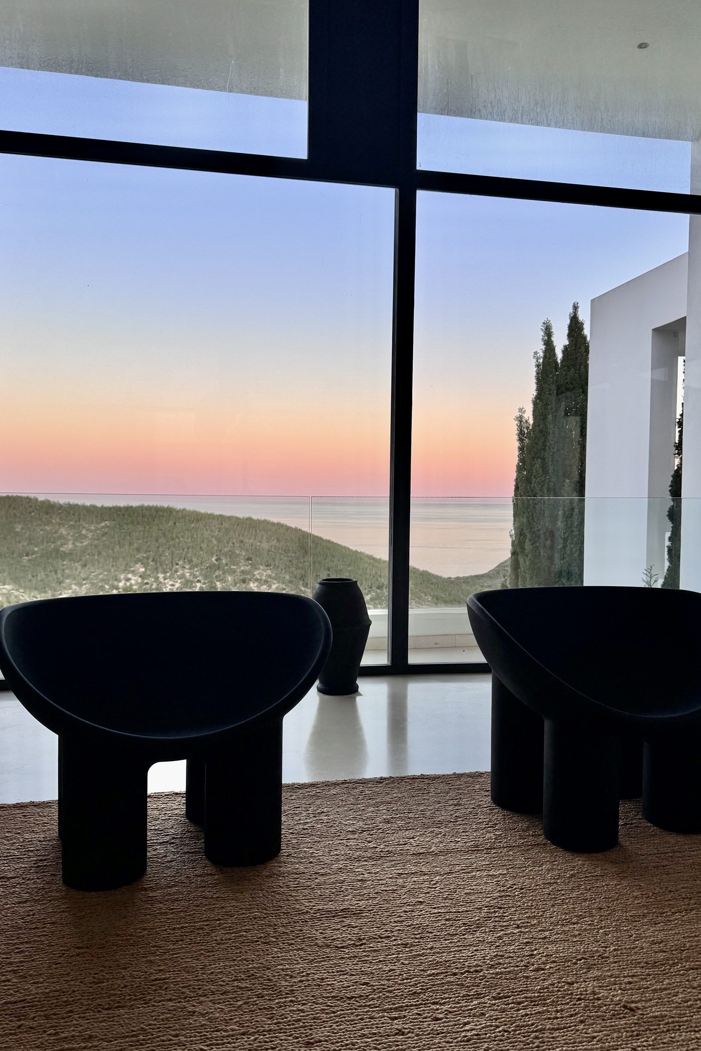 Inside, the open-plan living, dining, and kitchen areas are defined by elegant minimalism and contemporary sophistication. The fully equipped kitchen includes a large central island, two ovens, and premium appliances — perfect for entertaining or private chef service.