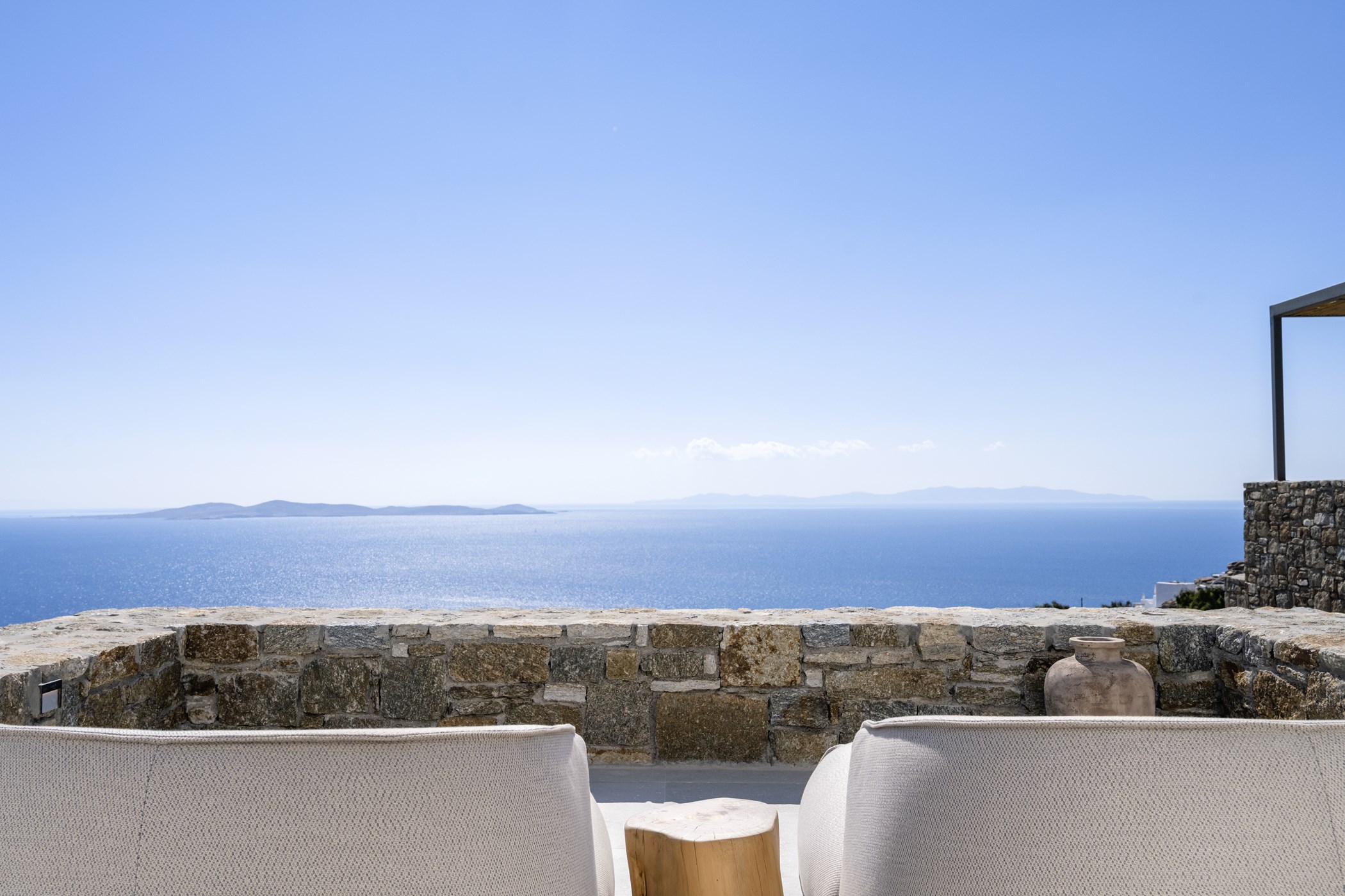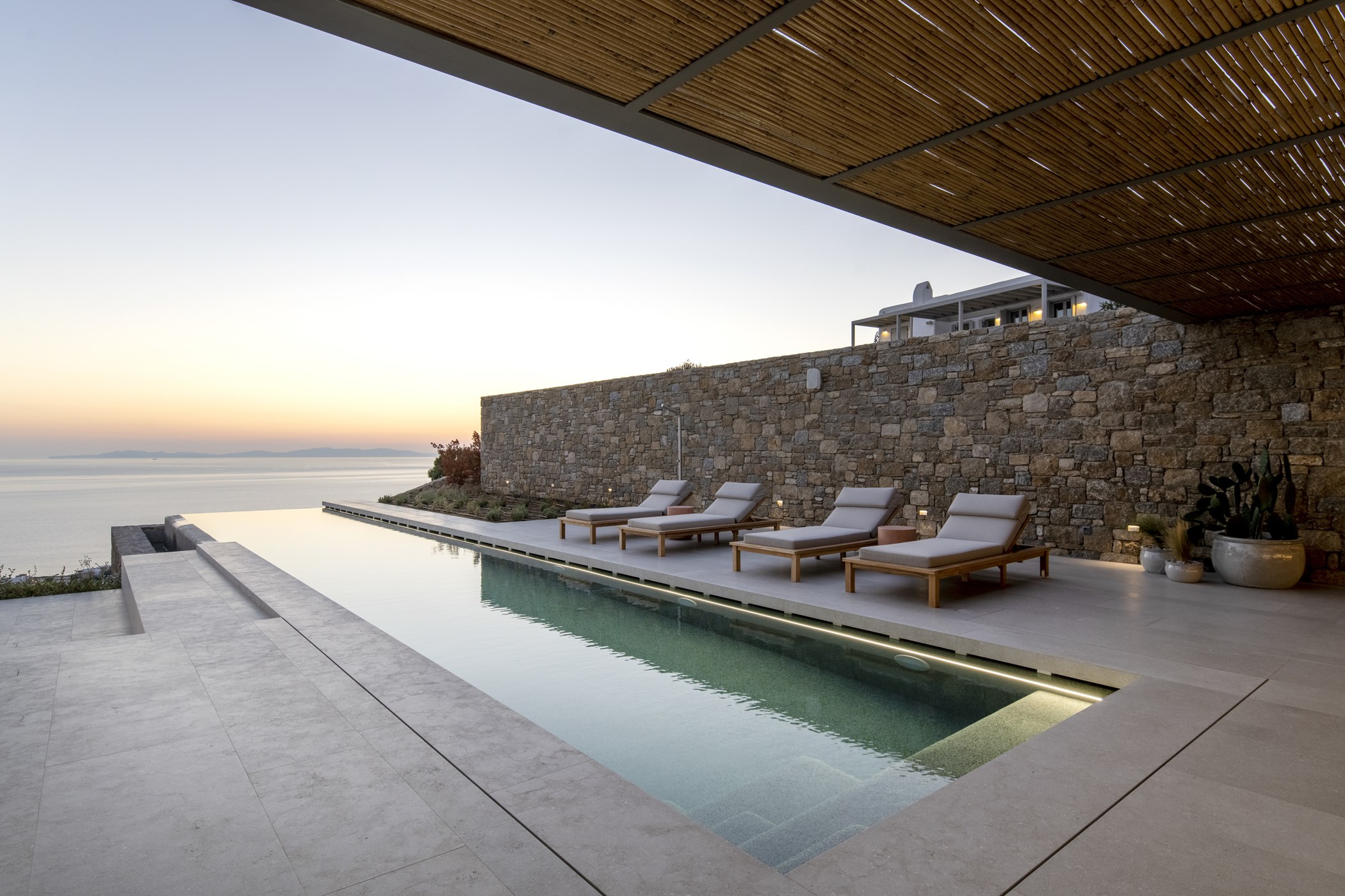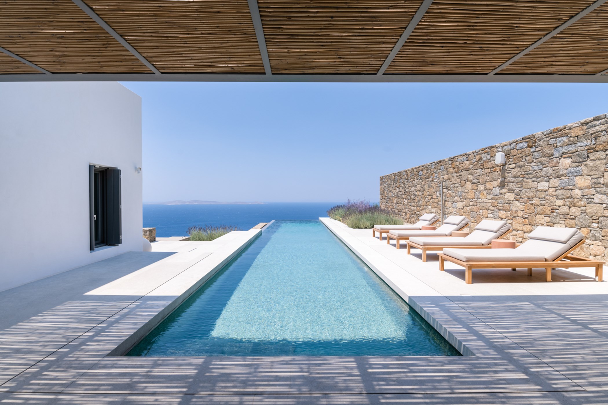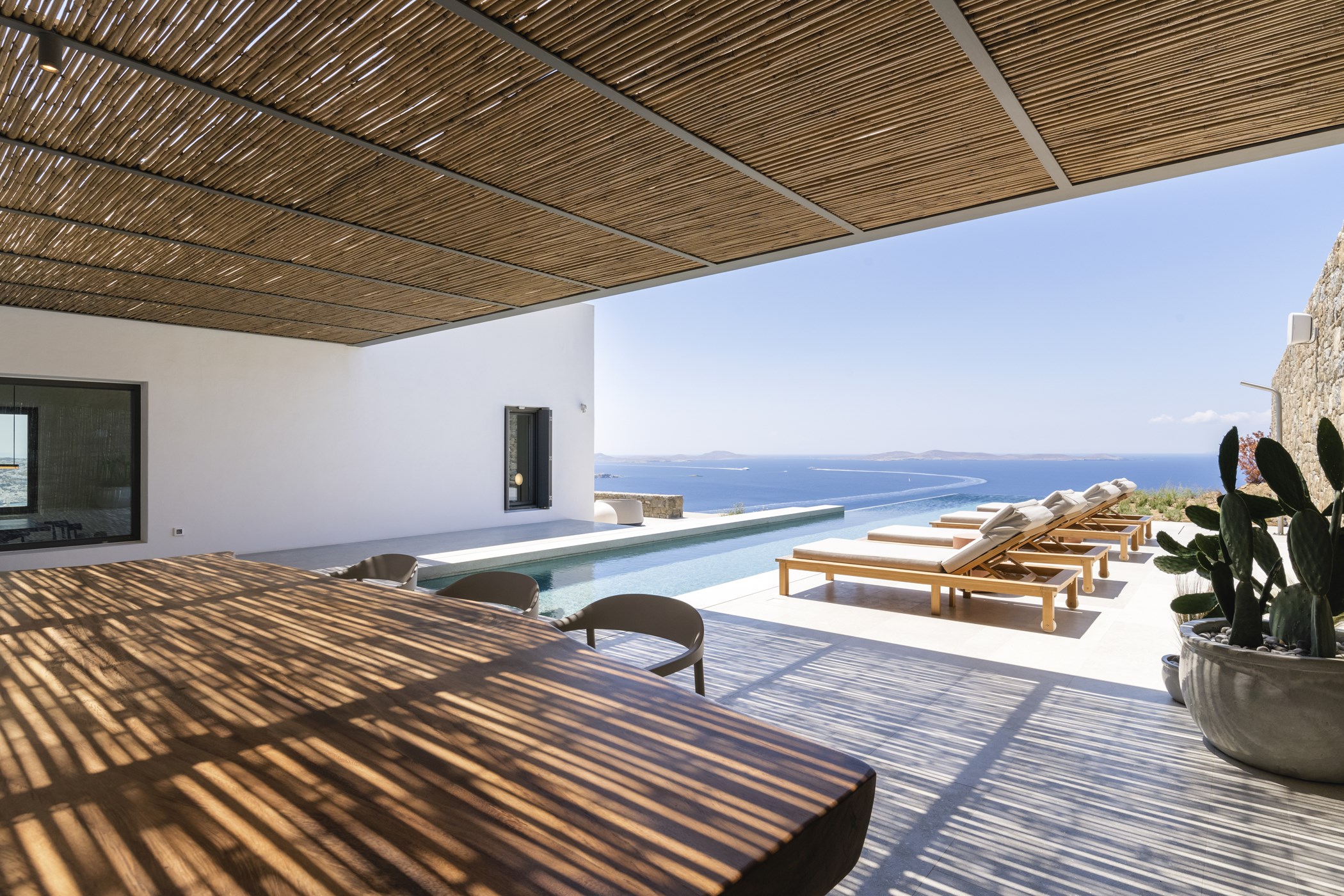 Stepping outside, a vast terrace unfolds, commanding panoramic views of the Aegean Sea, azure waters, and rugged coastline. Furnished with chic sun loungers, comfortable outdoor sofas, and a spacious dining table accommodating up to 10 people, this terrace is an ideal spot for al fresco dining, relaxation, and basking in the sun. The infinity pool, seemingly merging with the horizon, stands as the crown jewel of the outdoor space, offering a refreshing escape from the warm Mediterranean sun.