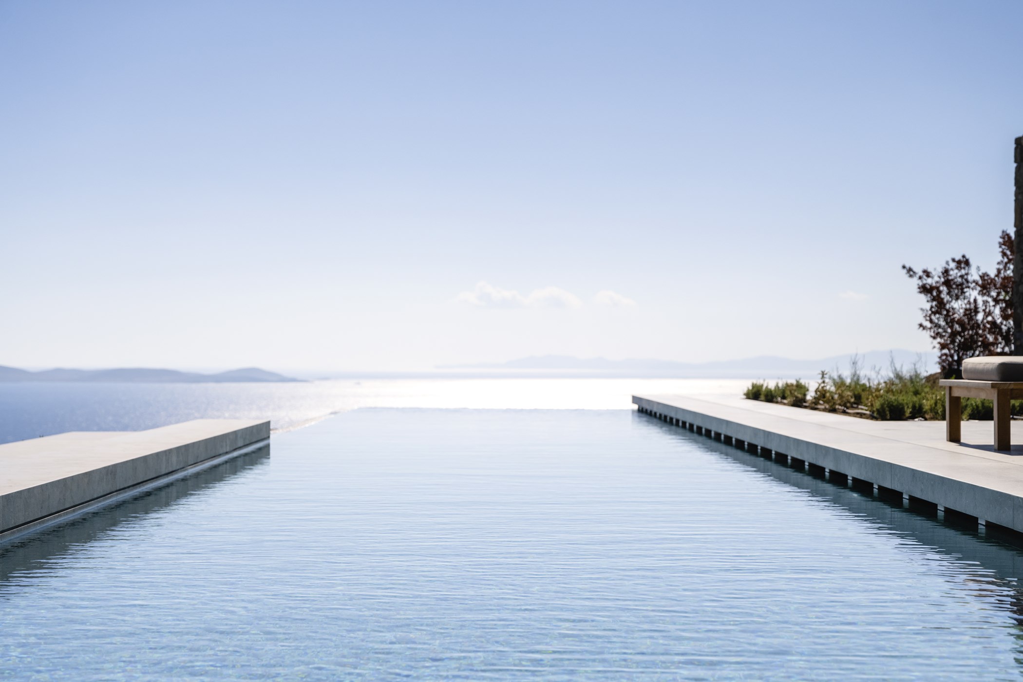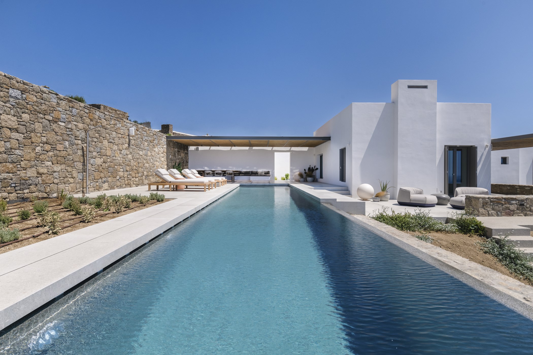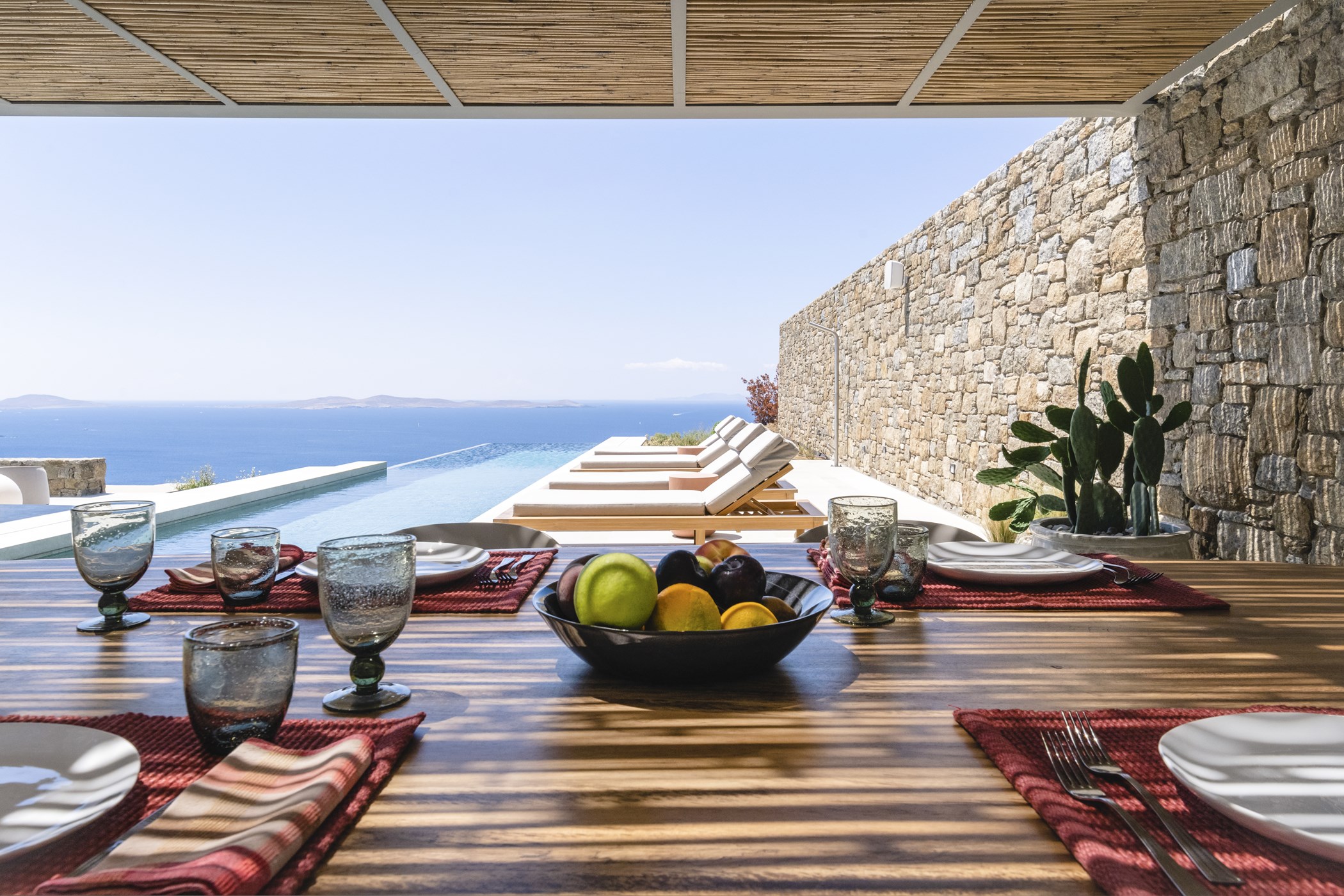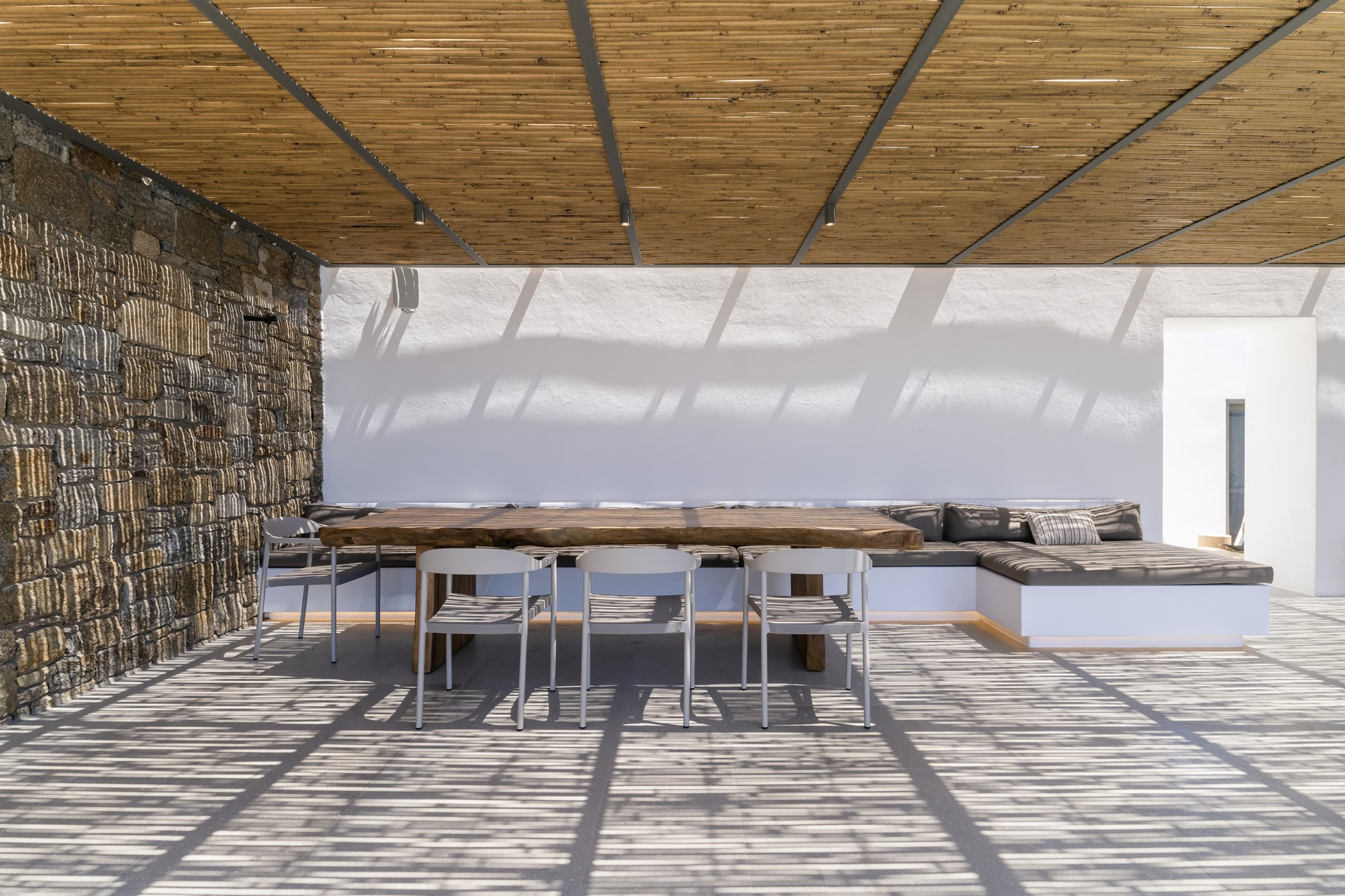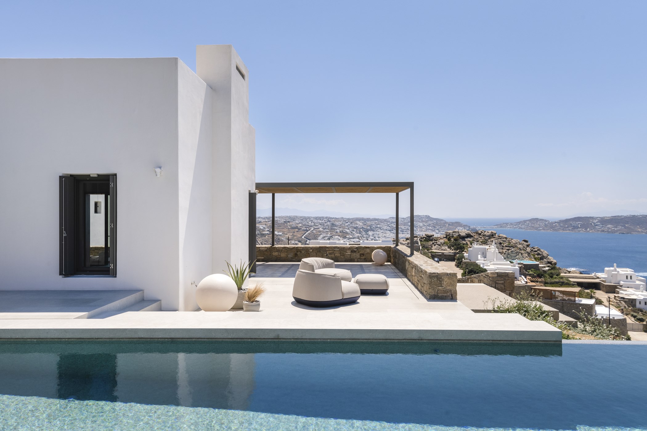 Stepping outside, a vast terrace unfolds, commanding panoramic views of the Aegean Sea, azure waters, and rugged coastline. Furnished with chic sun loungers, comfortable outdoor sofas, and a spacious dining table accommodating up to 10 people, this terrace is an ideal spot for al fresco dining, relaxation, and basking in the sun. The infinity pool, seemingly merging with the horizon, stands as the crown jewel of the outdoor space, offering a refreshing escape from the warm Mediterranean sun.