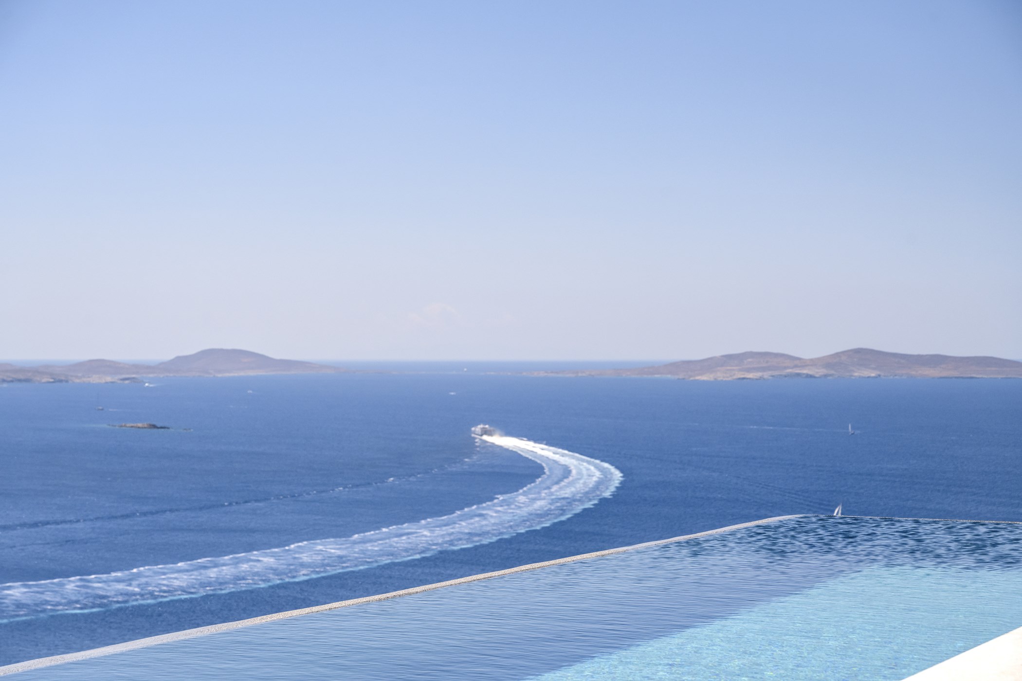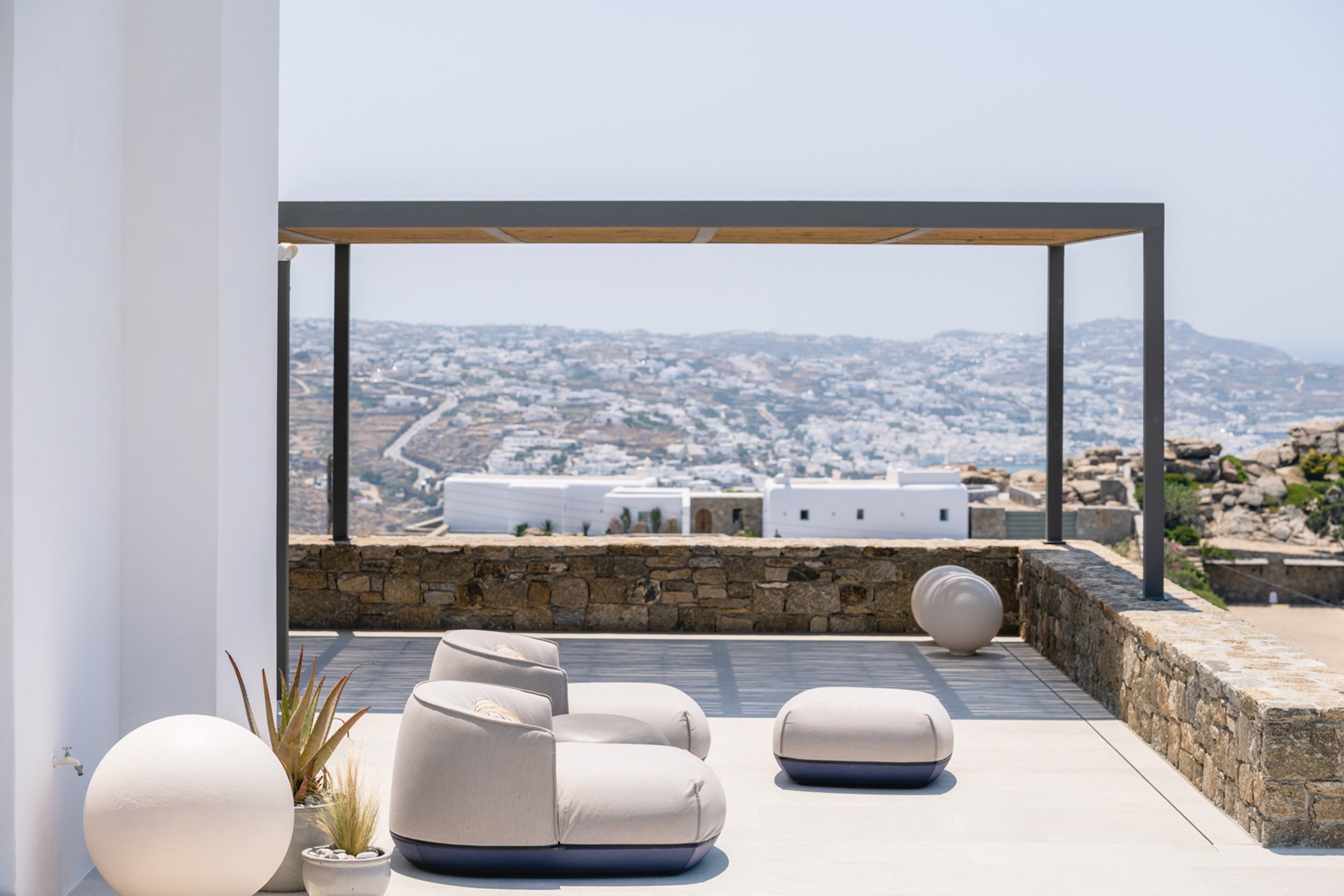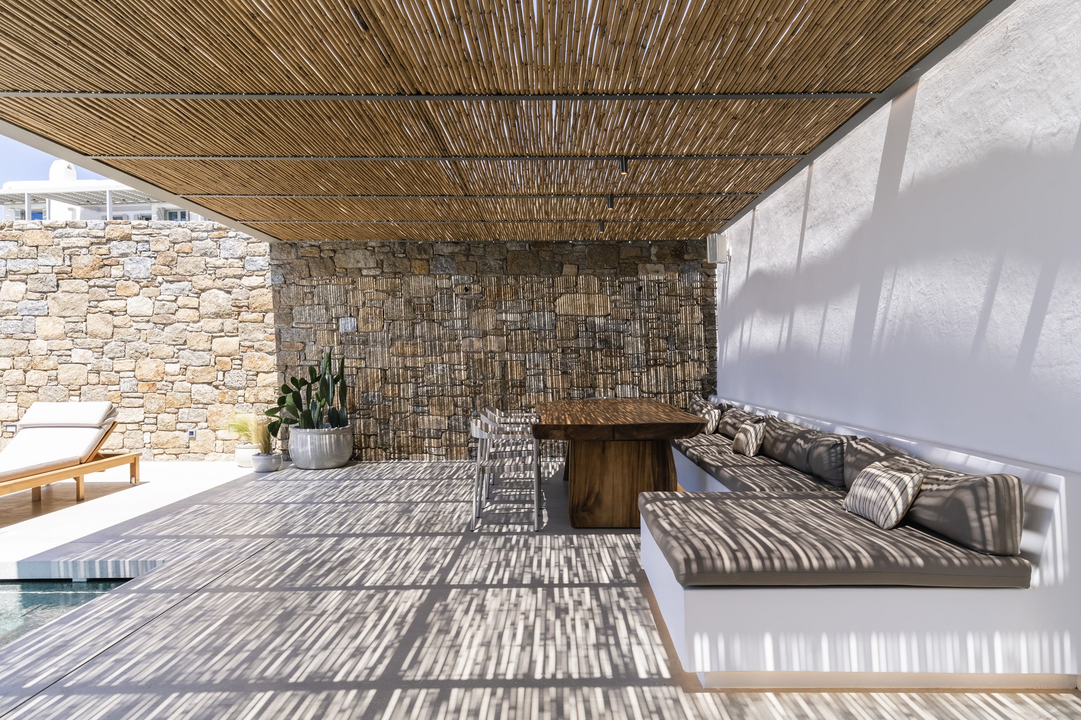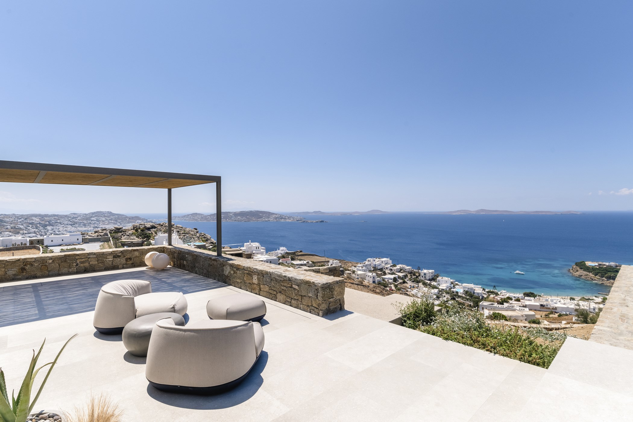 Stepping outside, a vast terrace unfolds, commanding panoramic views of the Aegean Sea, azure waters, and rugged coastline. Furnished with chic sun loungers, comfortable outdoor sofas, and a spacious dining table accommodating up to 10 people, this terrace is an ideal spot for al fresco dining, relaxation, and basking in the sun. The infinity pool, seemingly merging with the horizon, stands as the crown jewel of the outdoor space, offering a refreshing escape from the warm Mediterranean sun.