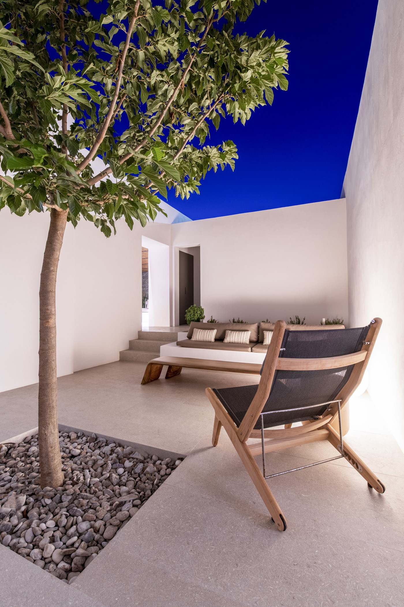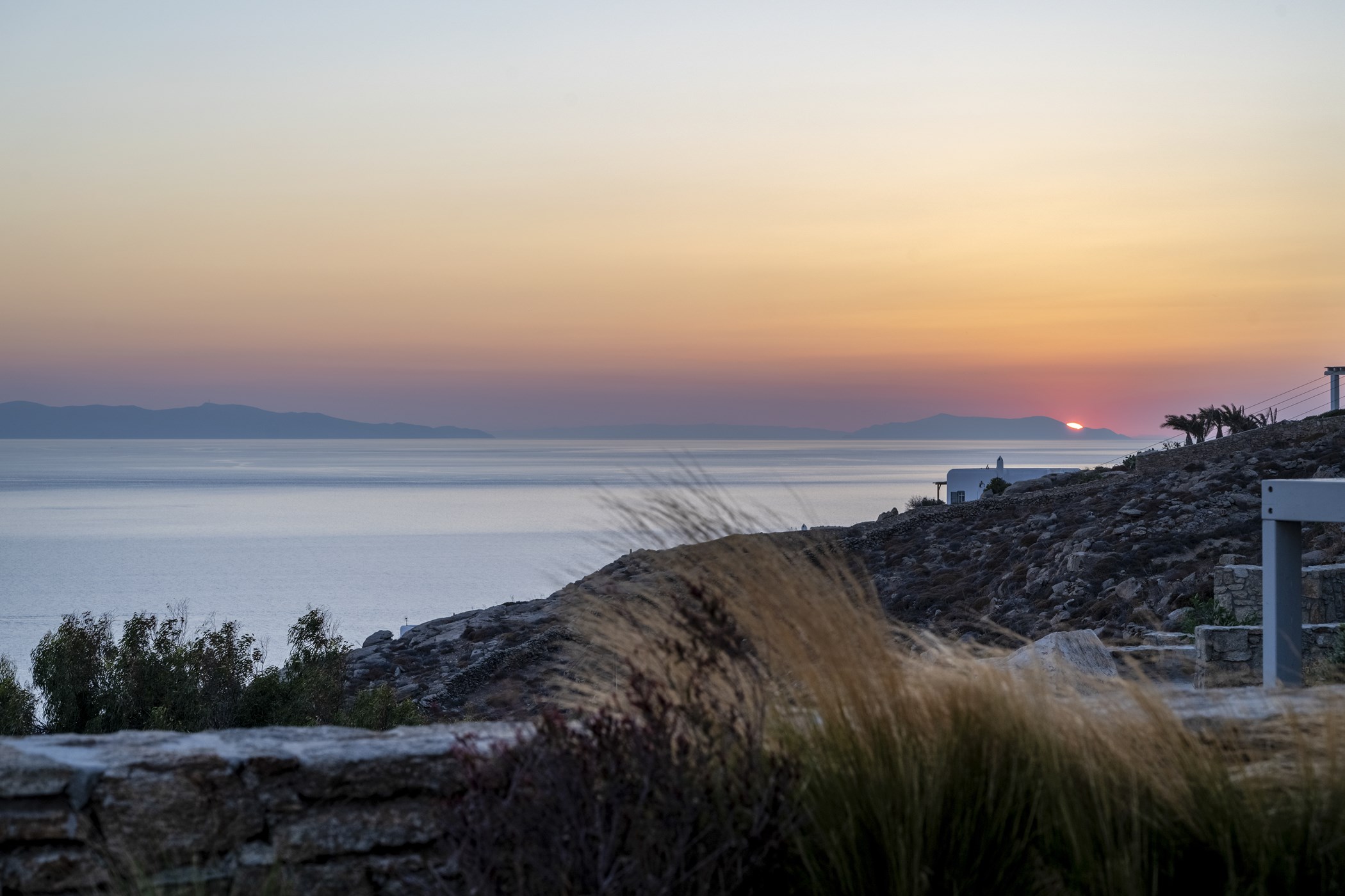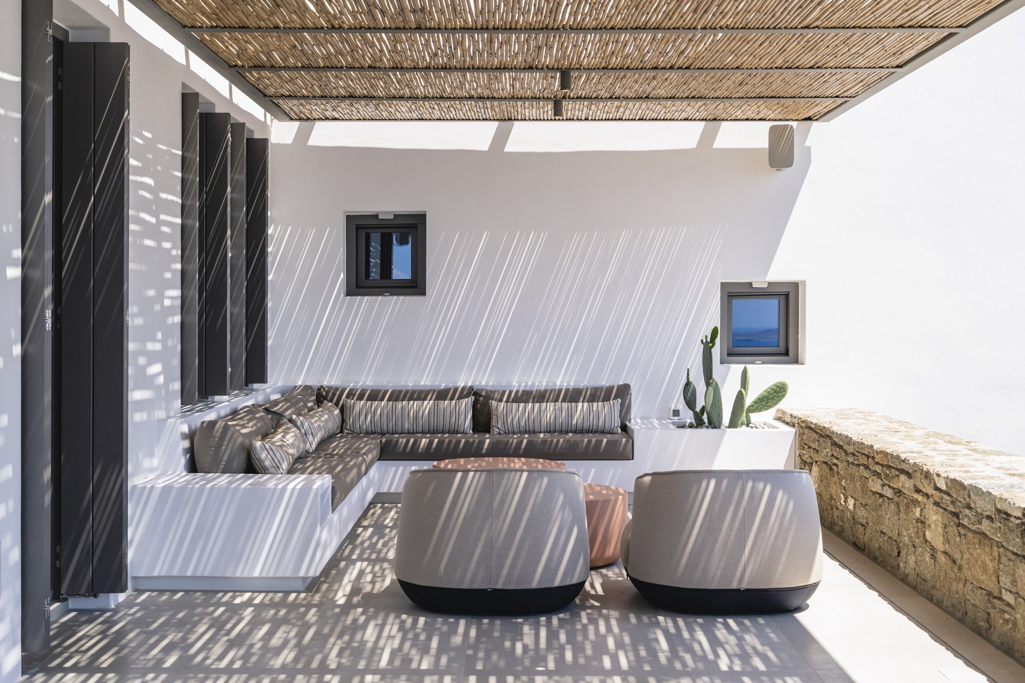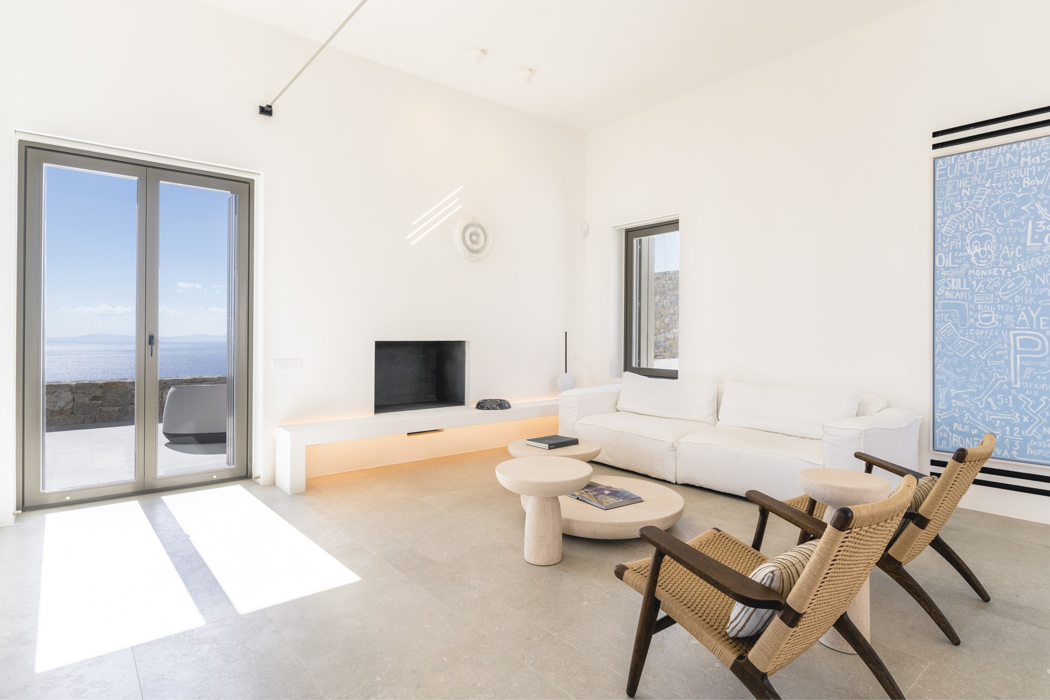 The minimalist living room with a sea view is a simple yet elegant space, designed to showcase the natural beauty of its surroundings. A large picture window serves as the centerpiece, framing an unobstructed view of the ocean, adorned with sheer white curtains that flutter in the ocean breeze. The room features sparse furnishings, including a comfortable sofa and matching armchairs, all upholstered in a light neutral color. The spacious bedrooms provide tranquility and comfort paired with breathtaking sea views. Each room has been thoughtfully designed to evoke a sense of calm and serenity, offering the perfect retreat after a day of exploration. Individual terraces accompany every bedroom, providing a private space to enjoy the spectacular sea views.