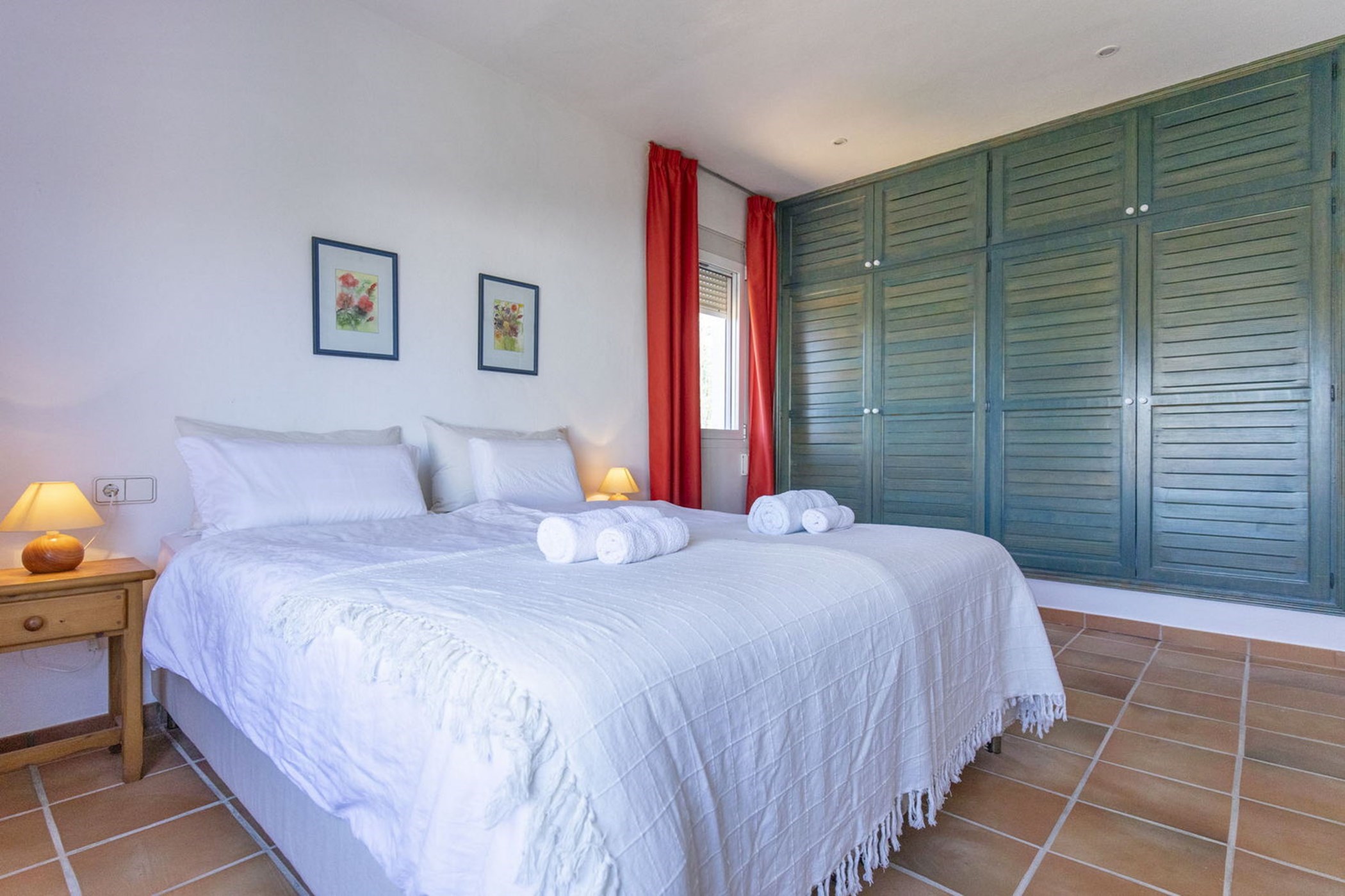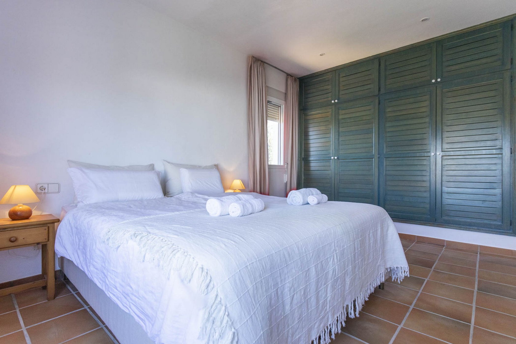 The 2 story villas has on the first floor and has a double bedroom, a shower room, a spacious living room and an open kitchen with dining area. The terrace of approximately 80m2 is partly covered and offers a beautiful view of the old town of Ibiza, Dalt Vila, which is stunning, especially at night. The terrace is furnished with a cozy Launch corner, two sunbeds and a breakfast table.