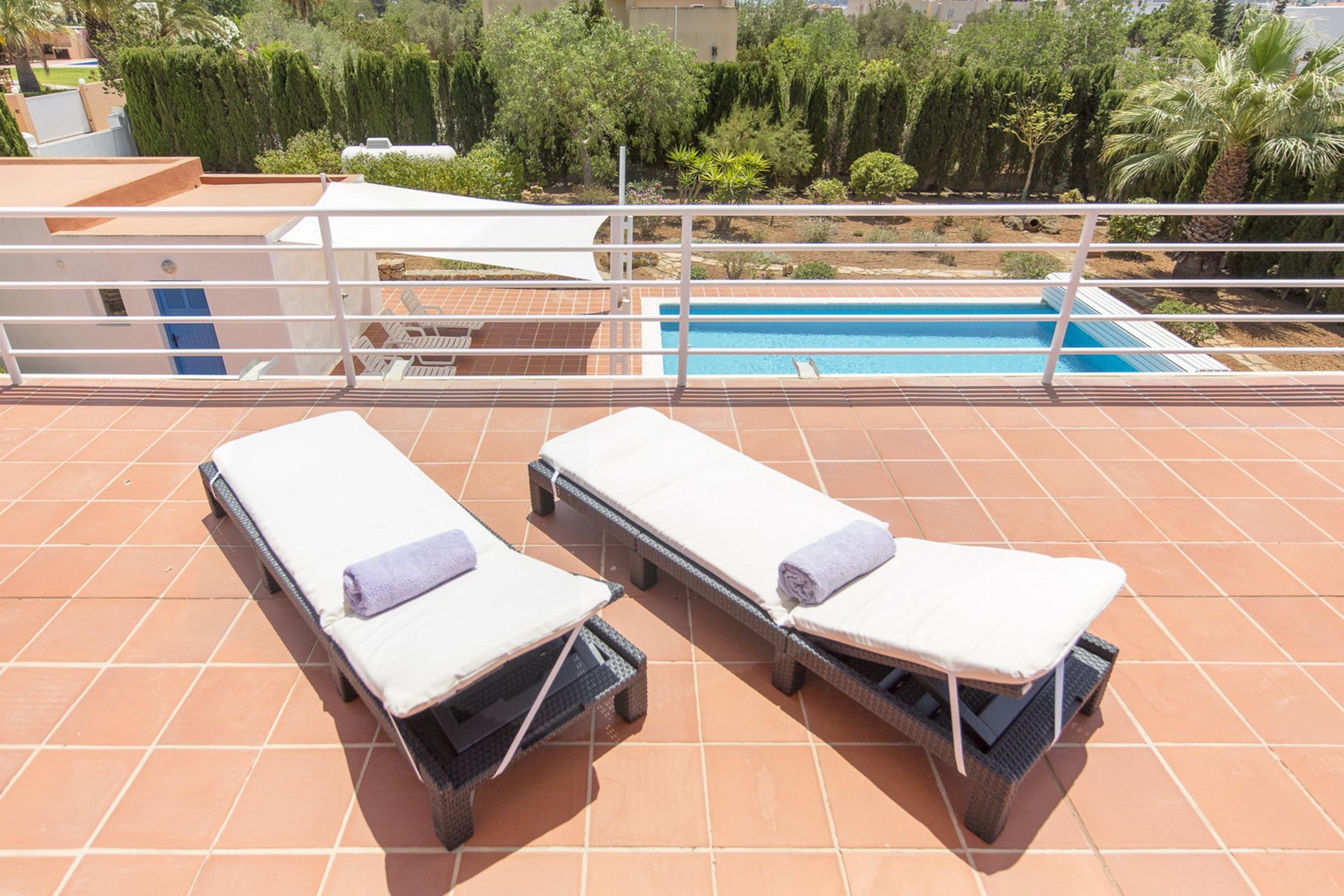 Outside: The spacious pool terrace surrounds the pool of 9x5m. An awning provides shade for a siesta by the pool. A shower is by the pool available. The garden is Mediterranean. The entire property is fenced. Parking is located on the property and can be reached via a driveway with electric gate.