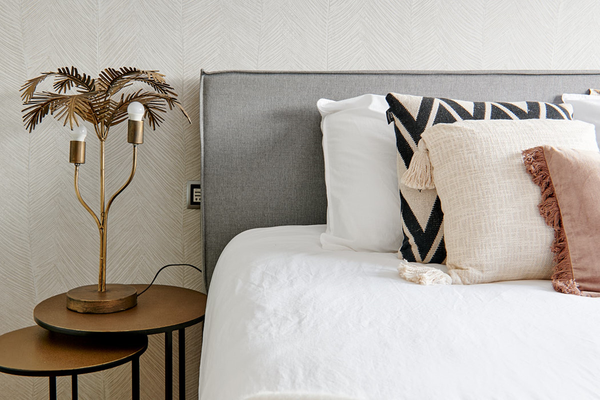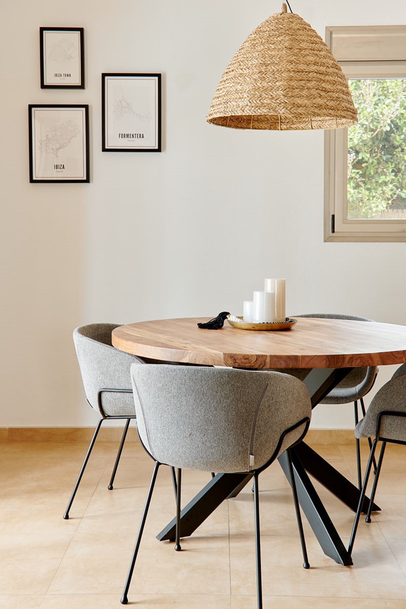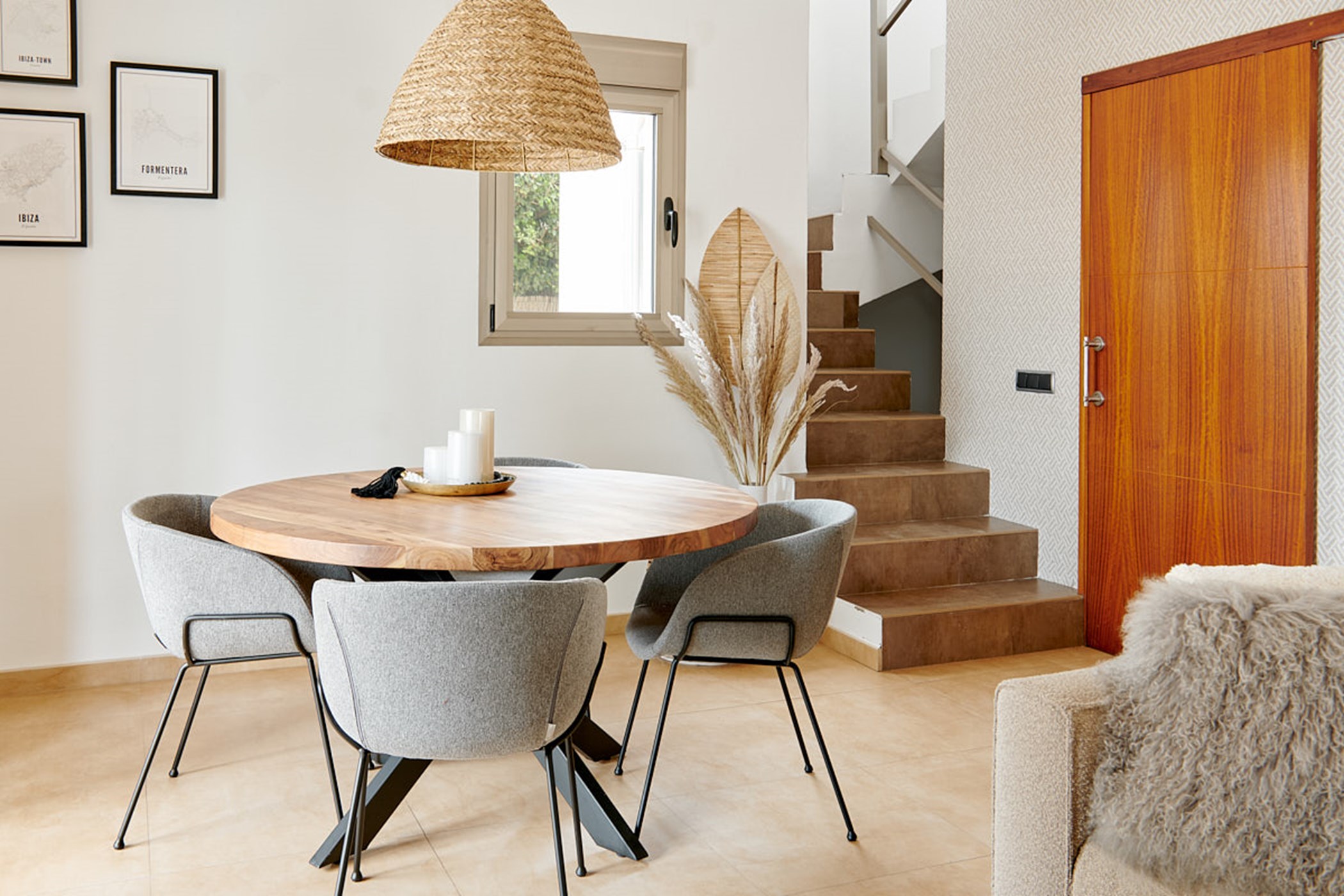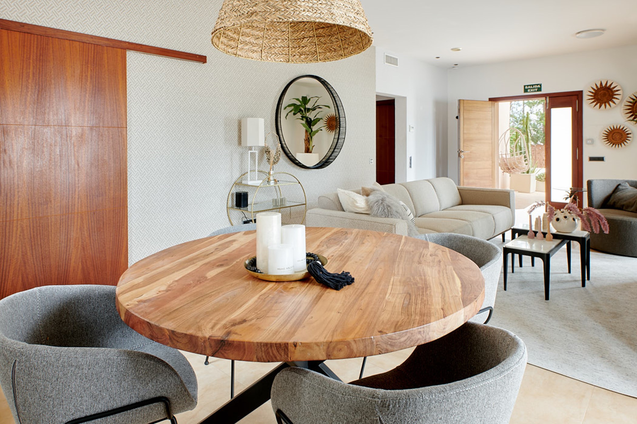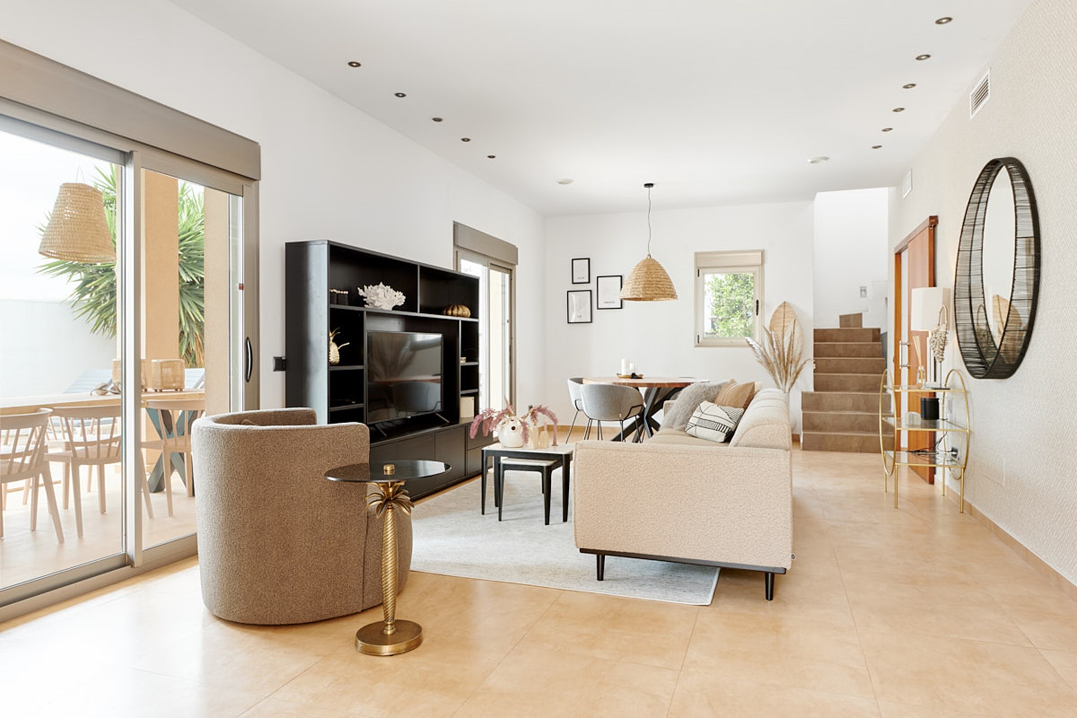 Alongside the interior dining table, creamy upholstery and an open fireplace create a cozy living space that feels generously spacious for a villa of this size.