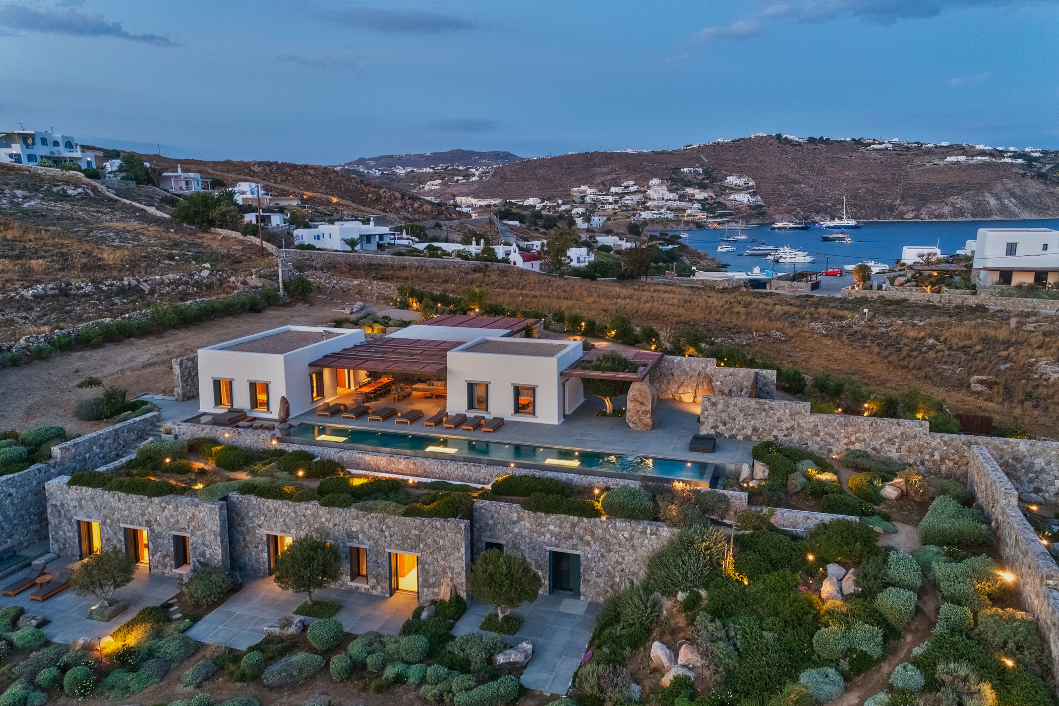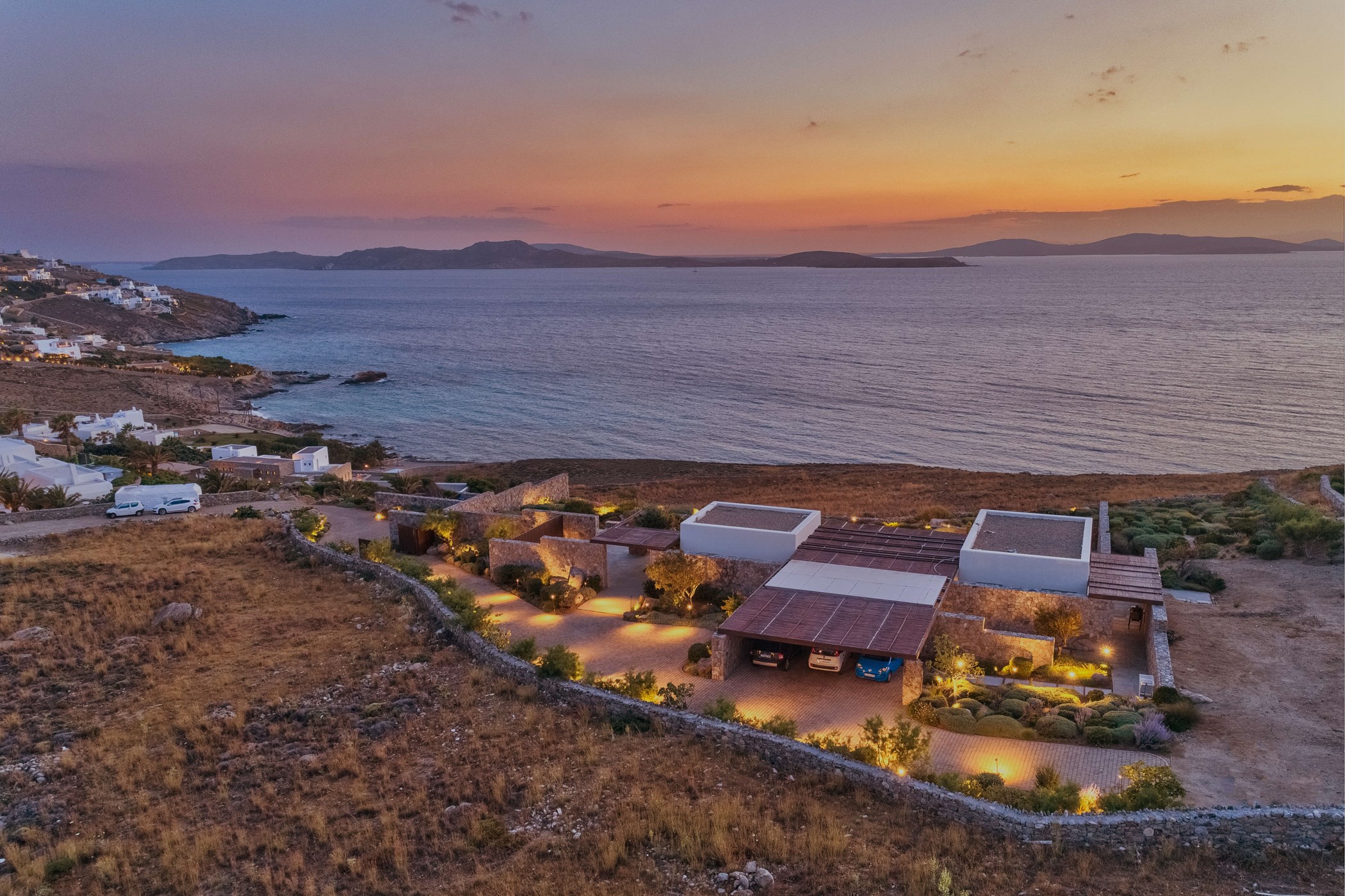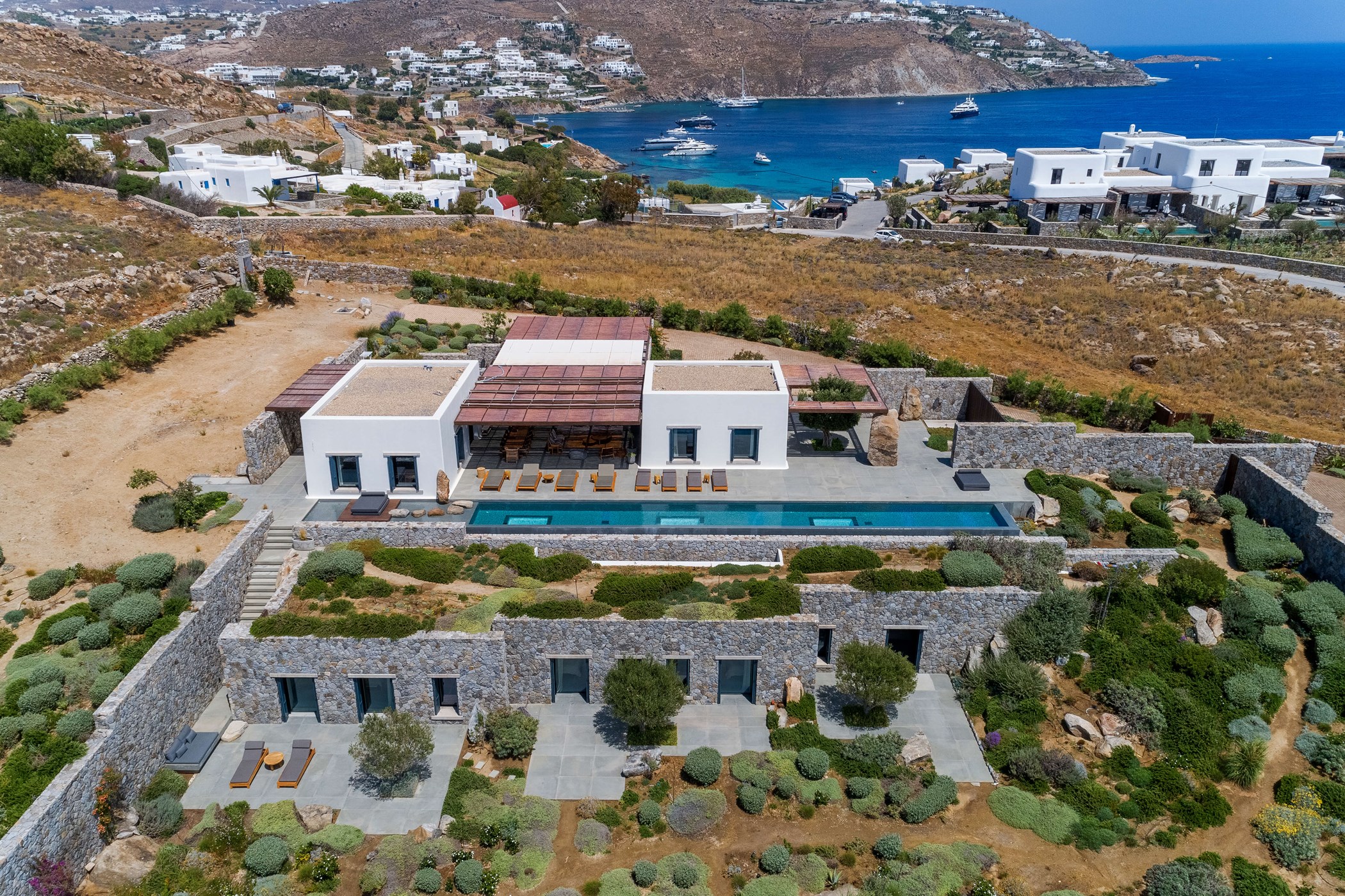 A stunning newly built private house with incredible sea and sunset views over the neighboring island of Delos. A 5-bedroom holiday home built for those seeking tranquillity and bliss. it celebrates its spectacular view from a grounded viewpoint blended into a sensitively landscaped, stone-walled garden that screens it from the road behind.