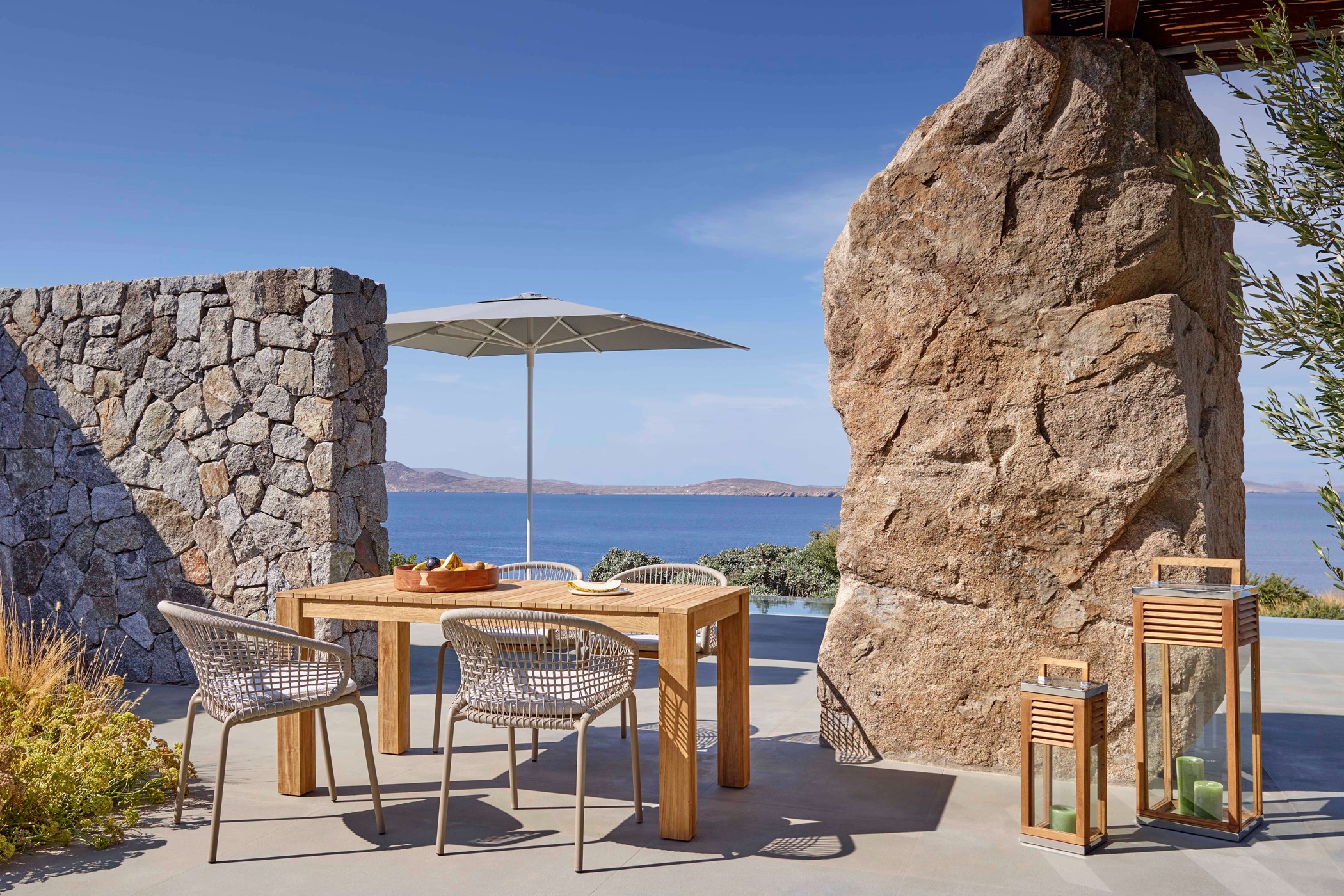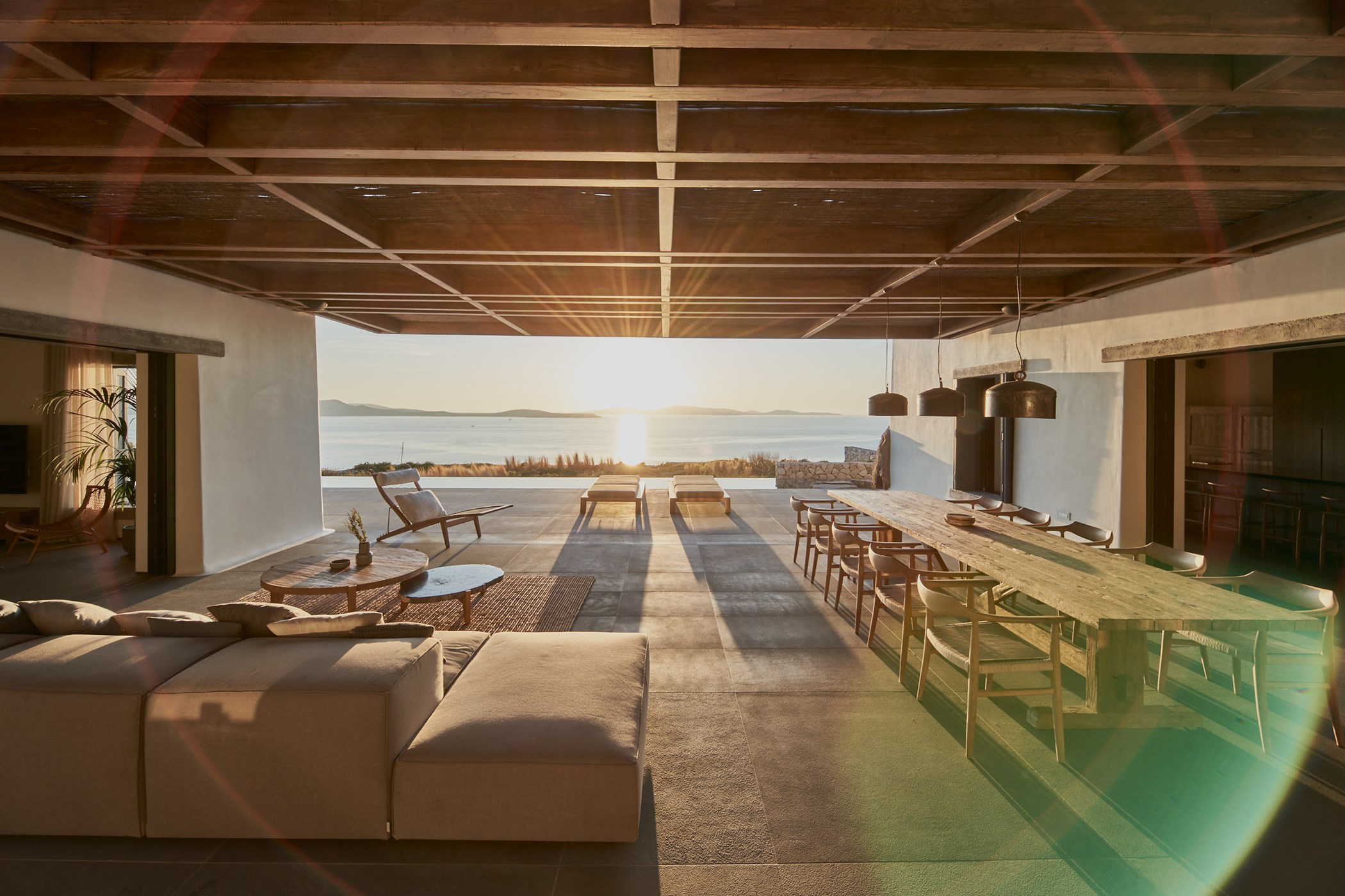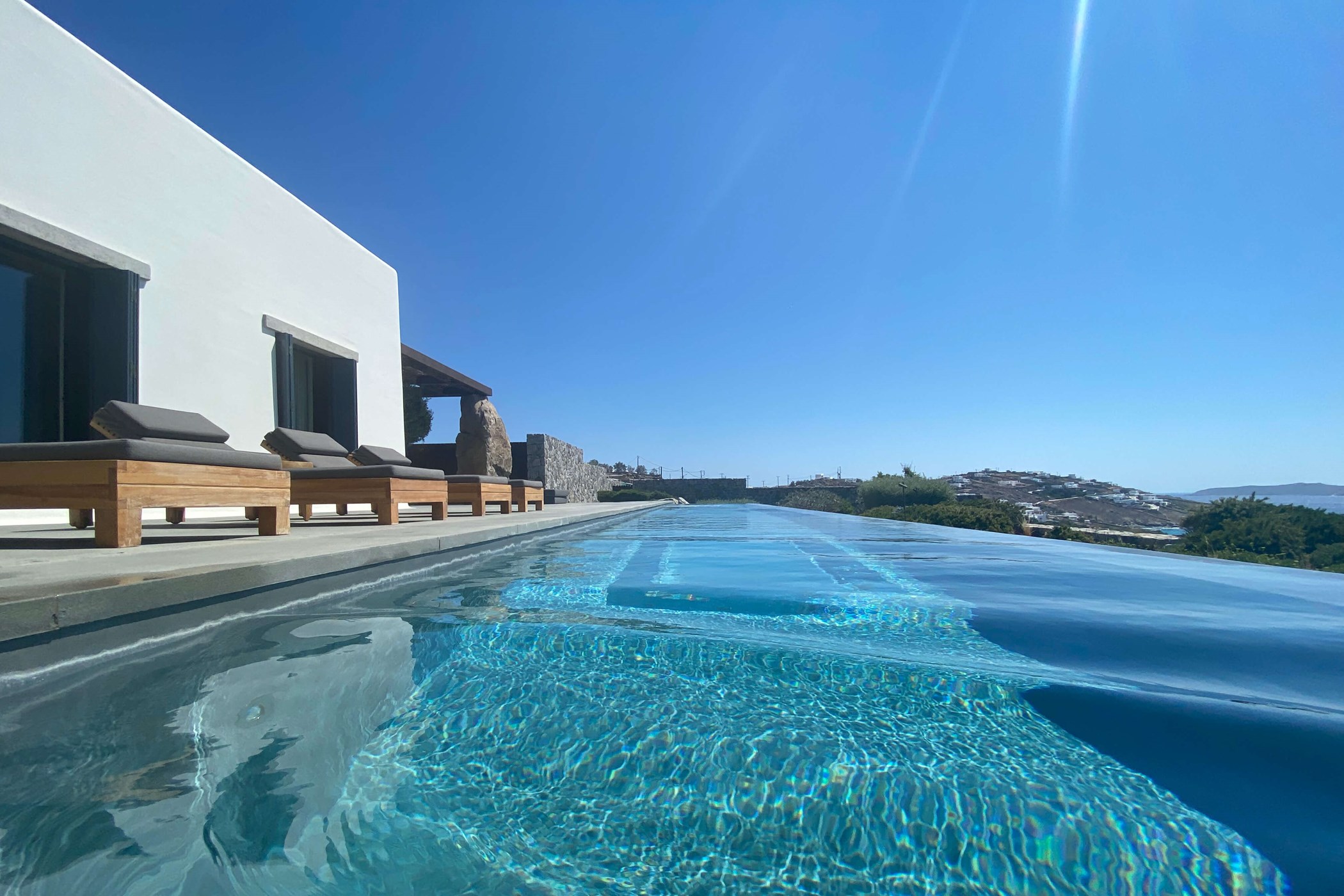 A stunning newly built private house with incredible sea and sunset views over the neighboring island of Delos. A 5-bedroom holiday home built for those seeking tranquillity and bliss. it celebrates its spectacular view from a grounded viewpoint blended into a sensitively landscaped, stone-walled garden that screens it from the road behind.
