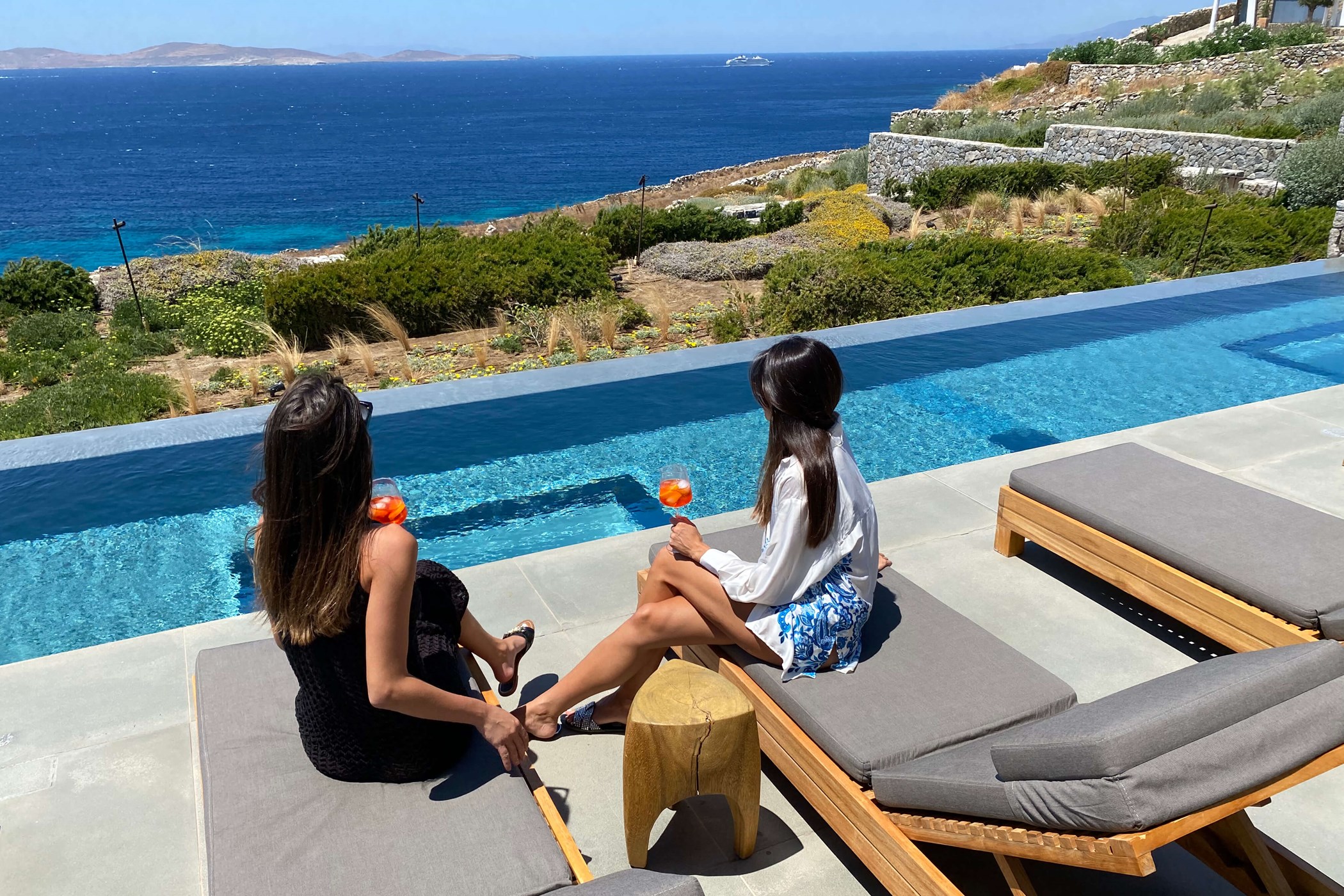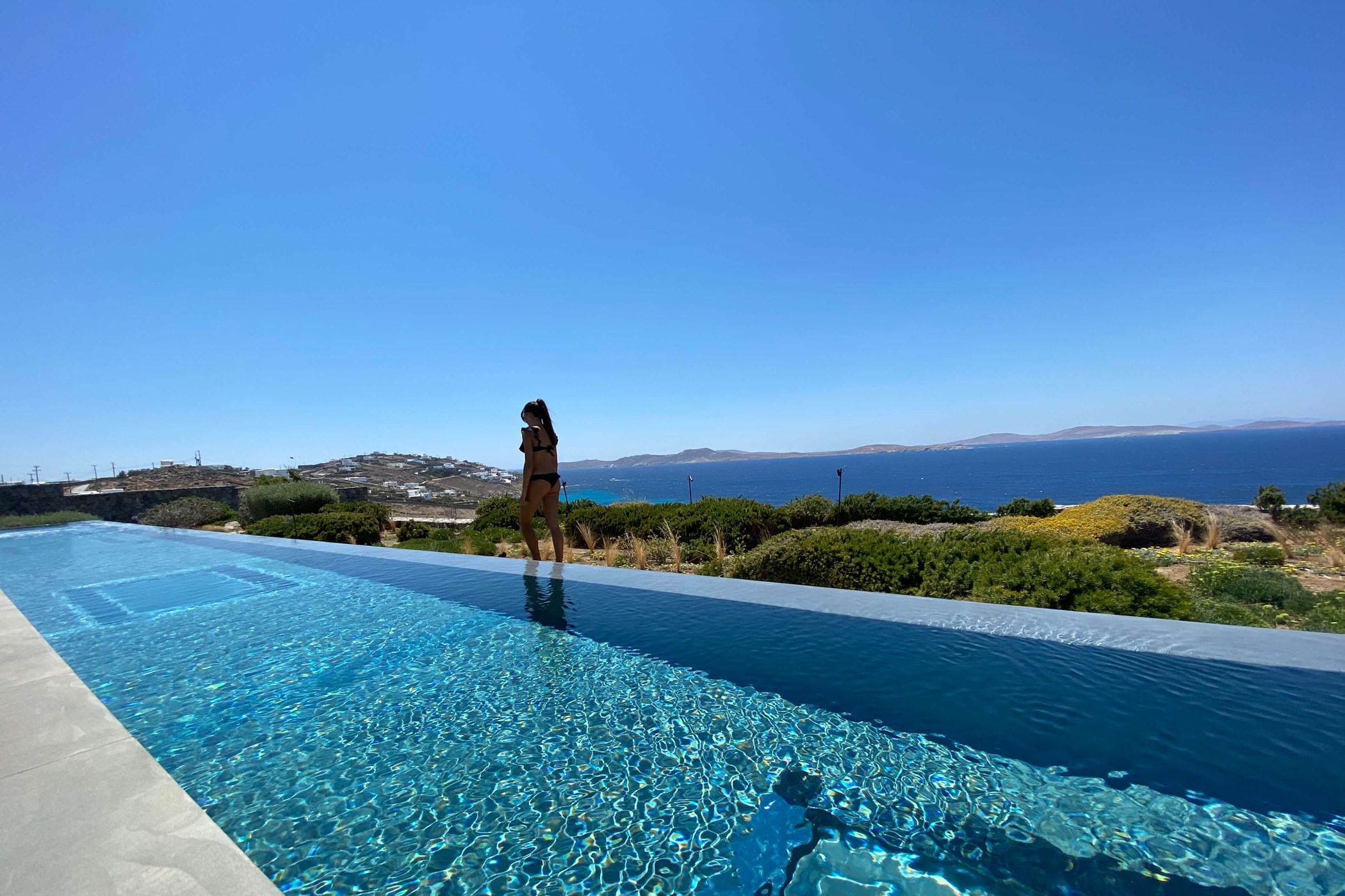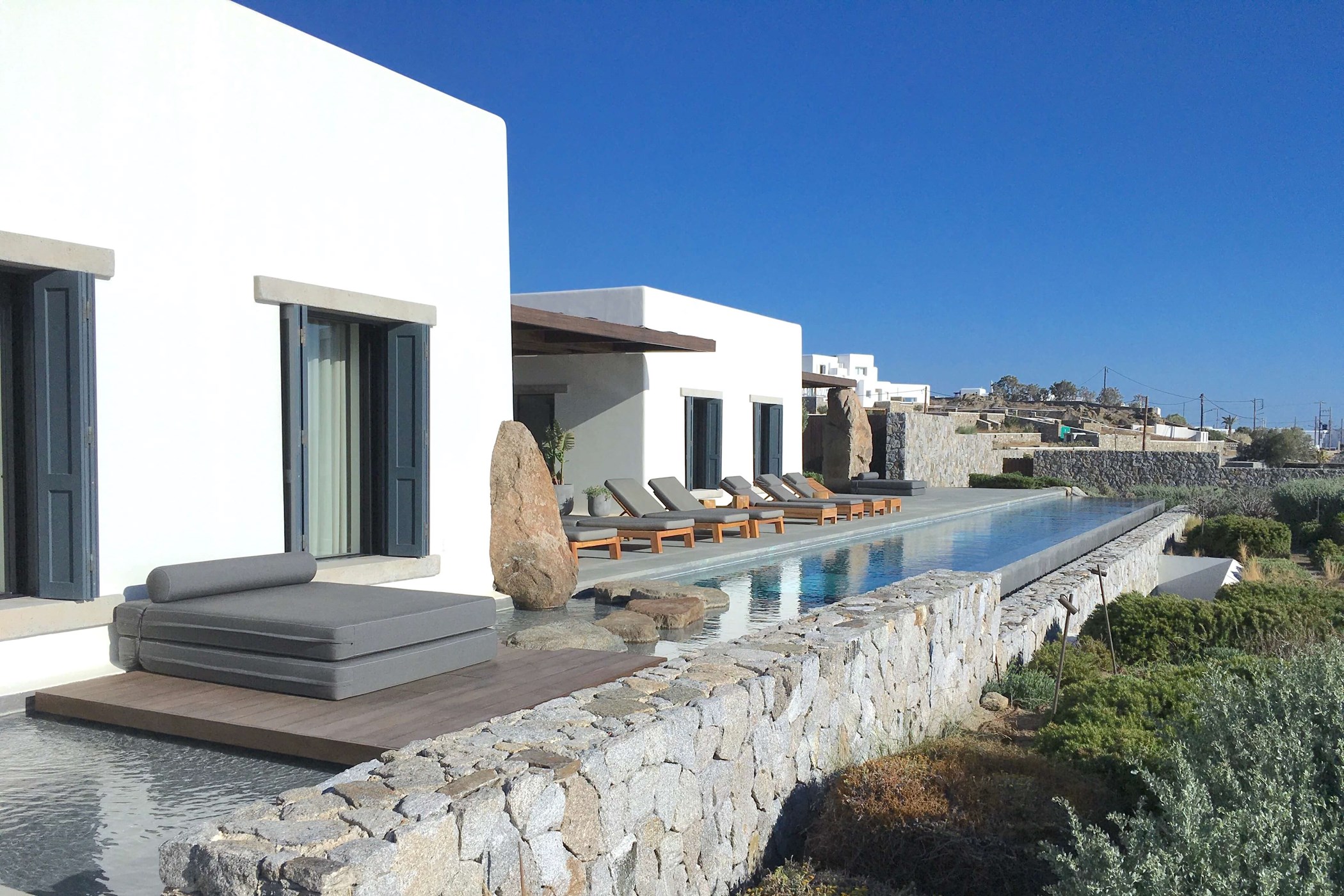 Beneath the pool garden are the private bedrooms, separated for privacy and quietly enjoying the uninterrupted view over the lower garden to the sea. Their separation further reduces the overall impact of the house and cleanly divides social and private space. The luxury villa is a magnificent option for those wishing to enjoy Mykonos to its fullest, in one of the most secluded areas of the island, close to the cosmopolitan southern beaches, as well as the picturesque town of Mykonos.