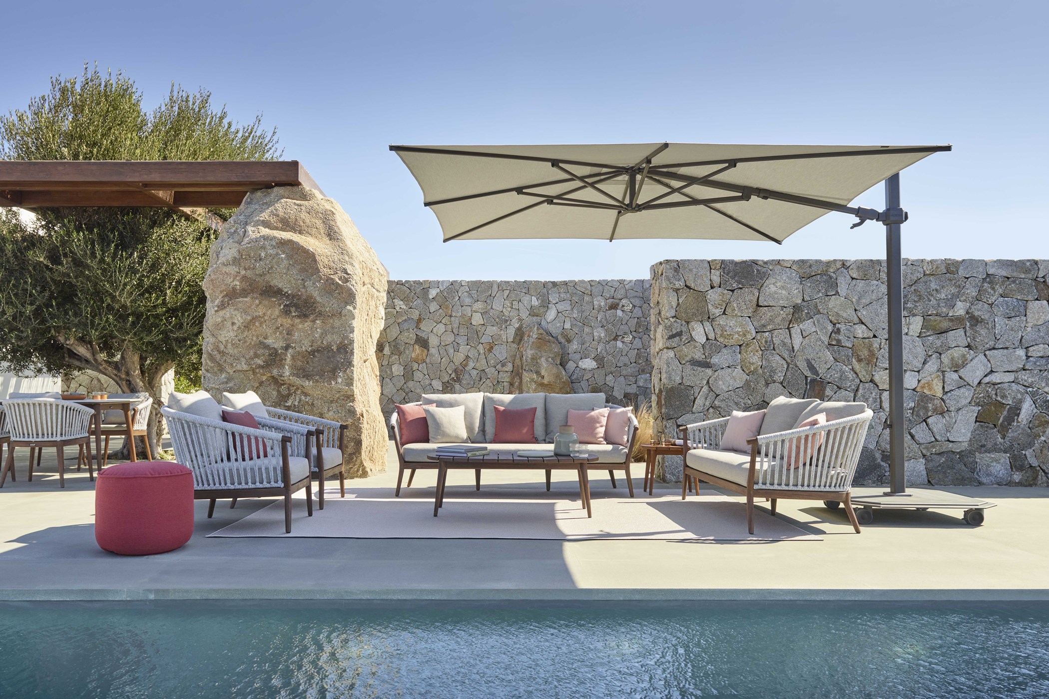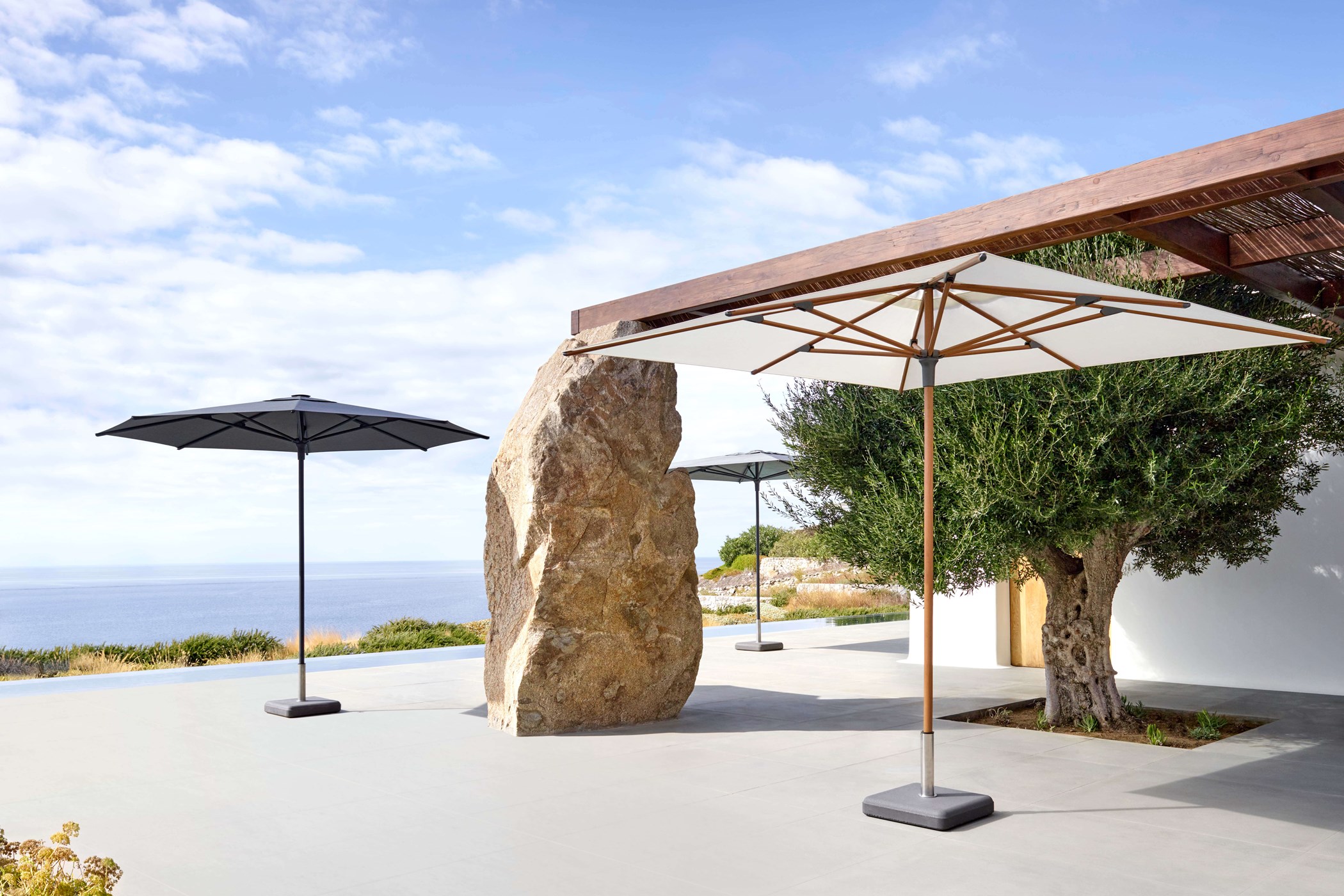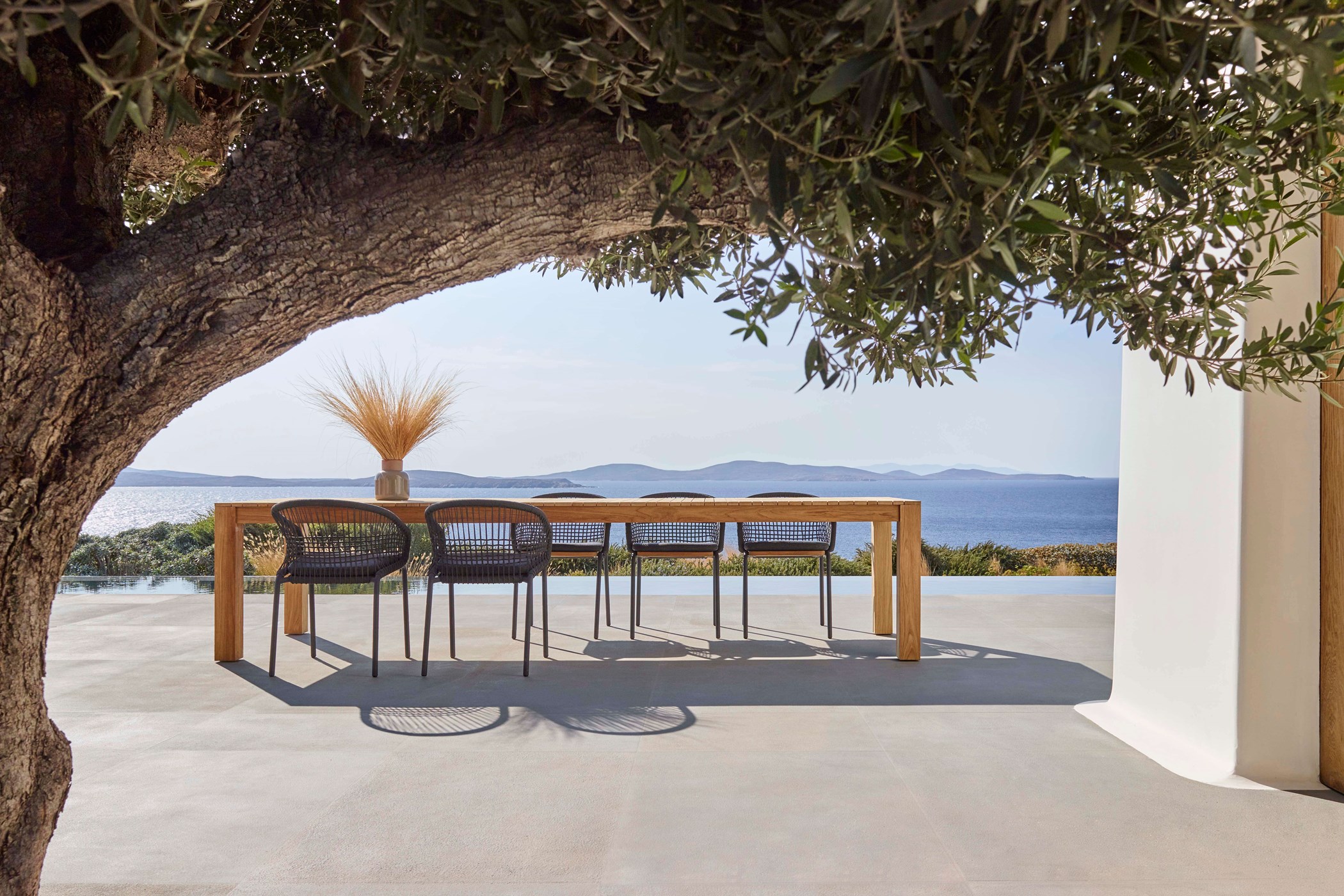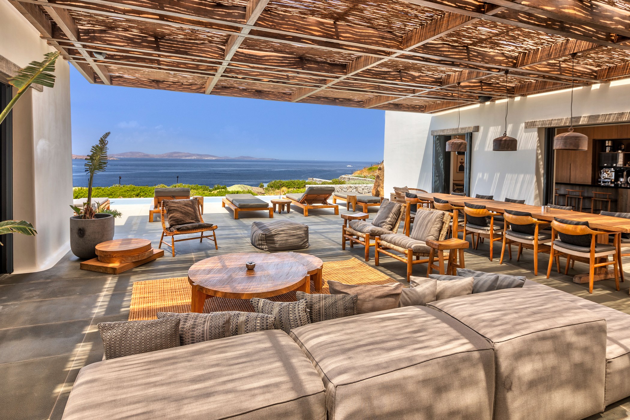 Beneath the pool garden are the private bedrooms, separated for privacy and quietly enjoying the uninterrupted view over the lower garden to the sea. Their separation further reduces the overall impact of the house and cleanly divides social and private space. The luxury villa is a magnificent option for those wishing to enjoy Mykonos to its fullest, in one of the most secluded areas of the island, close to the cosmopolitan southern beaches, as well as the picturesque town of Mykonos.