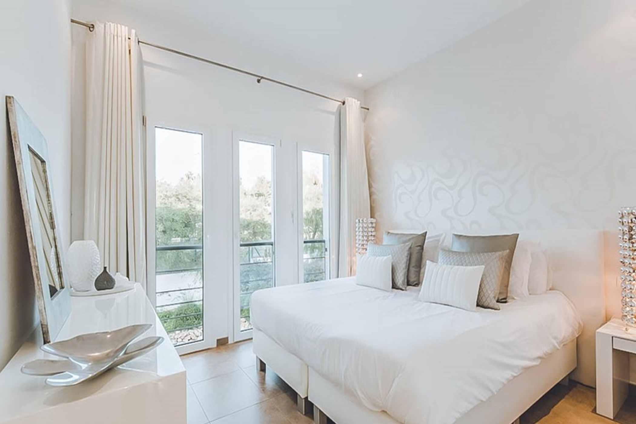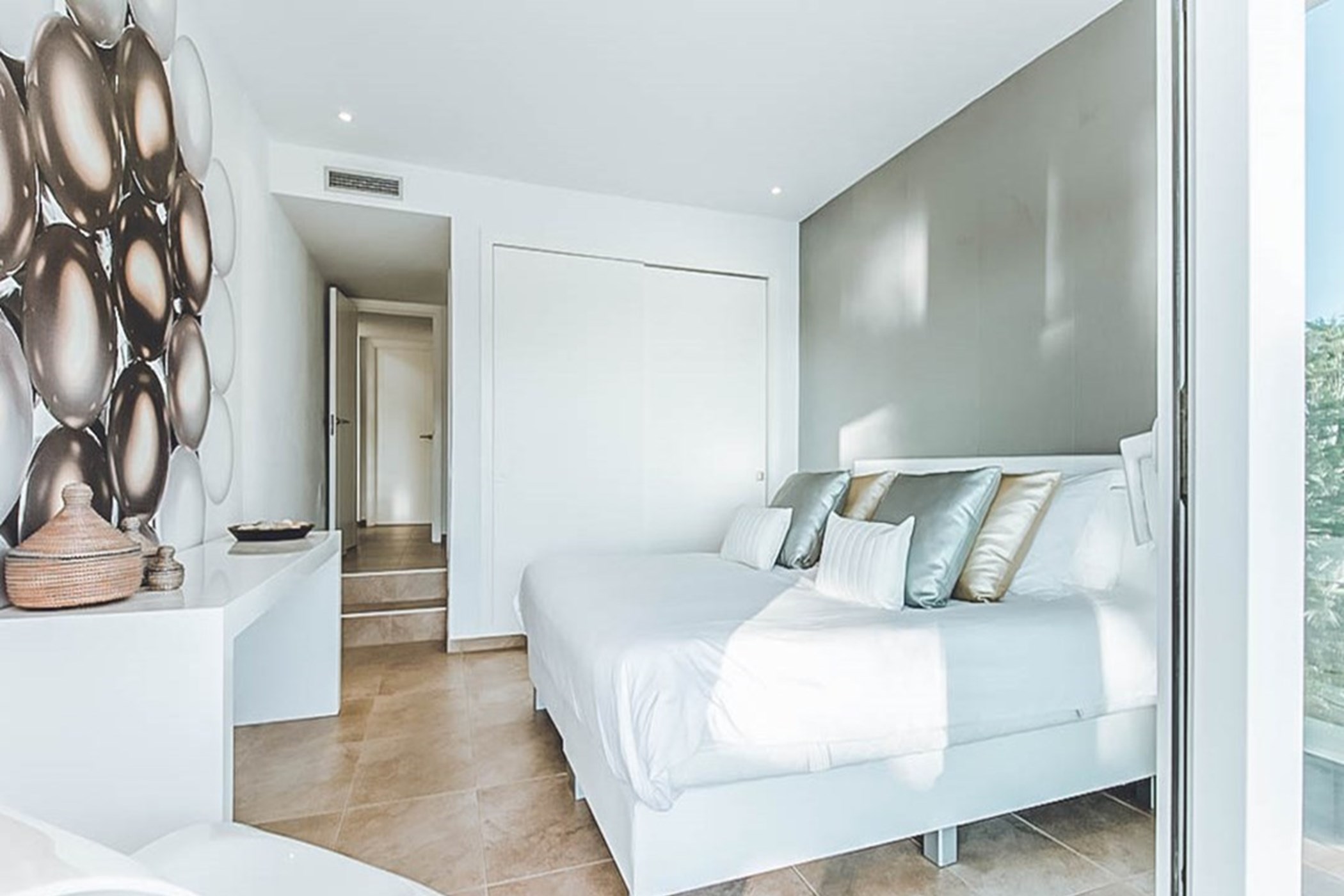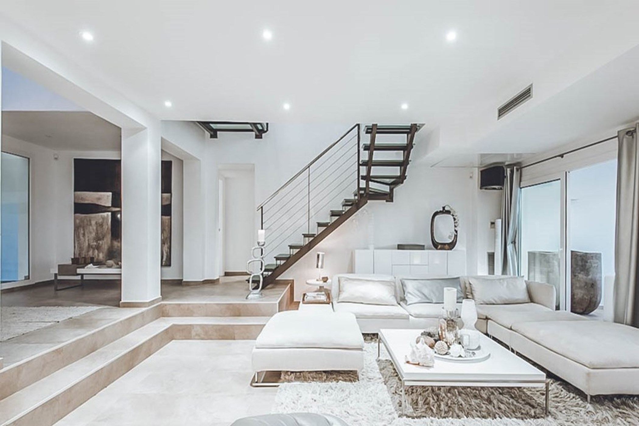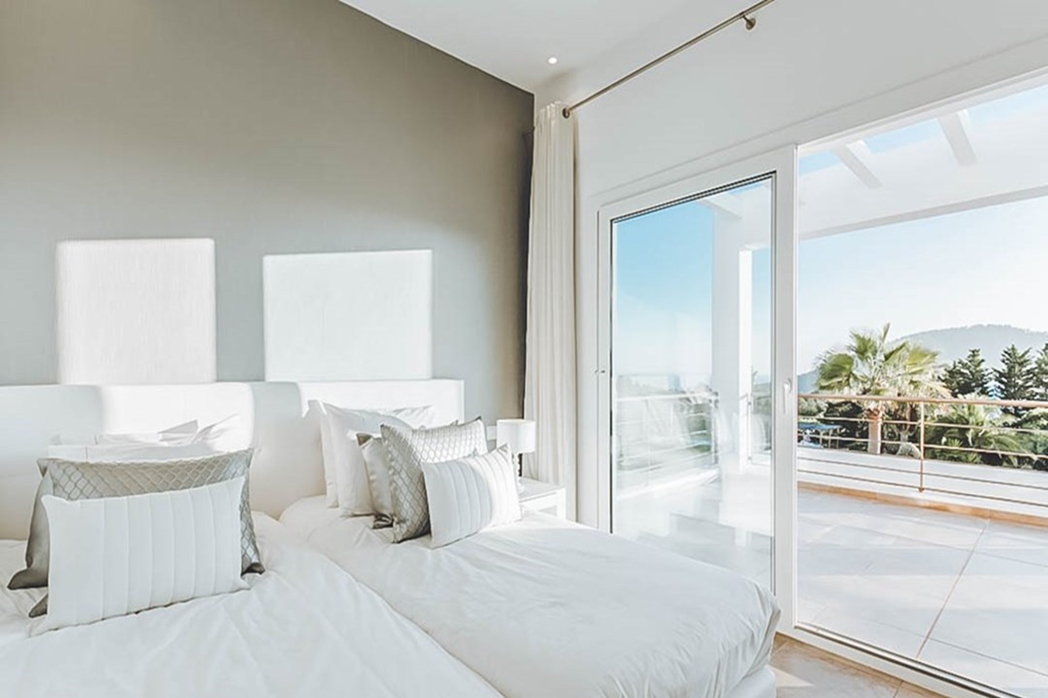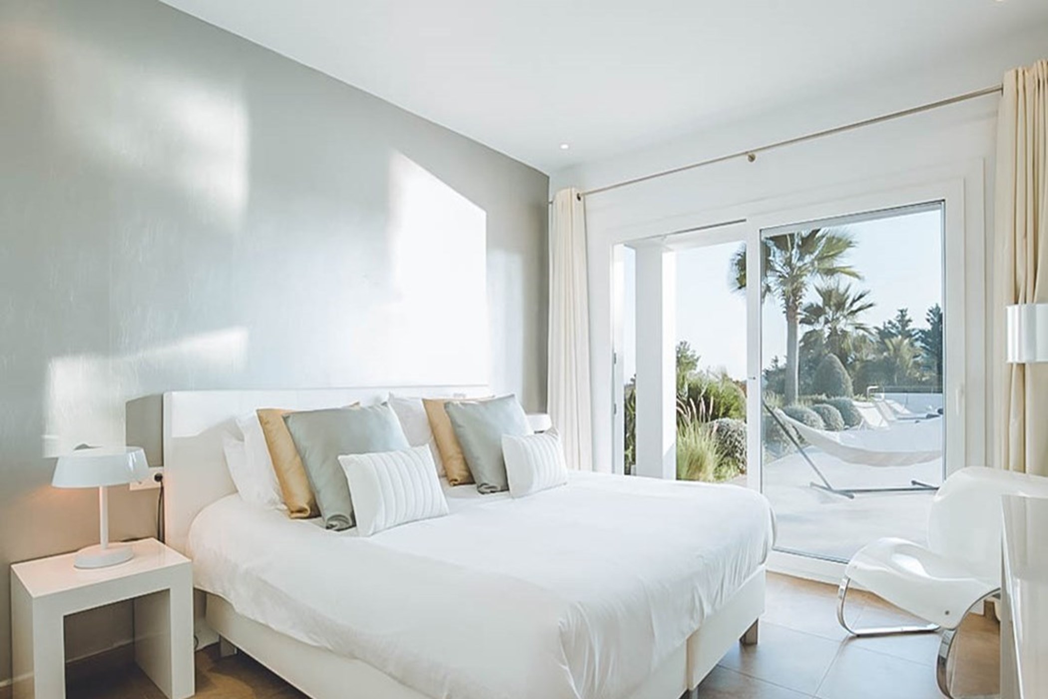 Upon entering this modern, minimalist style home, the spacious hall leads into the large and tastefully decorated living room which is flooded with the glorious Ibizan sunlight through floor to ceiling sliding glass doors which emphasis the full effect of the unrivaled sea views. Careful attention has been paid to every detail for your comfort and luxury and tasteful decoration abounds throughout every part of this sophisticated villa.