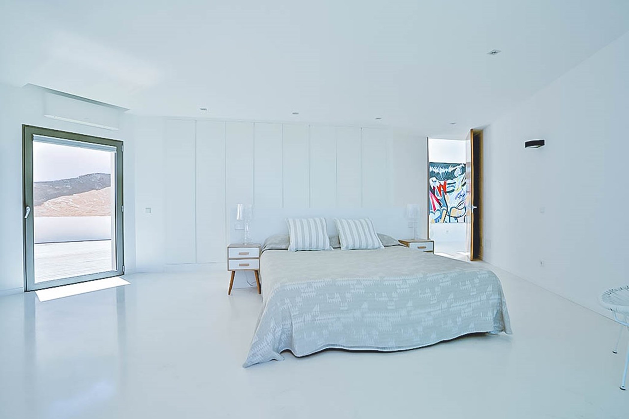 Inside, the villa is a study in modern sophistication. The polished white stone floors flow seamlessly throughout, creating a sense of openness and calm. The interiors are tastefully designed with a chic, contemporary style that combines neutral tones, sleek lines, and bespoke artwork. The expansive, light-filled kitchen is a true chef’s dream, equipped with state-of-the-art appliances and a stylish dining area that comfortably accommodates up to ten guests. From here, large sliding glass doors open to an elegant outdoor deck, inviting the natural beauty of the surrounding landscape into the home.