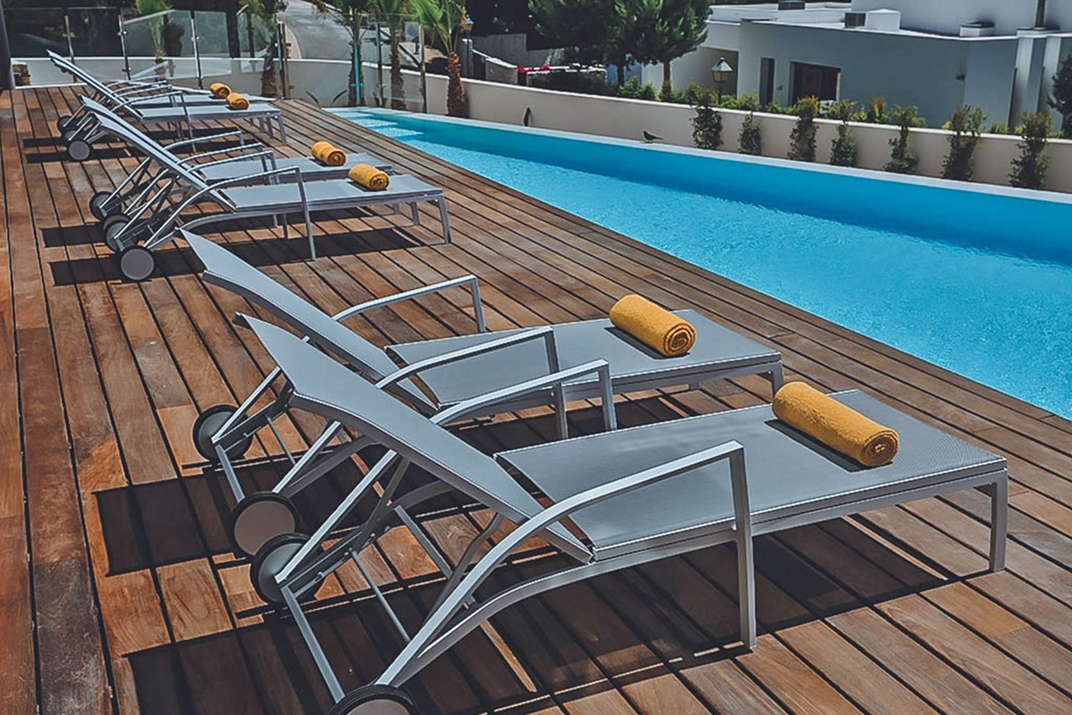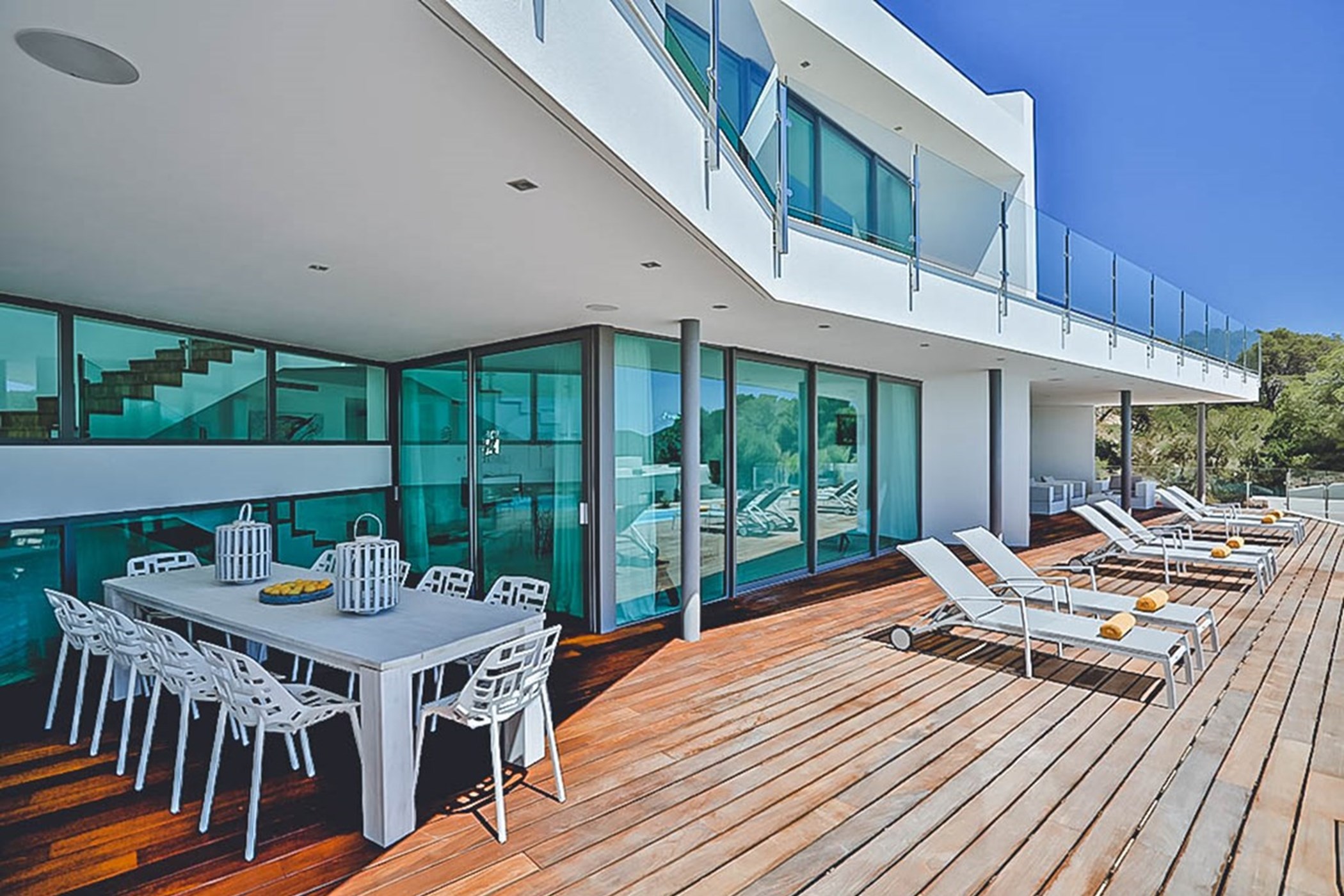 The exterior of the villa is equally impressive, designed to create a seamless transition from the indoor spaces to the outdoors. The south-facing pool is the focal point of the expansive outdoor area, inviting guests to enjoy the year-round sunshine and stunning surroundings. The beautifully landscaped terraces offer both shaded lounge areas and sun-soaked spaces, ideal for relaxing, dining, or entertaining in complete comfort. The spacious hardwood deck, which spans the full width of the property, is perfect for lounging, enjoying the views, or hosting guests.