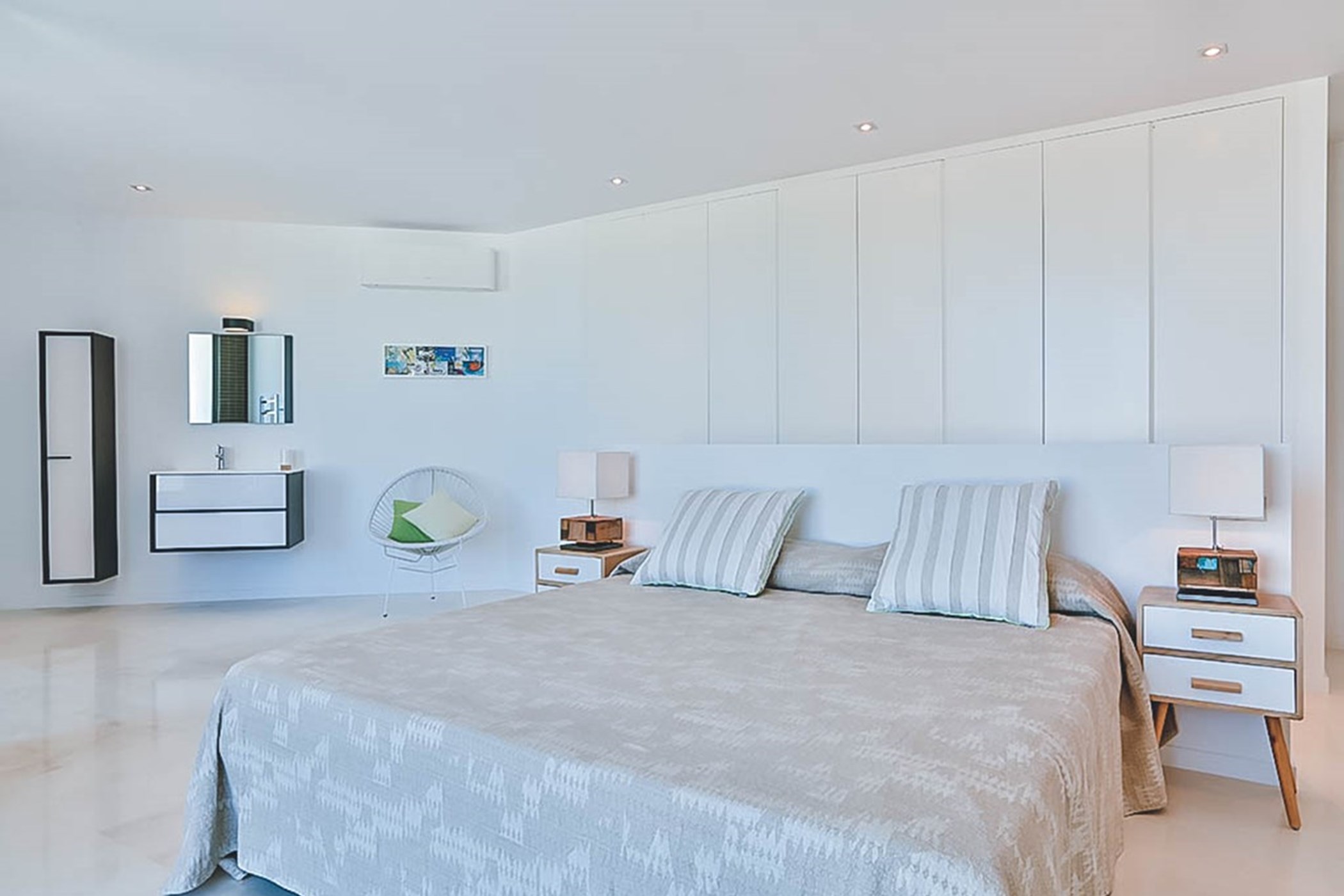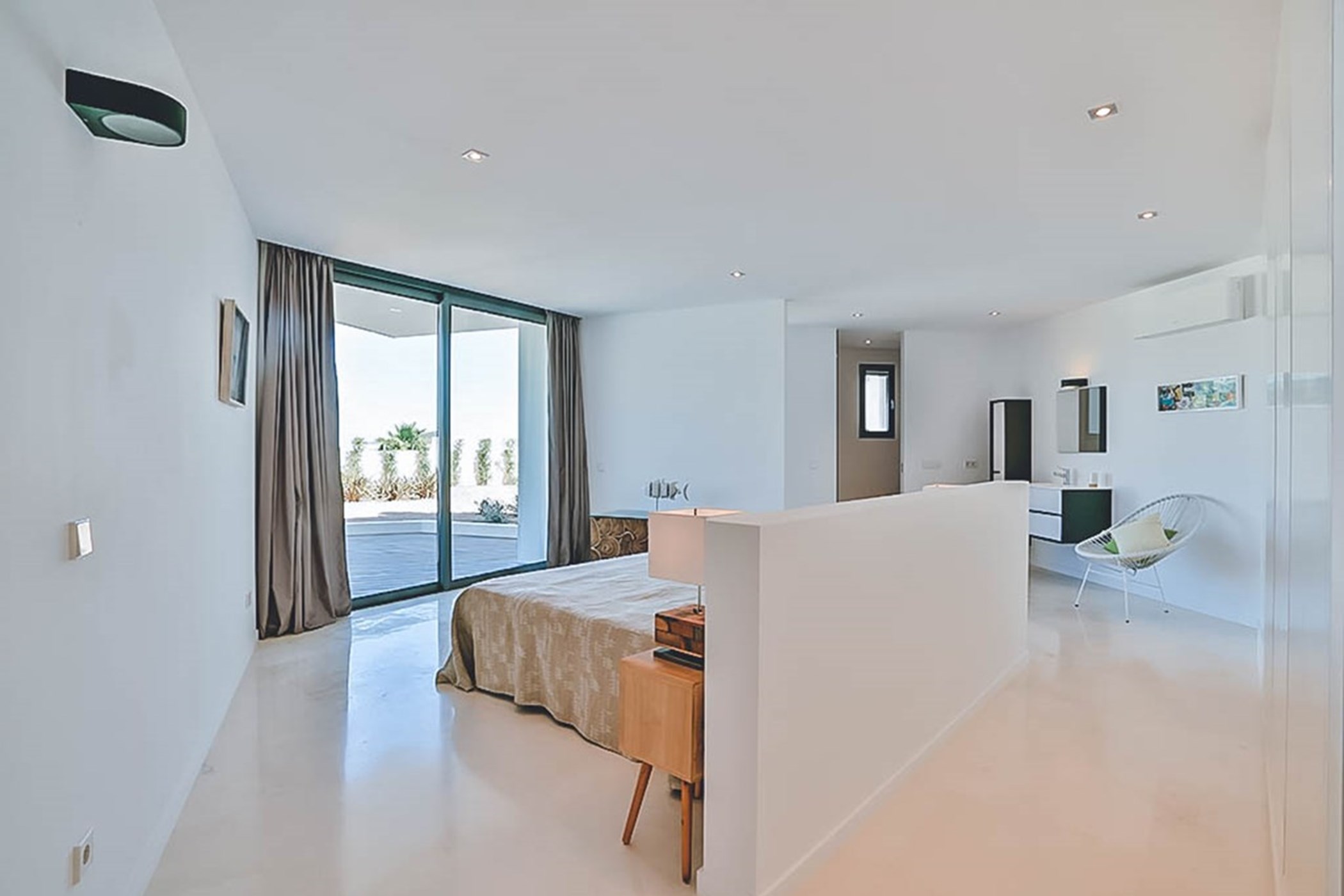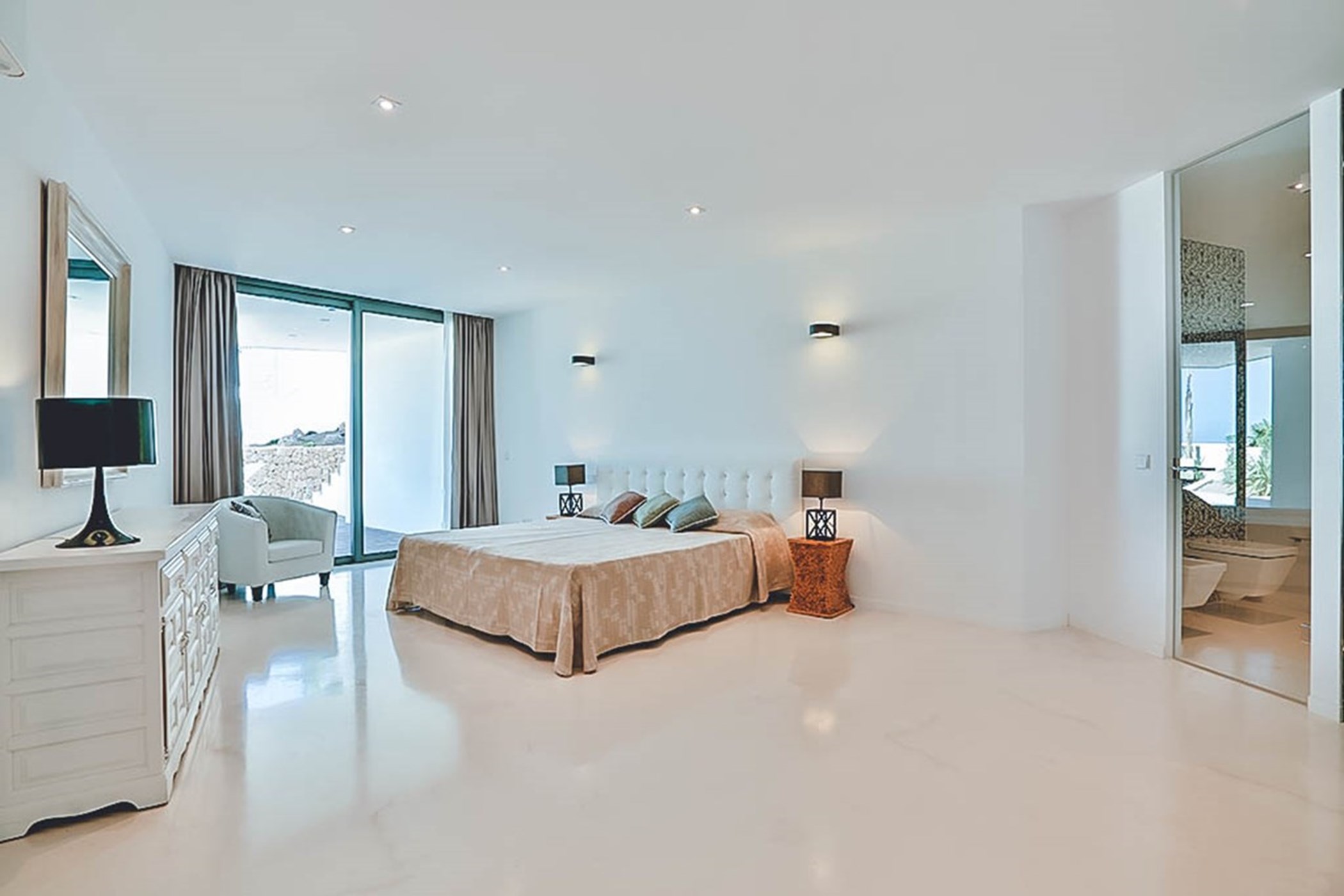 The villa’s thoughtful design ensures that each space is both functional and luxurious. The master suite occupies the entire top floor, offering the ultimate in privacy and comfort. This spacious retreat features a private terrace that provides panoramic sea views, stretching all the way to Formentera, making it the perfect spot to watch the sun set over the horizon. The room is designed with meticulous attention to detail, offering a sanctuary of relaxation. Each of the other four bedrooms is equally opulent, complete with its own en-suite bathroom, offering guests the utmost comfort, privacy, and tranquility.